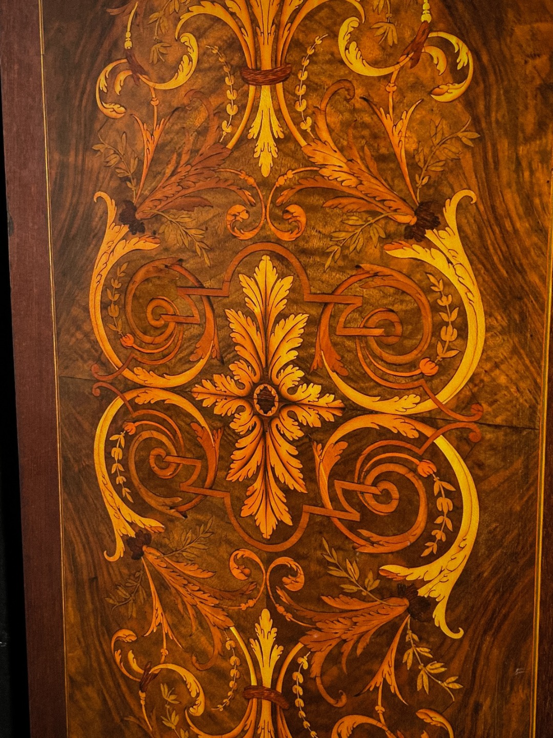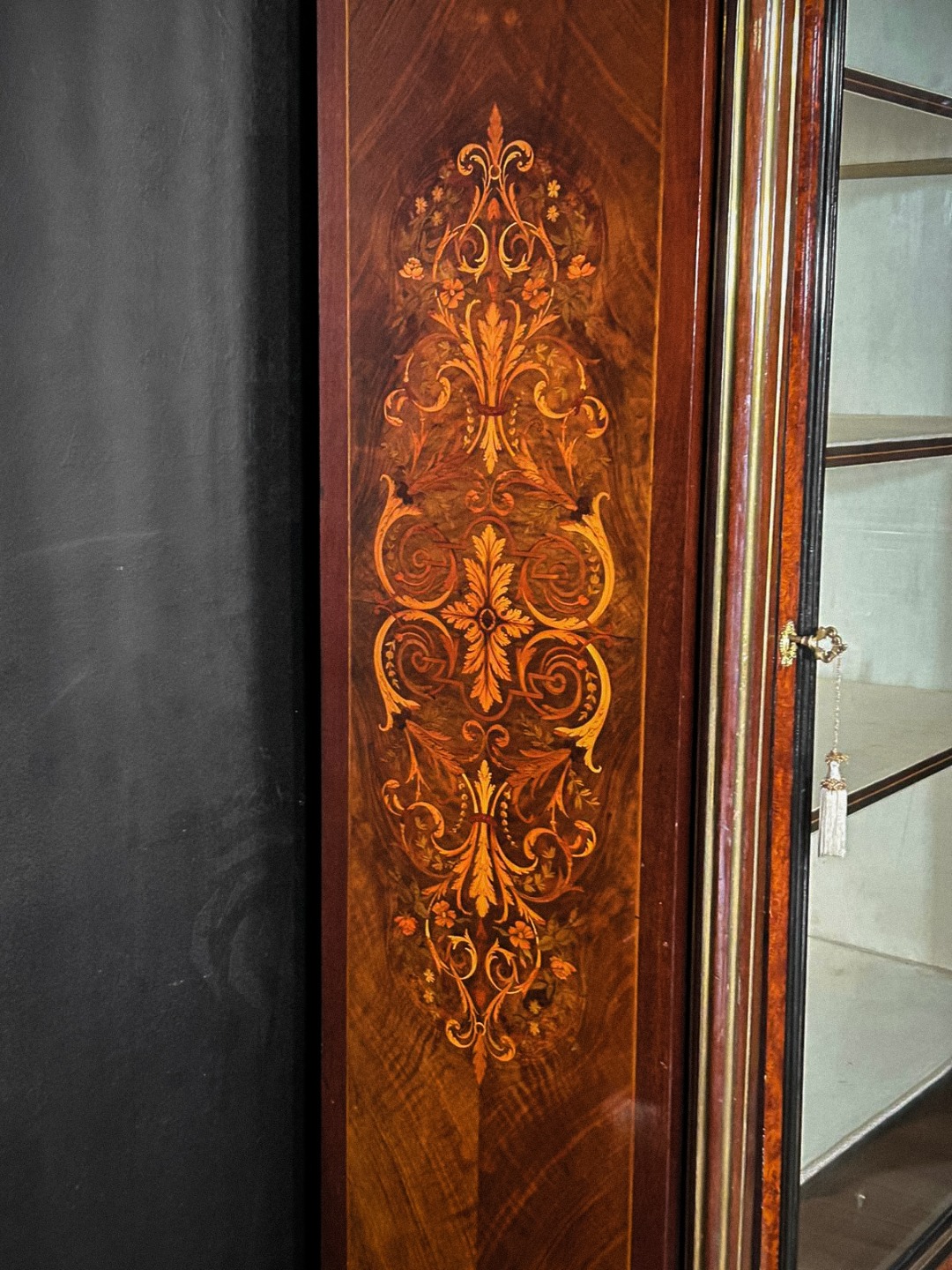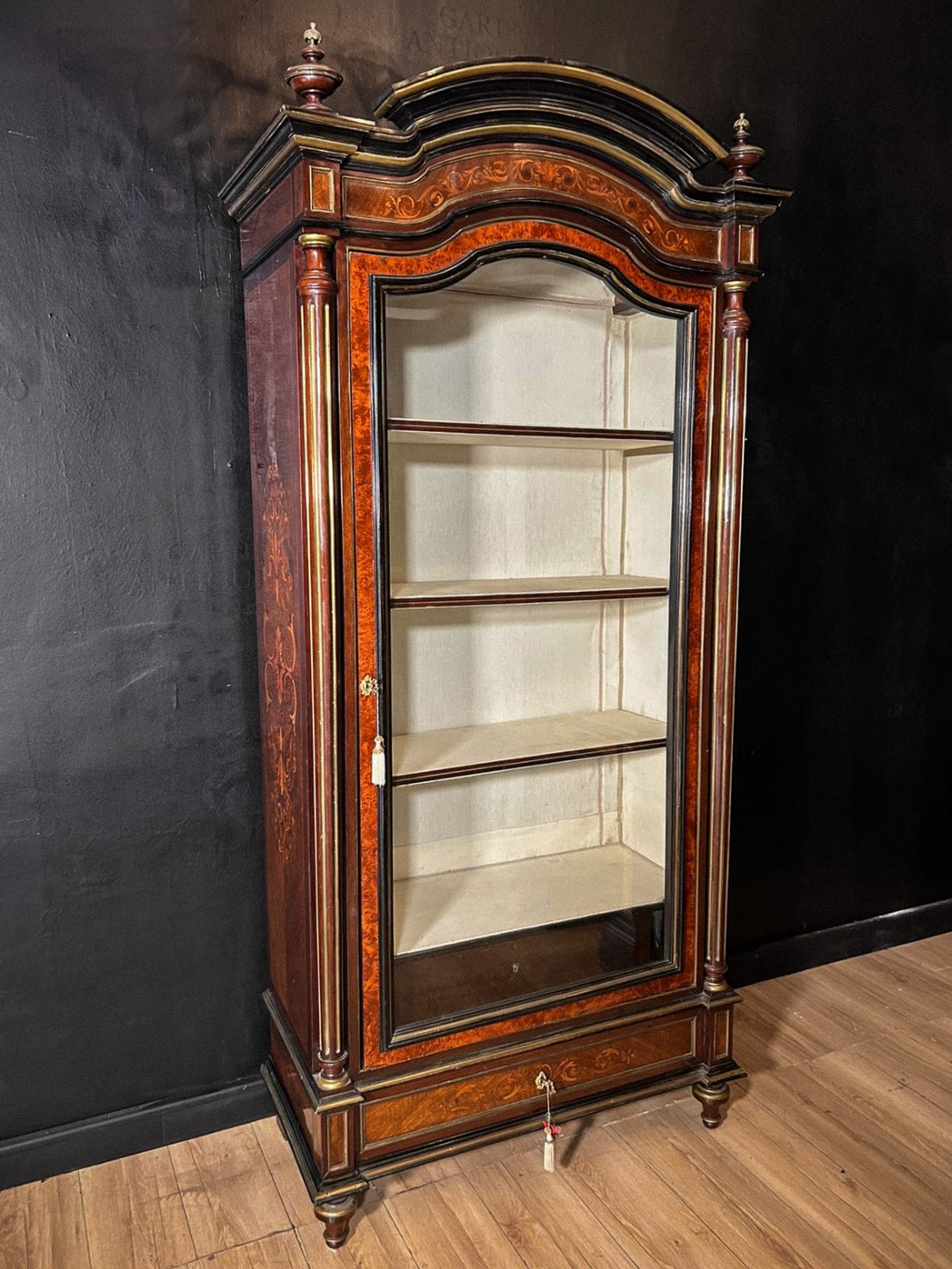 Ai lati si sviluppano colonne tornite con dettagli dorati, mentre i fianchi sono decorati da eleganti motivi intarsiati di gusto ornamentale. L’interno, realizzato in legno di rovere, è suddiviso da ripiani regolabili ed è rifinito con rivestimento chiaro che valorizza l’esposizione degli oggetti. Nella parte inferiore sono presenti un cassetto interno e un vano nel basamento, entrambi con serratura.