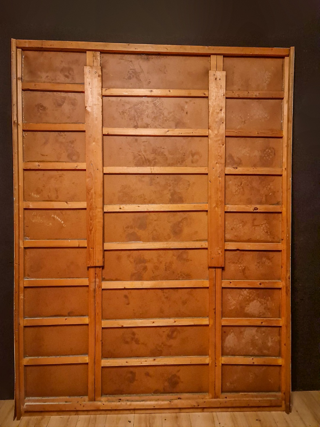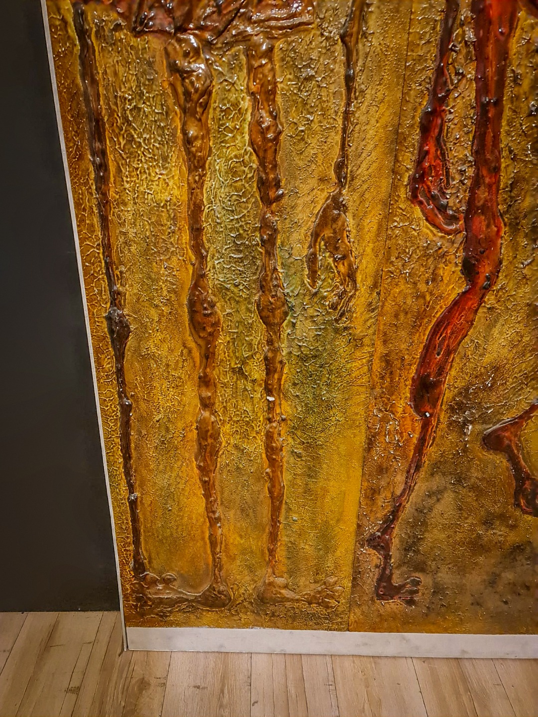 La cromia è dominata da toni caldi e terrosi – ocra, ambra, rosso bruciato e marrone – che richiamano la terra, il fuoco e l’arte primitiva, creando un’atmosfera arcaica e sacrale. Il retro mostra una struttura lignea robusta, tipica delle opere di grandi dimensioni destinate a spazi importanti.
