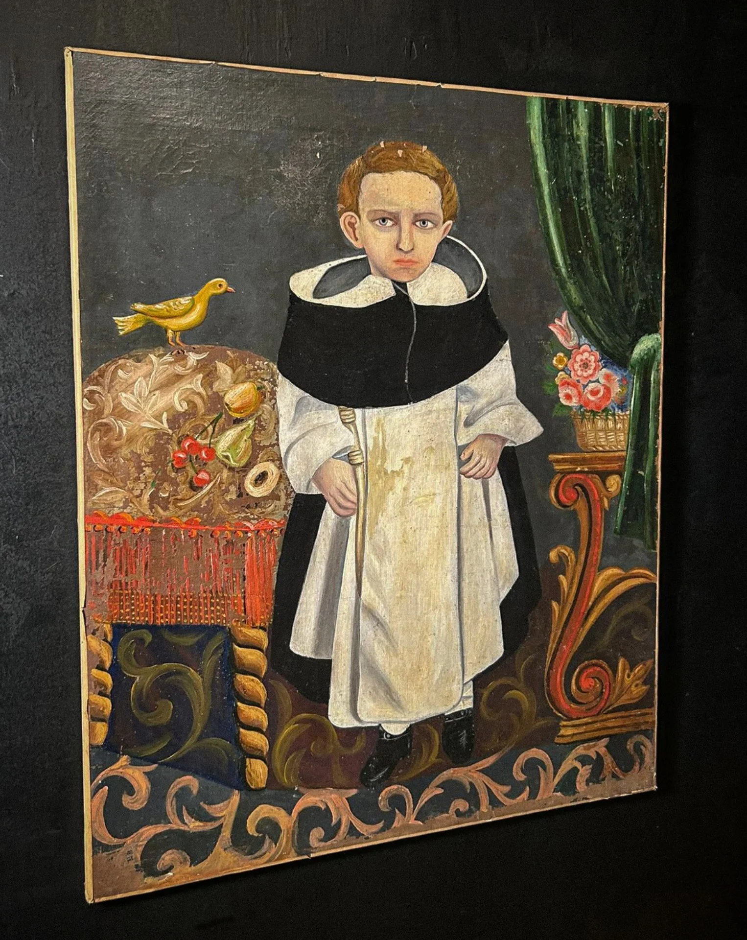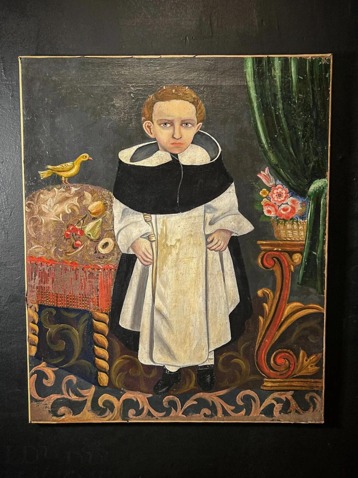 Interessante dipinto ad olio su tela risalente al XIX secolo, raffigurante un giovane monaco, probabilmente appartenente all’Ordine dei Predicatori (Domenicani), riconoscibile dall’abito bianco con mantello nero. L’opera è eseguita in stile naif o popolare, con una composizione semplice ma arricchita da elementi simbolici e decorativi.