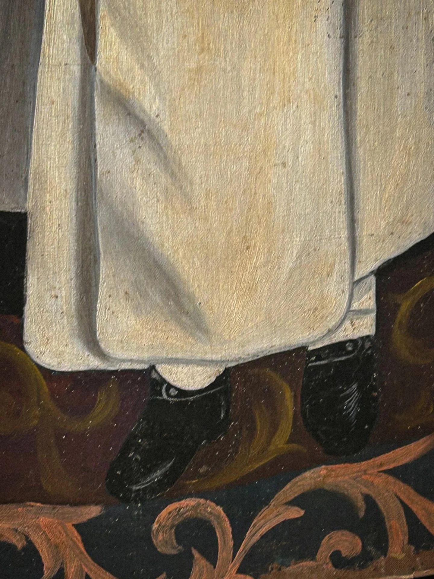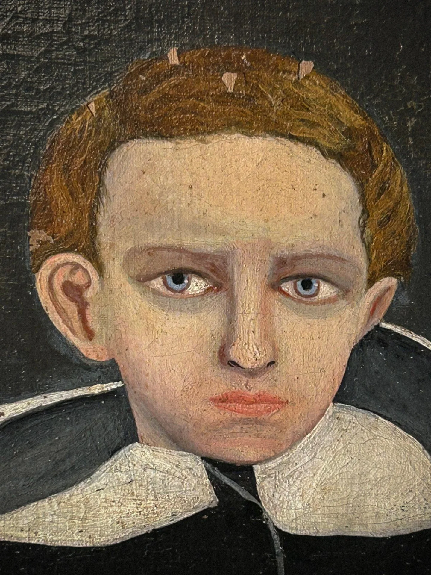 La pittura evidenzia una resa stilizzata dei tratti somatici e delle proporzioni, tipica della produzione popolare devozionale dell’Ottocento. Opera di particolare fascino, ideale per collezionisti di arte sacra e dipinti antichi di ambito provinciale.