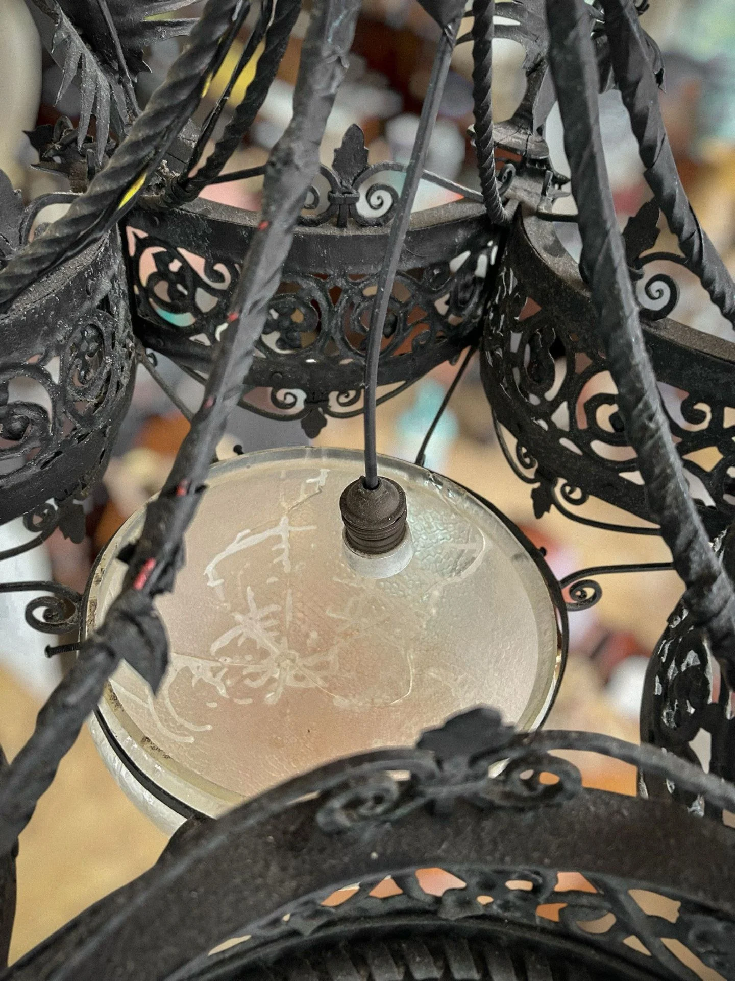 Suggestivo lampadario antico in ferro battuto, risalente alla fine del XIX secolo – inizi del XX secolo, caratterizzato da grande fascino ed eleganza decorativa.