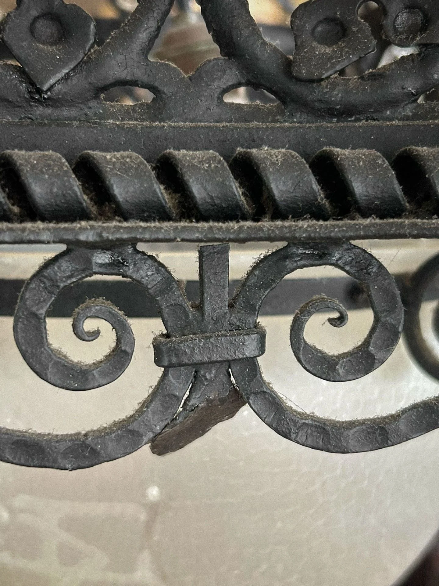 Particolarmente distintivi sono gli elementi ornamentali superiori con figure di uccelli stilizzati in ferro battuto, che conferiscono movimento e unicità alla composizione, esaltando la maestria artigianale dell’epoca. La parte inferiore è impreziosita da anelli pendenti e riccioli decorativi che completano l’insieme con armonia.
