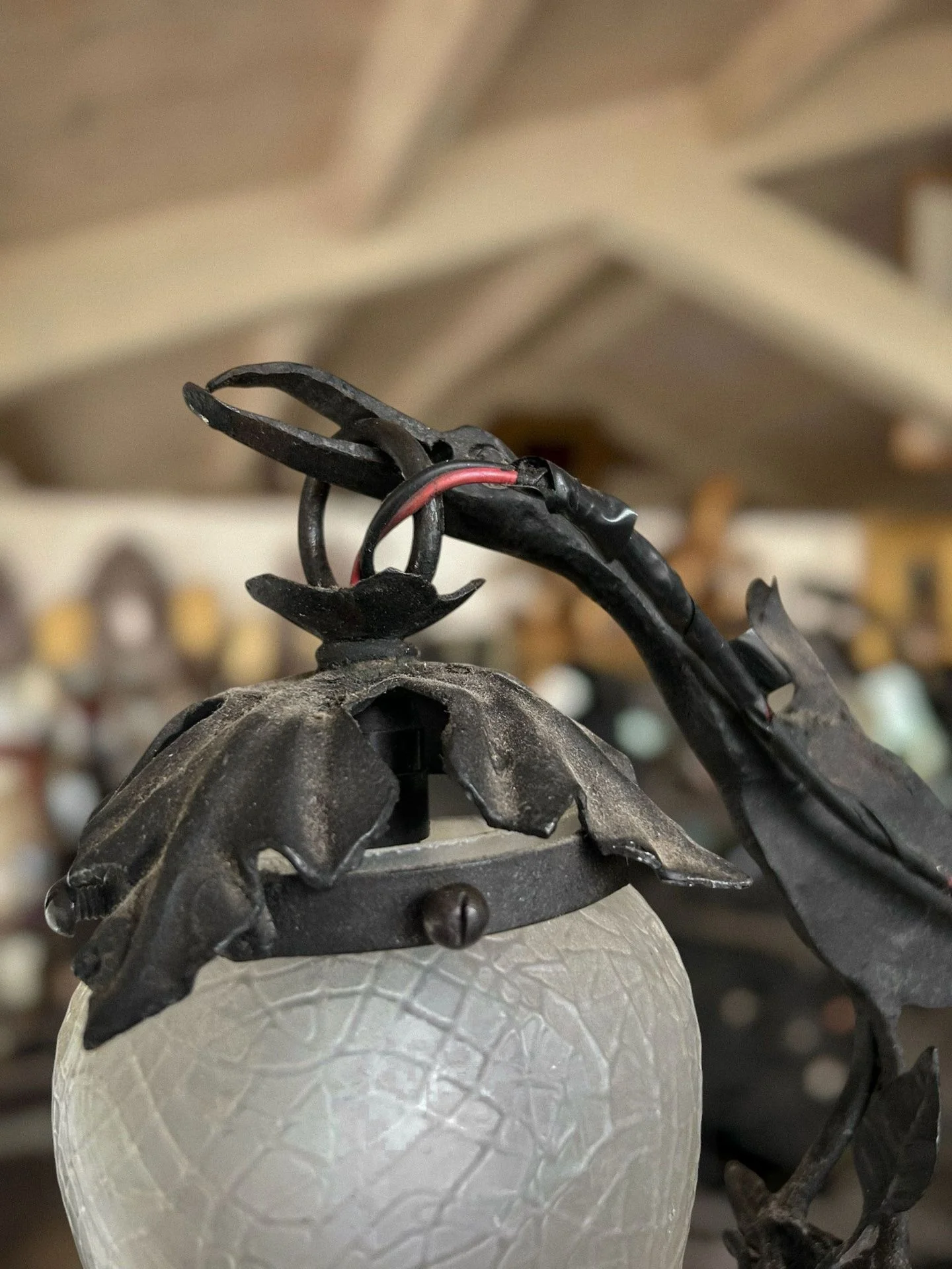 Lampadario Antico in Ferro Battuto con Elementi Zoomorfi