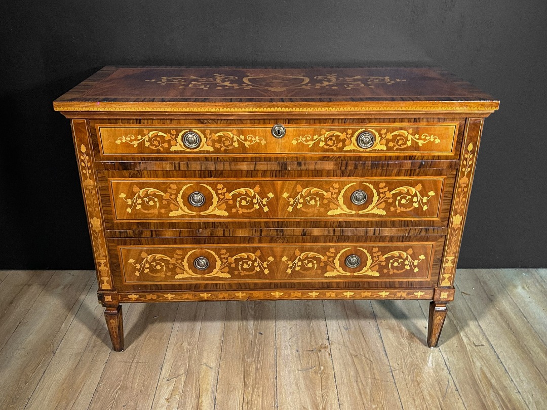 Il fronte è composto da tre ampi cassetti, ciascuno impreziosito da elaborati intarsi floreali e motivi a girali realizzati con essenze lignee di diverse tonalità, che creano un raffinato contrasto cromatico. Le bocchette e i pomoli in metallo completano armoniosamente l’estetica del mobile.