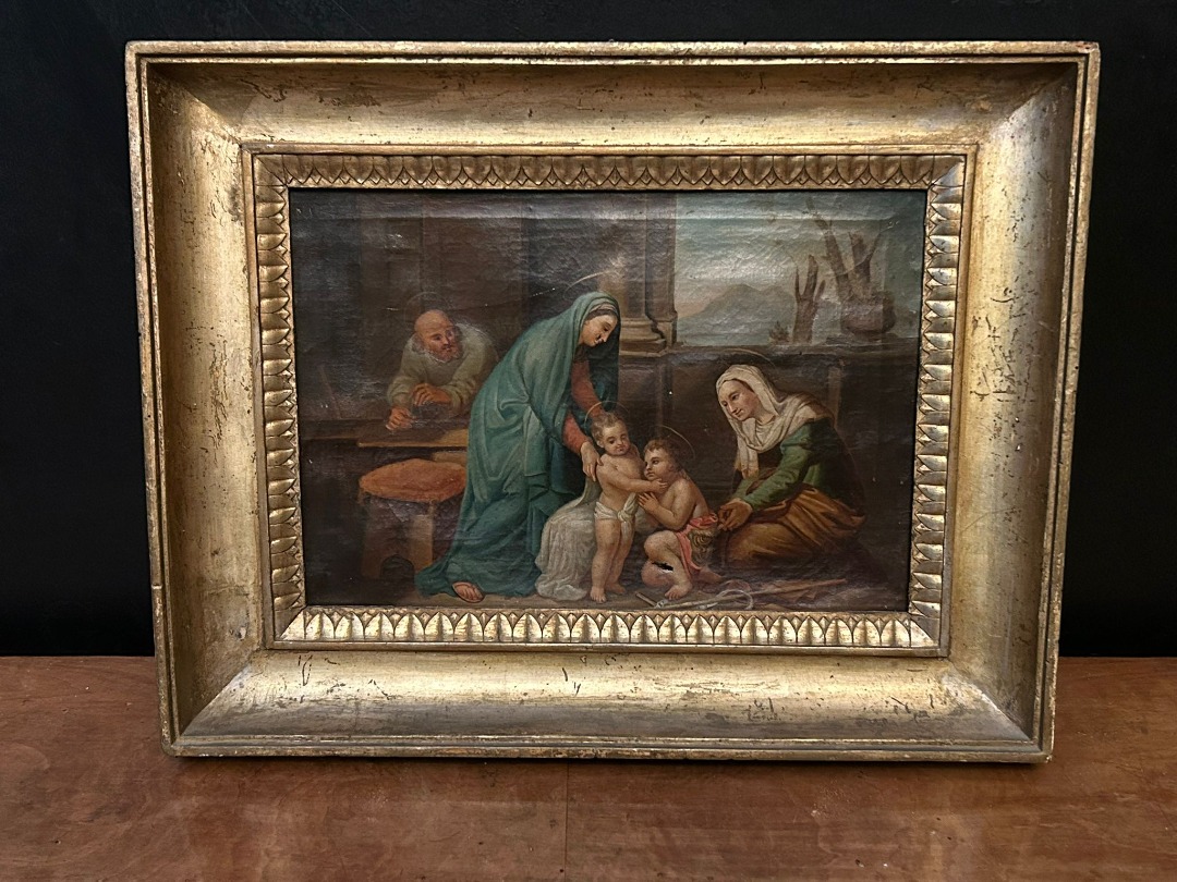 Interessante dipinto a olio su tela raffigurante una scena religiosa tradizionale, probabilmente la Sacra Famiglia con Sant’Anna e San Giovannino, riconducibile a produzione artistica compresa tra il XVII e il XIX secolo.