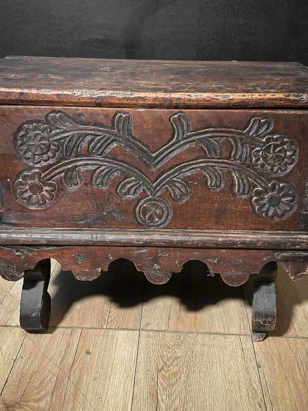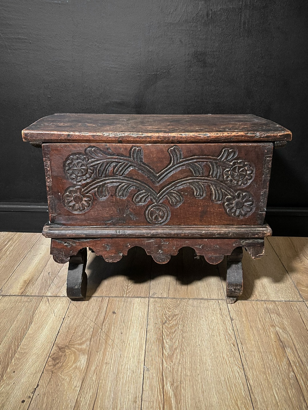Antique 17th-century chest crafted from solid walnut, featuring a compact and sturdy structure, typical of 17th-century production. The front is embellished with hand-carved relief decorations featuring stylized floral motifs and symmetrical scrolls, executed with understated and well-proportioned taste. The hinged top lid opens to reveal a spacious interior, finished in natural wood, with evident signs of wear consistent with its age. The base rests on contoured lateral feet that lend stability and character to the piece. The surfaces feature an authentic antique patina, with signs of wear and tear that attest to its originality and historical value. A highly charming object, ideal as a container, chest, or decorative element in classical settings and antique collections.