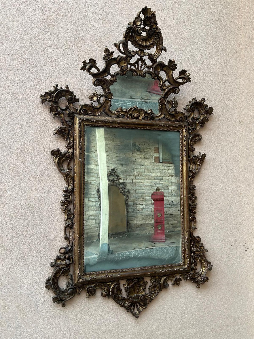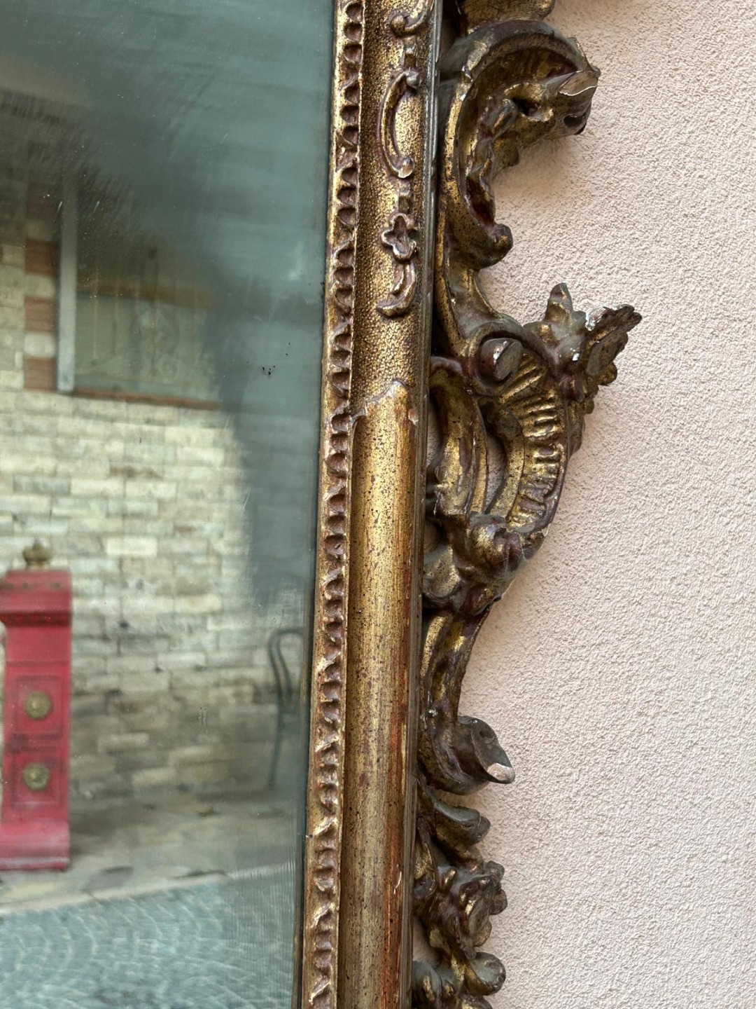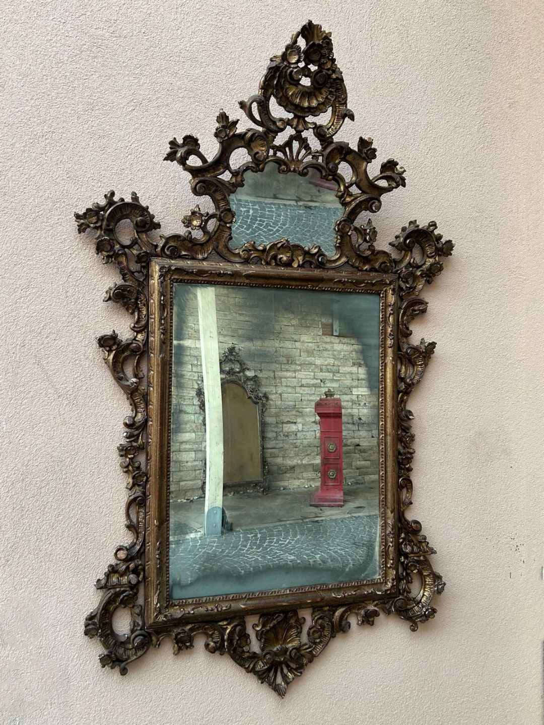 Magnifica specchiera veneziana di fine ’800, realizzata in legno finemente intagliato e dorato a foglia oro. La cornice presenta una ricca decorazione a volute, conchiglie e motivi floreali, culminante in un cimiero traforato di grande eleganza. Lo specchio originale conserva una leggera patina del tempo che ne valorizza l’autenticità.