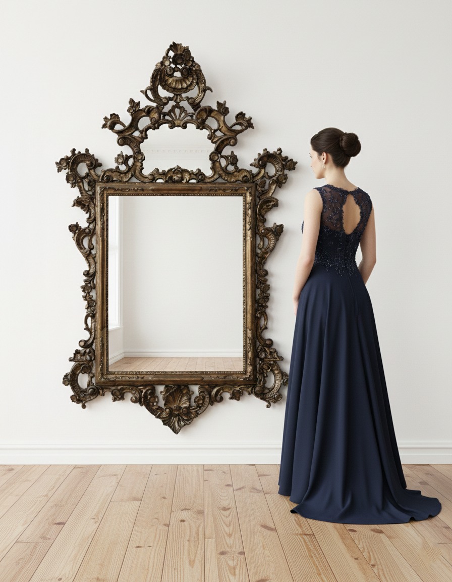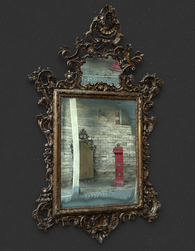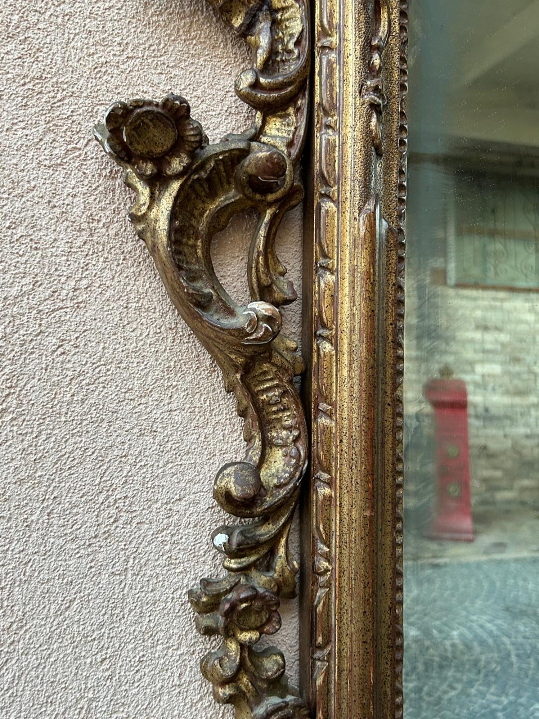 Magnifica specchiera veneziana di fine ’800, realizzata in legno finemente intagliato e dorato a foglia oro. La cornice presenta una ricca decorazione a volute, conchiglie e motivi floreali, culminante in un cimiero traforato di grande eleganza. Lo specchio originale conserva una leggera patina del tempo che ne valorizza l’autenticità.