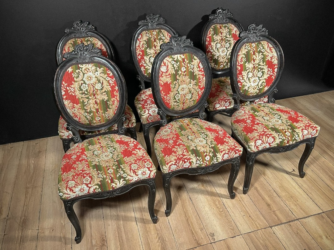 Importante set di sedie Luigi Filippo napoletane, risalenti alla metà dell’Ottocento, realizzate in legno di noce finemente ebanizzato. Le sedie presentano schienale ovale imbottito, incorniciato da una struttura sagomata e arricchita da intagli superiori con motivi floreali e volute. La fascia sottosedile è elegantemente mossa e decorata con intagli delicati, mentre le gambe anteriori sono leggermente arcuate secondo il gusto tipico del periodo. Il rivestimento in tessuto damascato nei toni del rosso e verde con motivi floreali valorizza l’insieme, donando carattere e raffinatezza. Un set di grande eleganza, ideale per sale da pranzo, salotti o ambienti di rappresentanza in stile classico.