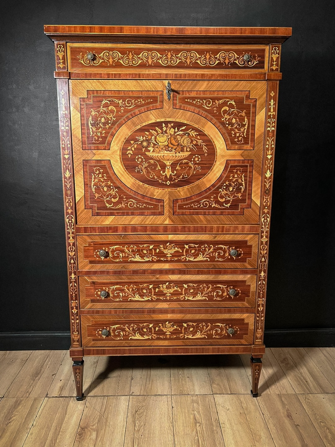 Elegante secrétaire in stile Luigi XVI, finemente lastronato e interamente intarsiato, realizzato con grande maestria artigianale. Il fronte è caratterizzato da un’importante decorazione a marqueterie con motivi floreali, girali e vaso centrale con composizione di fiori racchiusa in medaglione ovale, eseguita con essenze lignee pregiate dai caldi toni contrastanti.