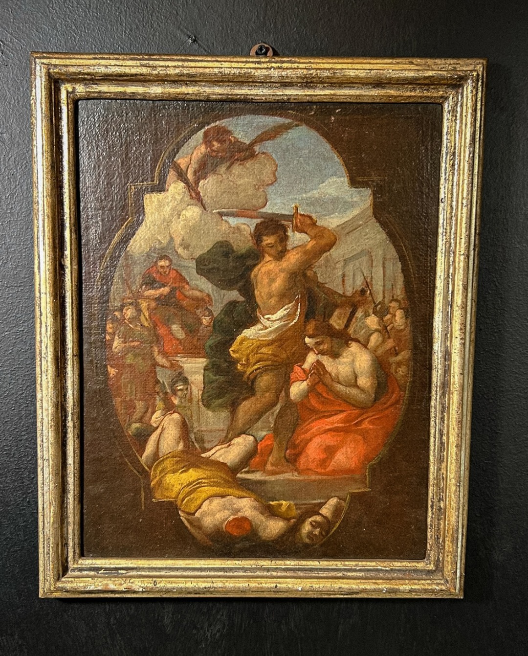 La cromia è calda e intensa, con prevalenza di rossi, ocra e verdi profondi, mentre il contrasto chiaroscurale conferisce profondità e drammaticità all’insieme. La superficie pittorica presenta una naturale patina del tempo e leggere craquelure coerenti con l’epoca dell’opera.