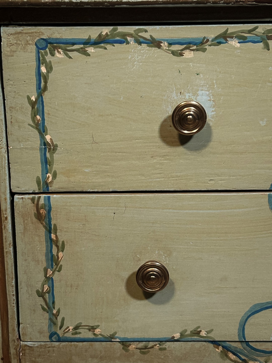 Il mobile si compone di una base con due ampi cassetti e di un’alzata a due ante vetrate con piccoli riquadri, che conferiscono grande leggerezza visiva all’insieme. Le superfici sono impreziosite da delicati motivi floreali, festoni e un grande vaso centrale dipinto, tipici del gusto neoclassico e della tradizione decorativa toscana.