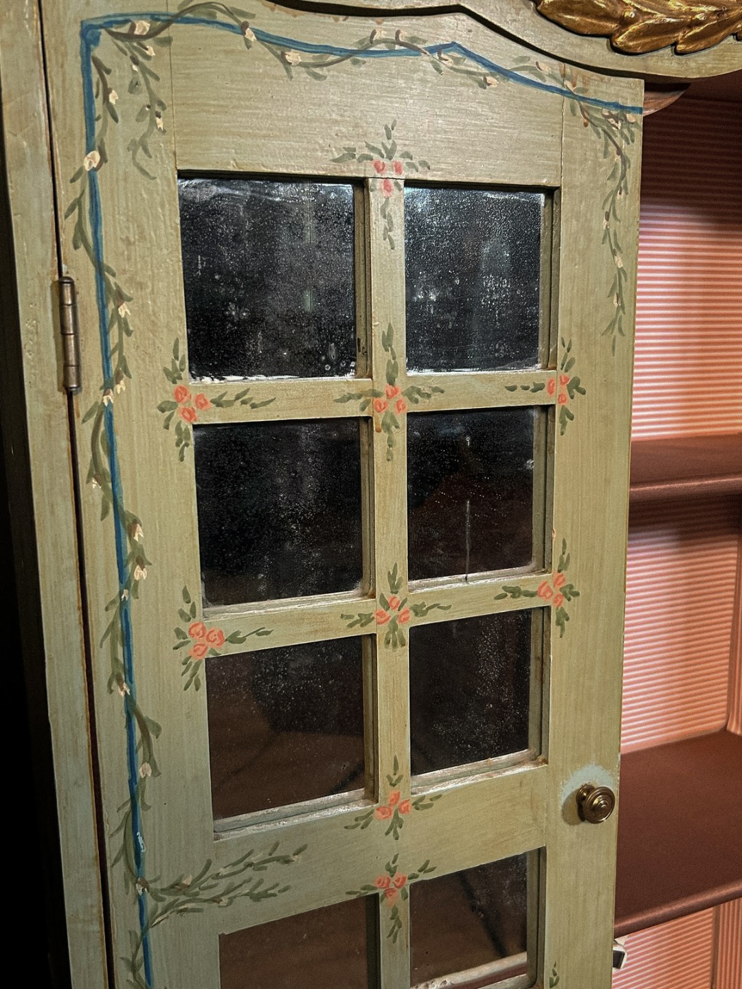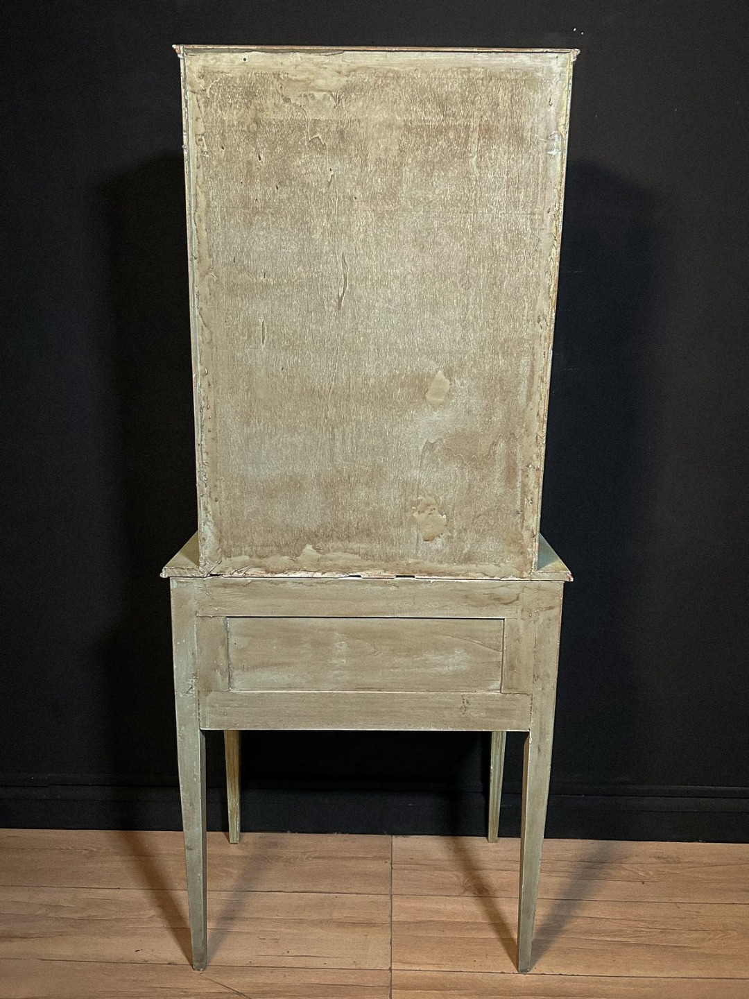 Le gambe sono snelle e scanalate, con linea slanciata ed elegante, mentre la cornice superiore è arricchita da fregi dorati intagliati. L’interno dell’alzata è rivestito in tessuto rigato, elemento originale che dona ulteriore pregio e ricercatezza al mobile.