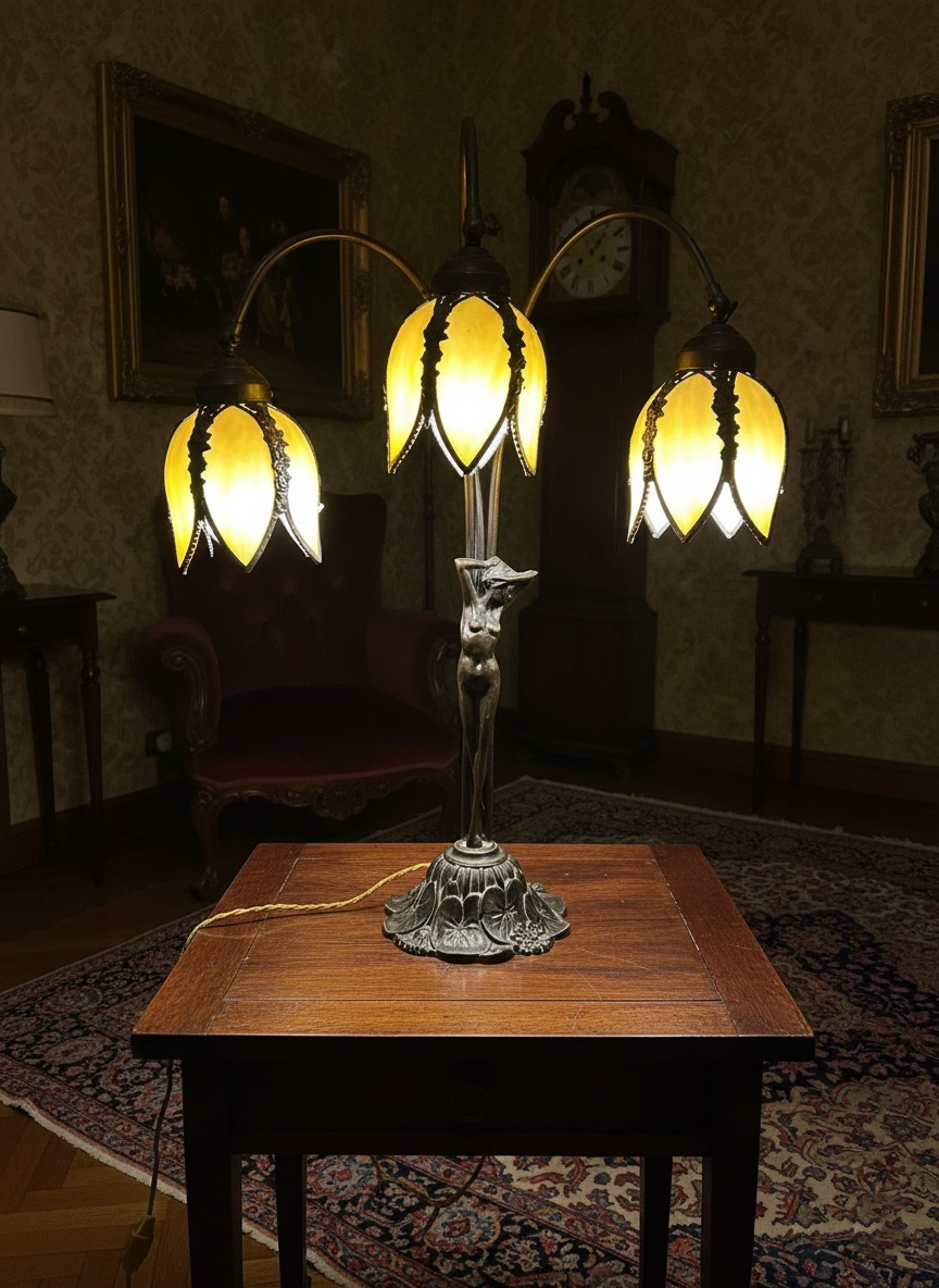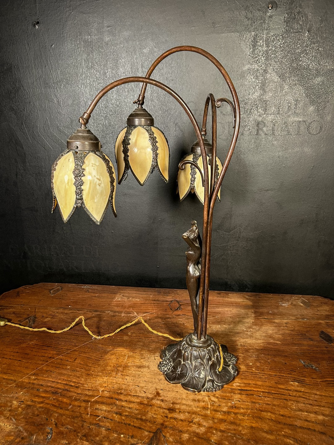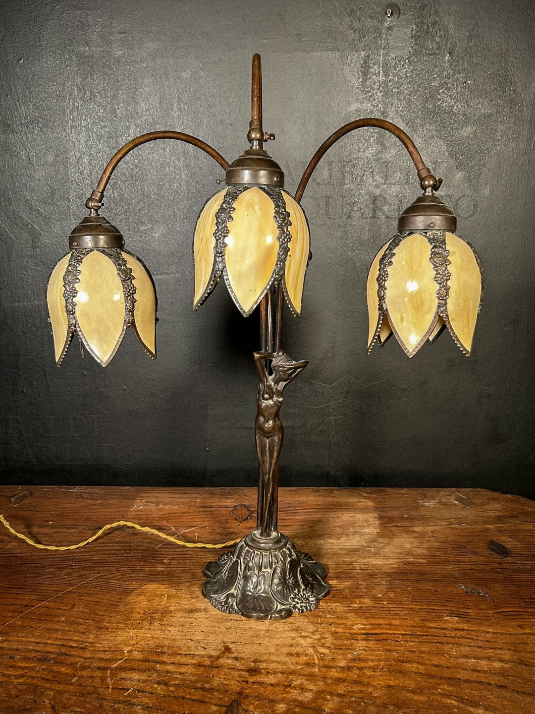 Elegante lampada da tavolo di epoca Liberty – Déco, caratterizzata da una raffinata struttura in bronzo finemente lavorato. Il fusto centrale presenta una figura femminile stilizzata che sostiene i bracci luminosi, elemento decorativo tipico del gusto Liberty, ispirato a linee sinuose e motivi naturali. La lampada è dotata di tre punti luce, ciascuno completato da paralumi a forma di foglia realizzati in onice naturale, materiale pregiato che diffonde una luce calda e avvolgente. I supporti delle foglie sono arricchiti da dettagli floreali in rilievo in metallo, coerenti con lo stile dell’epoca. La base, ampia e sagomata, garantisce stabilità ed è anch’essa decorata con motivi naturalistici. L’oggetto si presenta funzionante e di grande impatto scenografico, ideale per arricchire ambienti classici o collezioni di illuminazione d’epoca.