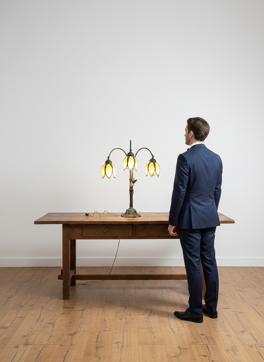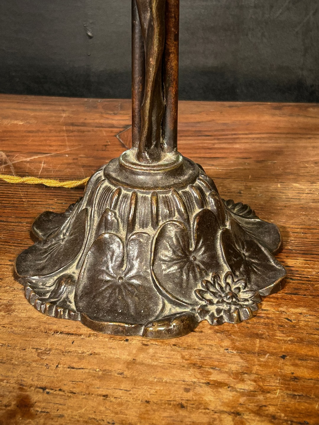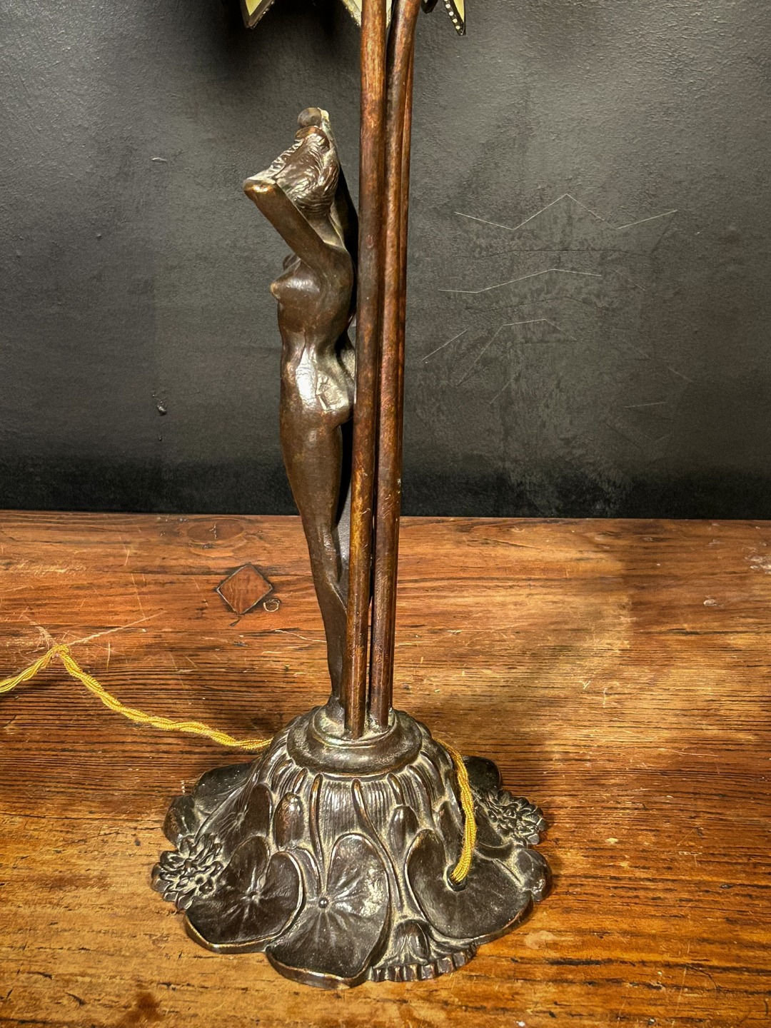 Elegante lampada da tavolo di epoca Liberty – Déco, caratterizzata da una raffinata struttura in bronzo finemente lavorato. Il fusto centrale presenta una figura femminile stilizzata che sostiene i bracci luminosi, elemento decorativo tipico del gusto Liberty, ispirato a linee sinuose e motivi naturali. La lampada è dotata di tre punti luce, ciascuno completato da paralumi a forma di foglia realizzati in onice naturale, materiale pregiato che diffonde una luce calda e avvolgente. I supporti delle foglie sono arricchiti da dettagli floreali in rilievo in metallo, coerenti con lo stile dell’epoca. La base, ampia e sagomata, garantisce stabilità ed è anch’essa decorata con motivi naturalistici. L’oggetto si presenta funzionante e di grande impatto scenografico, ideale per arricchire ambienti classici o collezioni di illuminazione d’epoca.