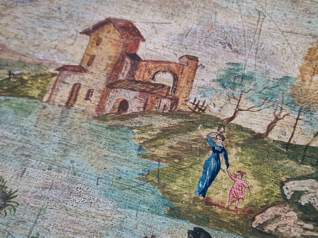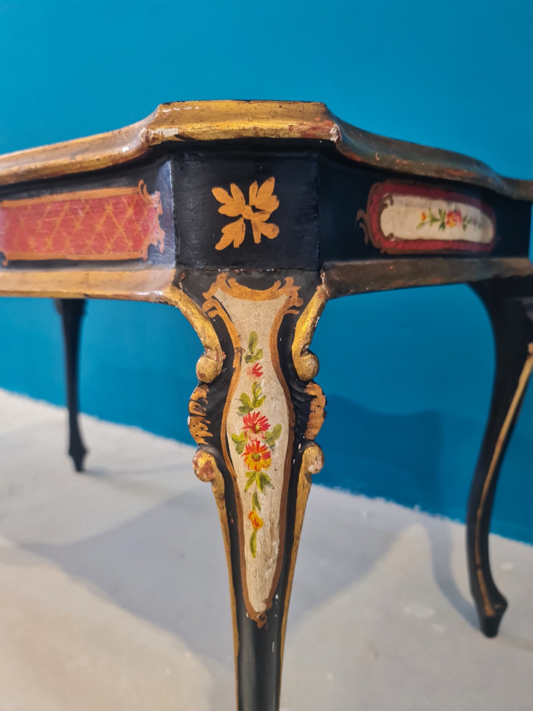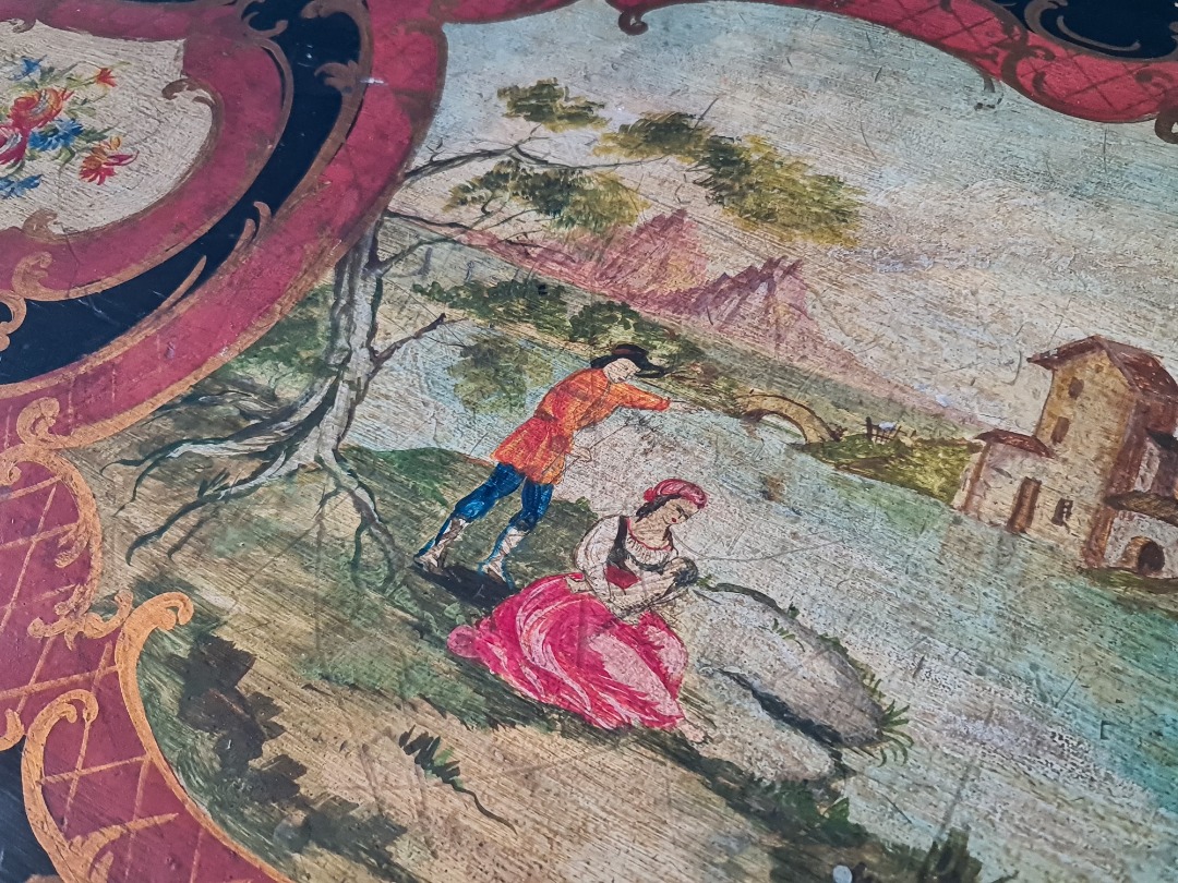 La fascia sottopiano è impreziosita da pannelli dipinti e filettature dorate, mentre le gambe, anch’esse decorate, sono mosse e slanciate, conferendo al tavolino un’eleganza raffinata e caratteristica dell’artigianato fiorentino dell’epoca. L’opera pittorica, delicata e armoniosa, arricchisce ulteriormente il pezzo rendendolo ideale come tavolino da salotto o da centro in ambienti classici e ricercati.