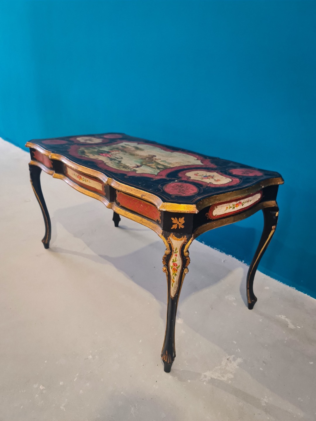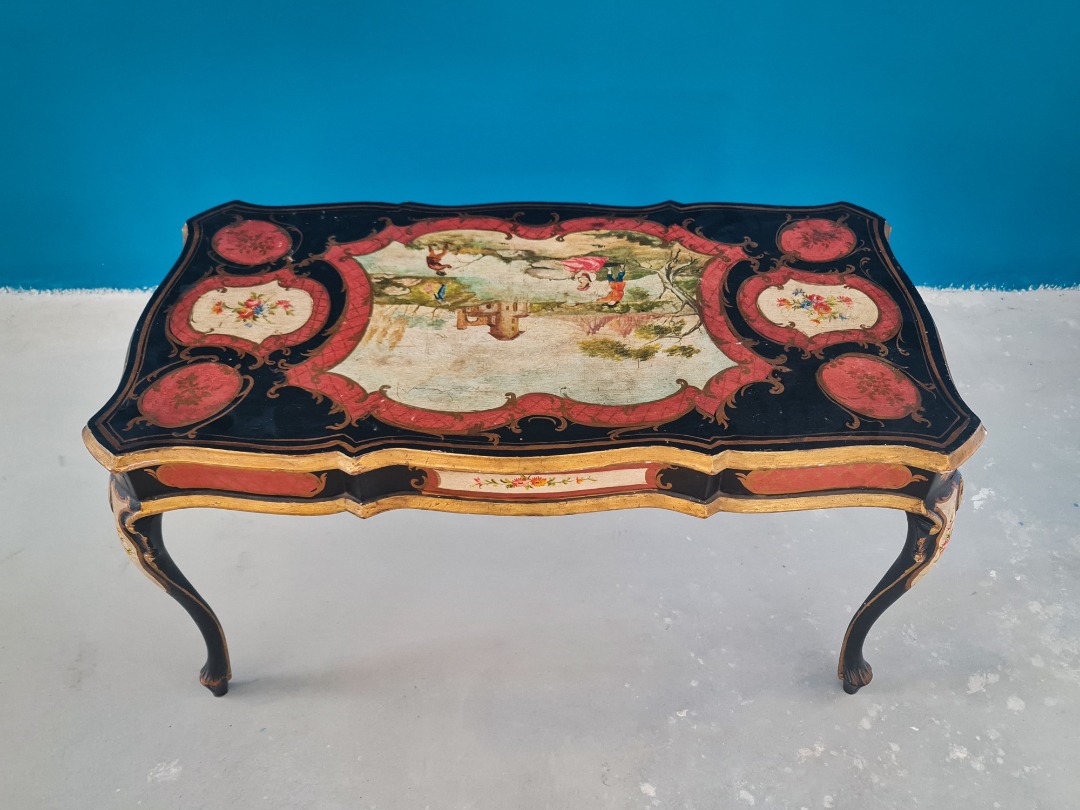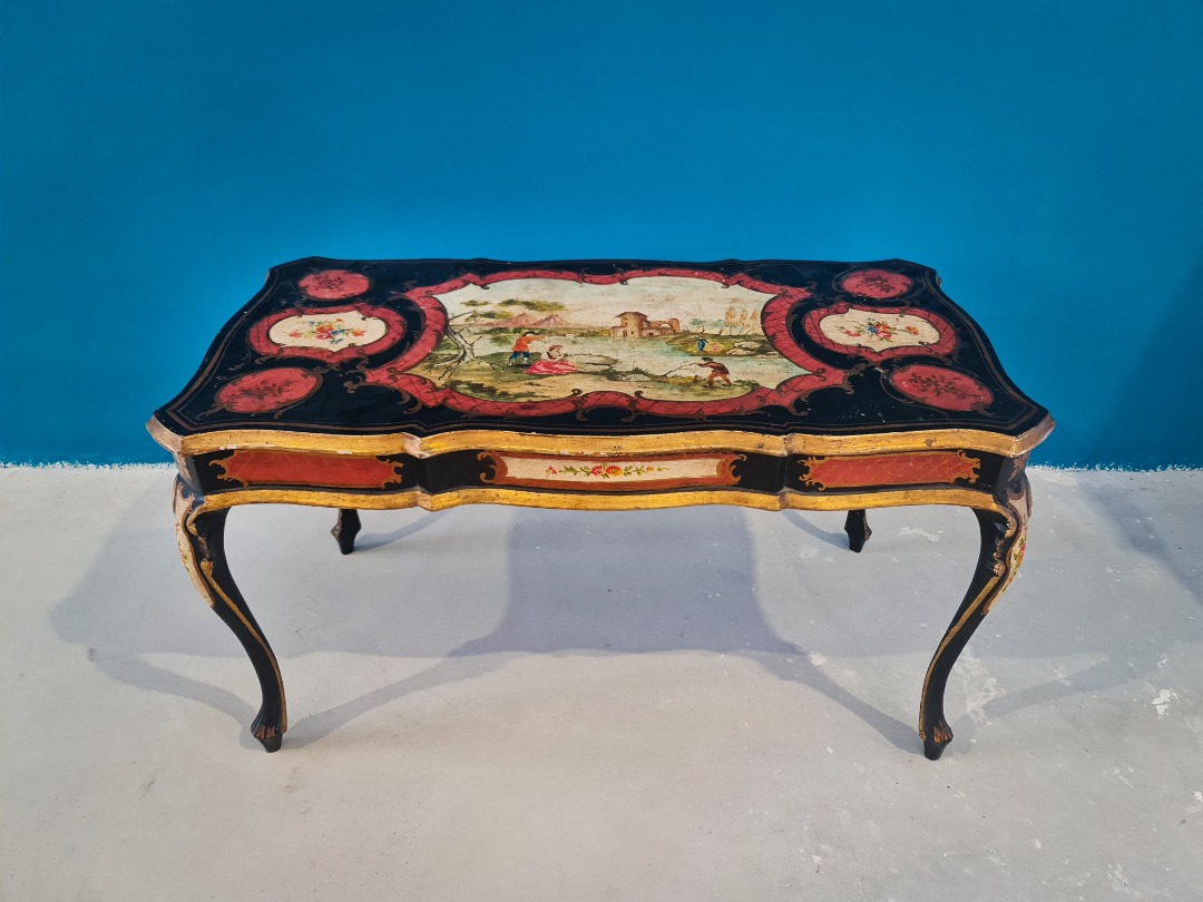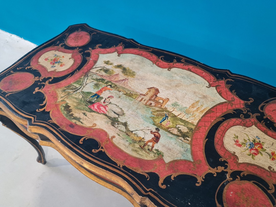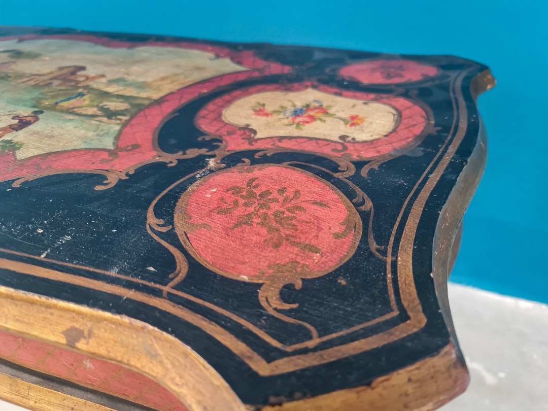 Elegante tavolino fiorentino laccato e finemente dipinto, appartenente alla produzione italiana di fine Ottocento / inizi Novecento. Il mobile presenta una struttura mossa con piano sagomato, interamente decorato a mano con scene figurative centrali raffiguranti paesaggi e personaggi in stile tipicamente settecentesco, incorniciati da motivi floreali e cartigli rossi su fondo nero.
