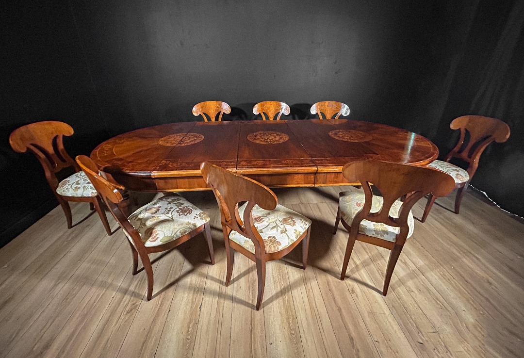 Il set è completato da otto sedie coordinate, anch’esse in noce con delicati intarsi sullo schienale, appartenenti alla medesima epoca inizio ’900.