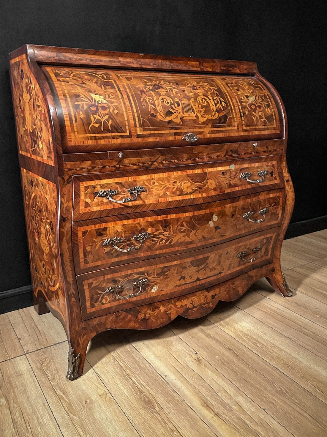La parte inferiore è composta da tre ampi cassetti mossi sul fronte, anch’essi decorati con ricchi intarsi floreali in continuità con la parte superiore, completi di maniglie e bocchette in metallo finemente lavorate. I fianchi bombati e il grembiule sagomato valorizzano ulteriormente la linea sinuosa tipica della produzione olandese.