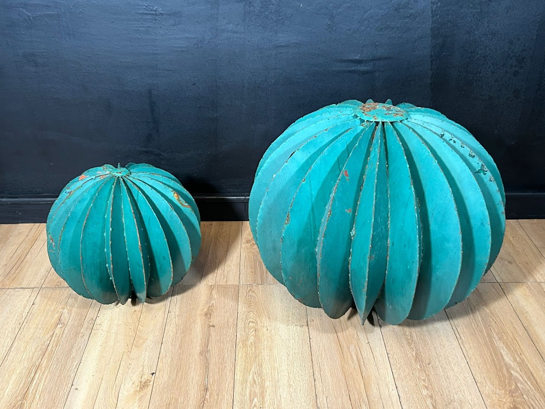 Realizzati interamente in metallo verniciato di colore verde turchese, presentano una superficie con naturale patina del tempo, segni di usura e piccole ossidazioni che ne attestano l’autenticità e il vissuto, donando un affascinante effetto vintage industriale.