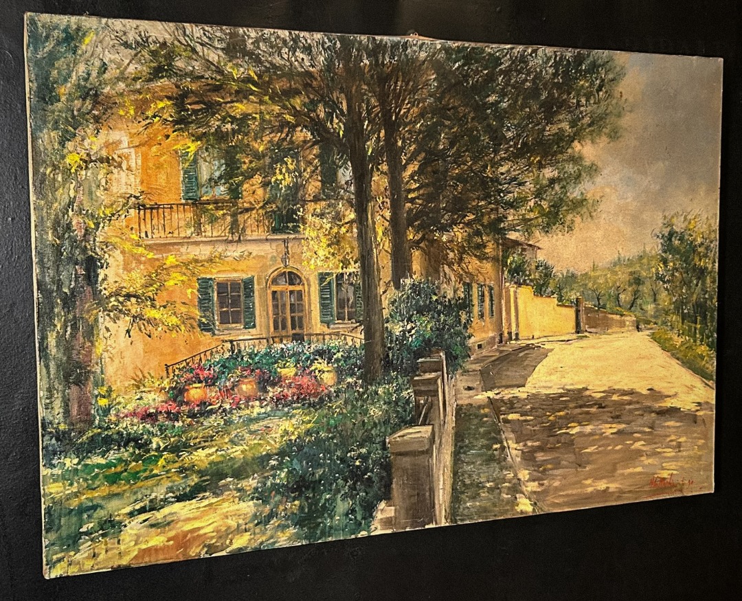 Importante dipinto a olio su tela realizzato dall’artista del XX secolo Roberto Martini, raffigurante uno scorcio paesaggistico di Firenze. La composizione presenta una luminosa veduta di una villa immersa nel verde, con alberature rigogliose, giardino fiorito e una strada che si apre verso la campagna toscana sullo sfondo.