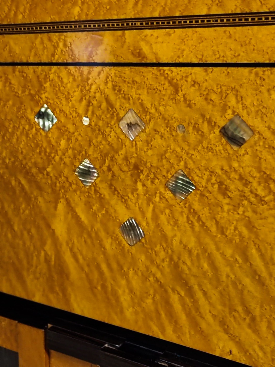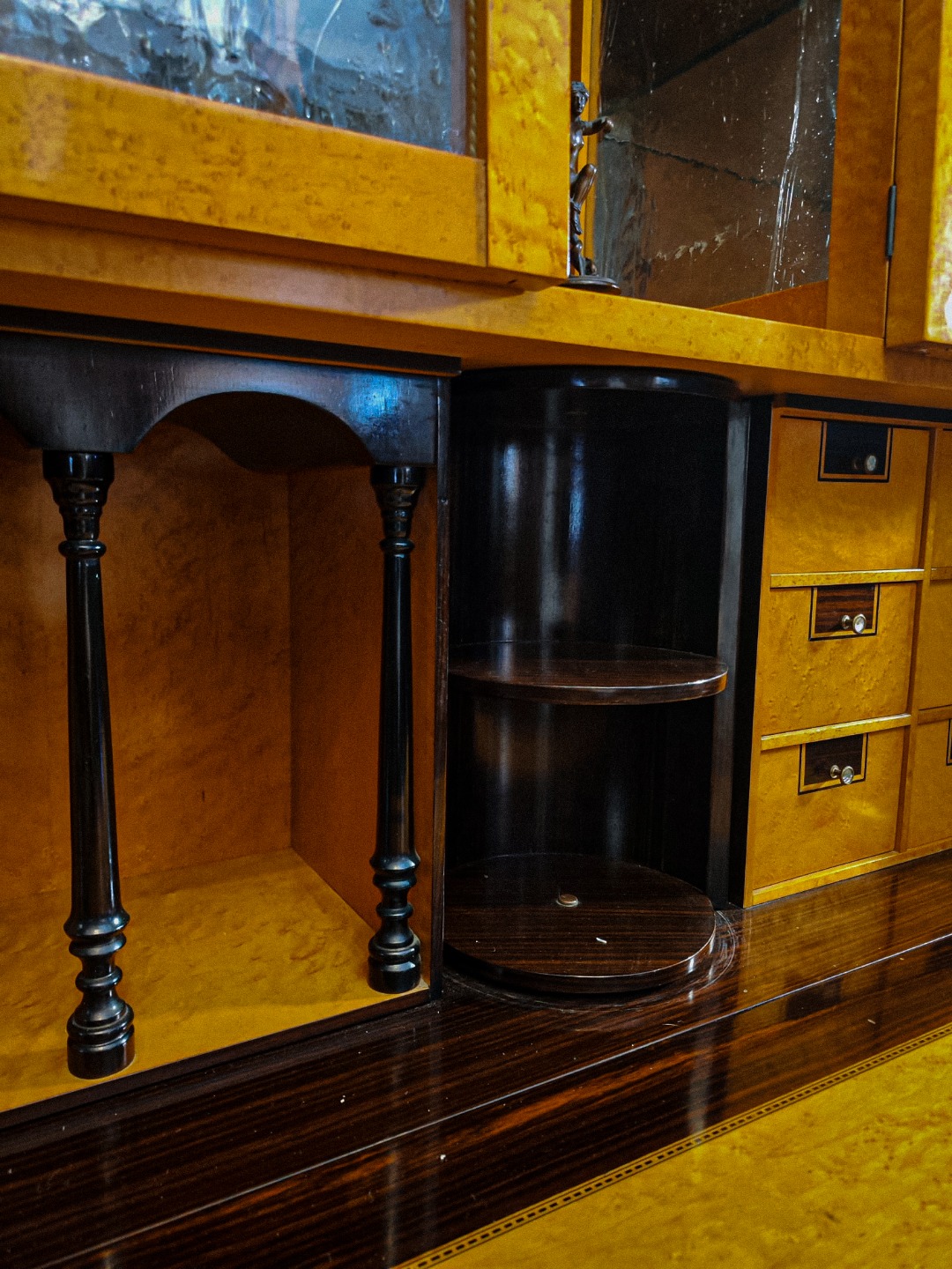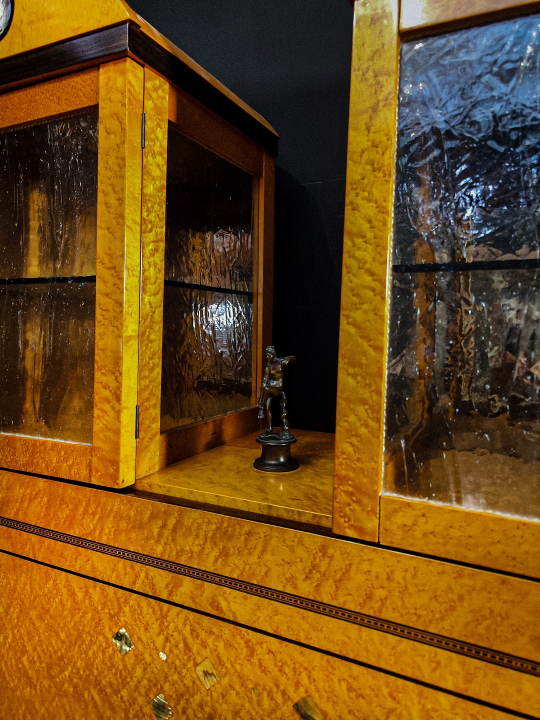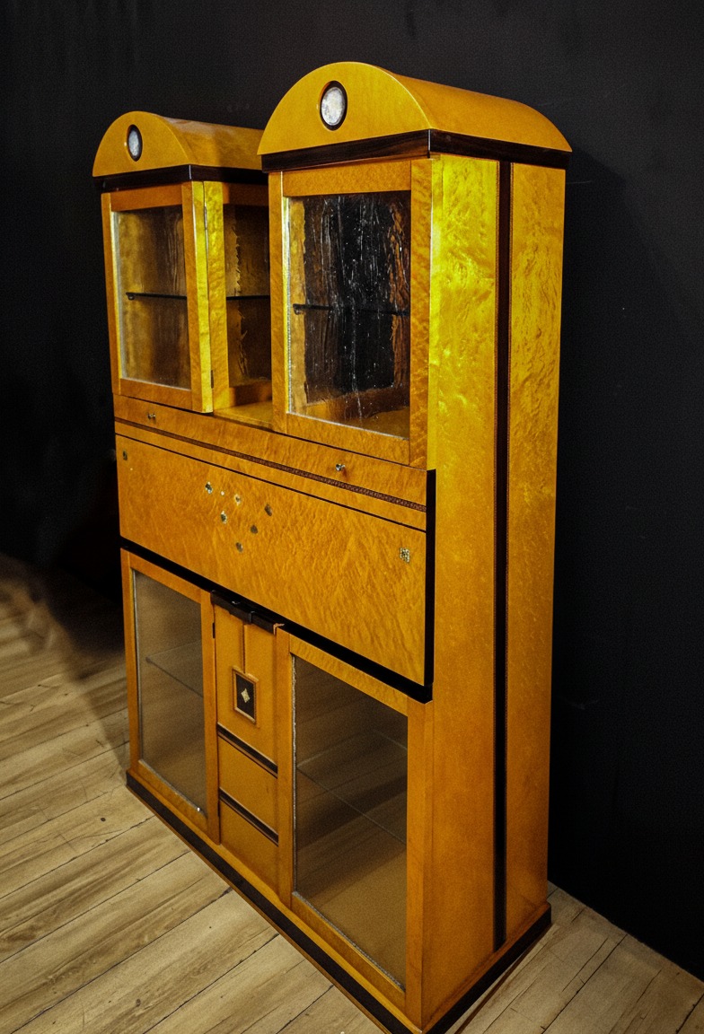 Questo pezzo eccezionale è realizzato principalmente in legno di acero, arricchito da una scultura in bronzo e delicati intarsi in madreperla, che aggiungono un tocco di raffinatezza e unicità; sopra presenta due ante a vetro Vetro soffiato antico (o vetro a cilindro) sotto nel mentre presenta due ante a vetro chiaro.