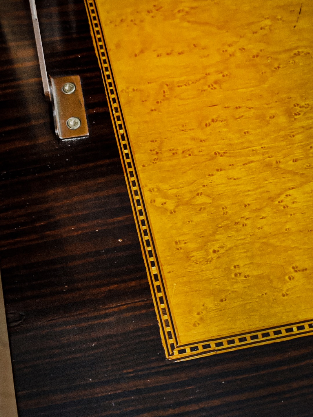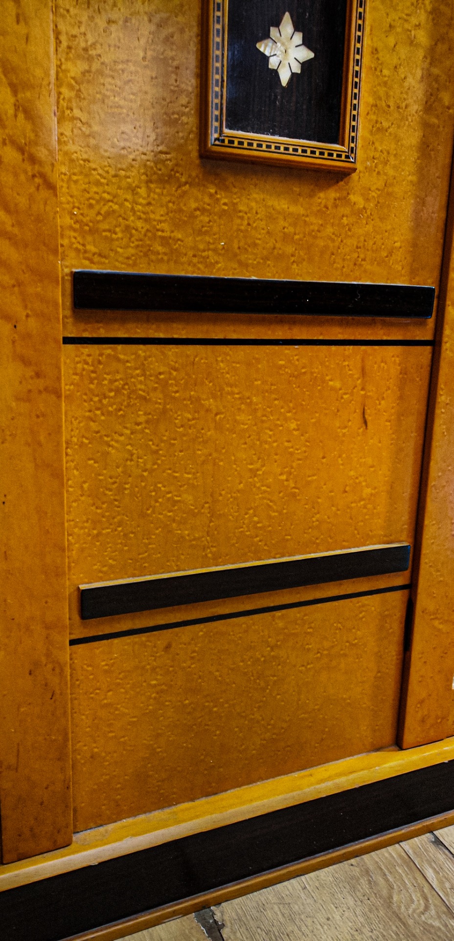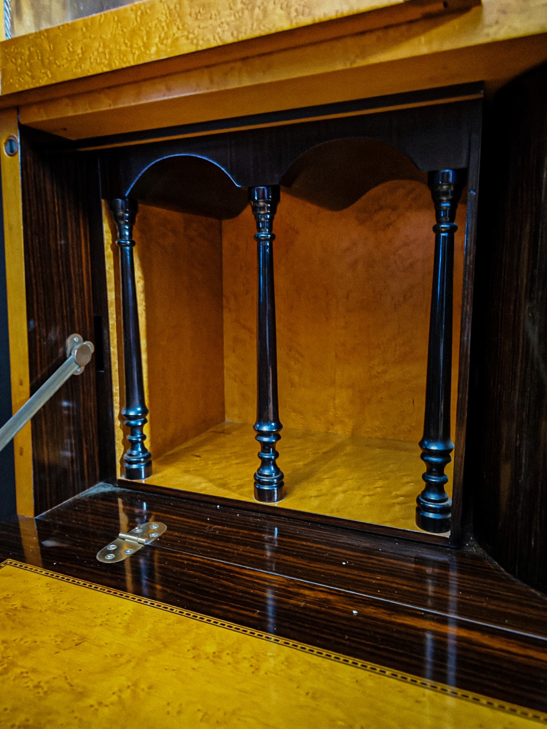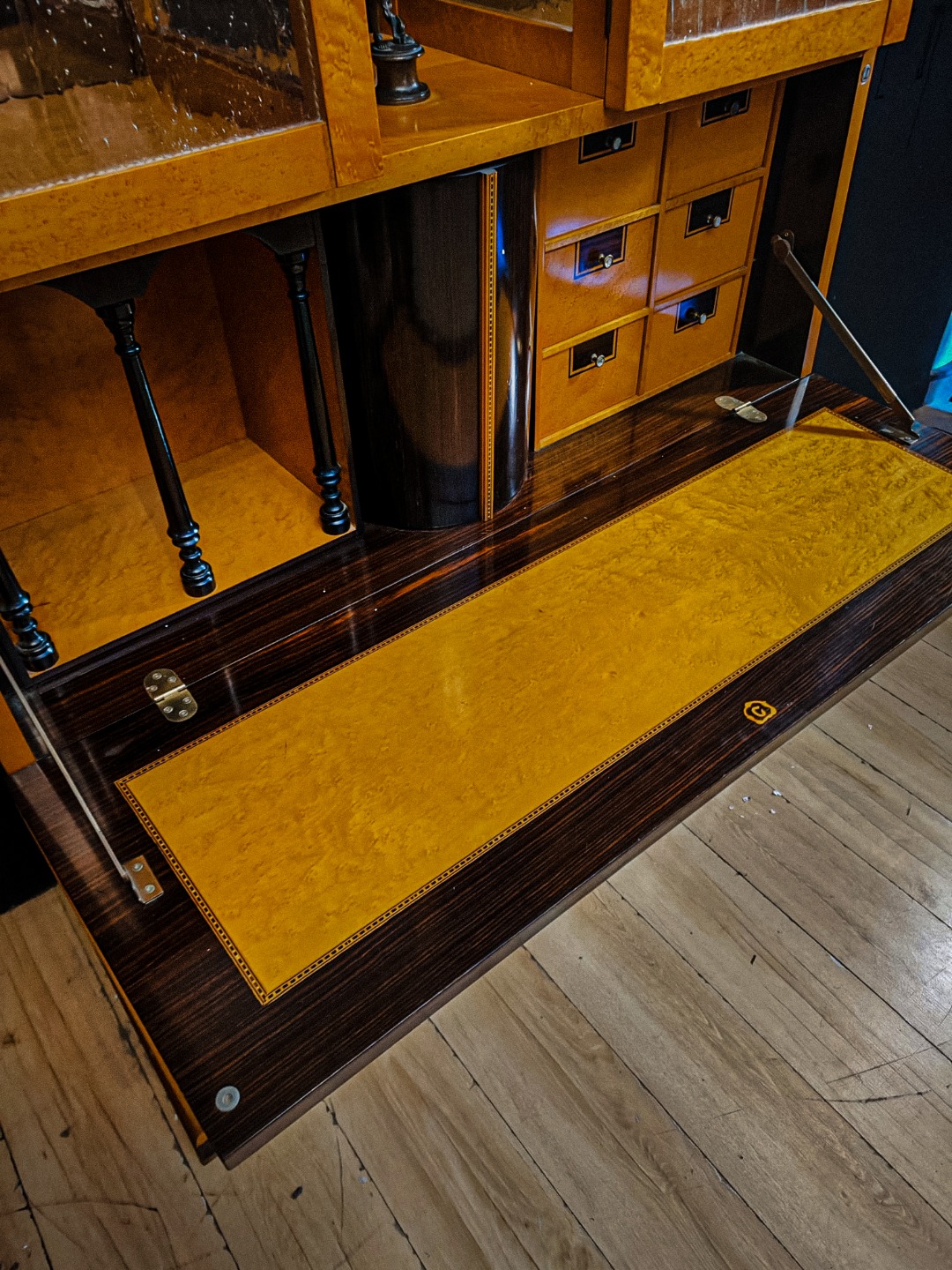 Questo pezzo eccezionale è realizzato principalmente in legno di acero, arricchito da una scultura in bronzo e delicati intarsi in madreperla, che aggiungono un tocco di raffinatezza e unicità; sopra presenta due ante a vetro Vetro soffiato antico (o vetro a cilindro) sotto nel mentre presenta due ante a vetro chiaro.