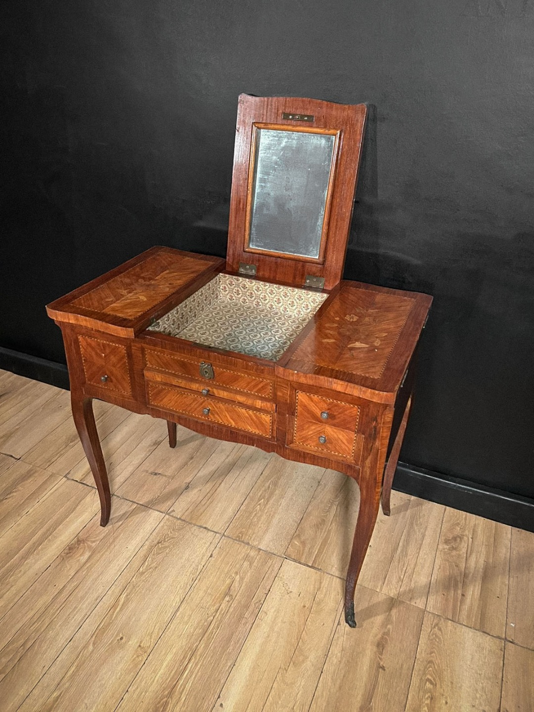 Elegante toeletta francese in stile Luigi XV, risalente alla fine del XIX secolo, realizzata in legno finemente lastronato e impreziosita da delicati intarsi floreali. Il piano superiore presenta tre sportelli apribili che celano un vano interno rivestito in tessuto decorato, suddiviso in scomparti porta oggetti.