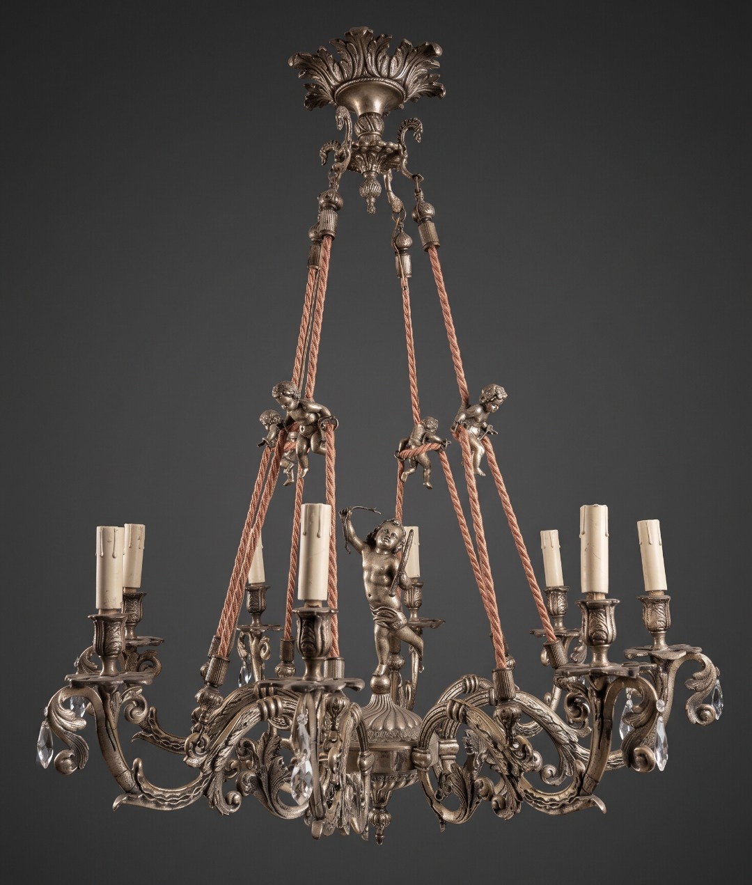 Importante lampadario fiorentino dei primi del Novecento, realizzato in bronzo finemente lavorato con elegante finitura argentata. La struttura si distingue per la ricchezza dei dettagli e per la presenza di raffinati putti scolpiti a tutto tondo, disposti lungo i tiranti superiori e nel corpo centrale, elemento che conferisce al pezzo grande movimento e pregio artistico.