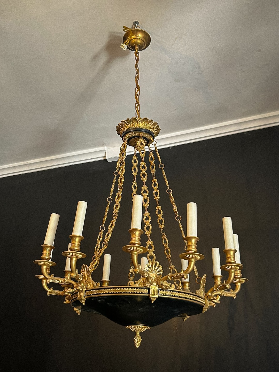 Il lampadario è composto da dodici bracci curvi, ciascuno terminante con portalampada a candela. I bracci sono decorati con motivi neoclassici e teste stilizzate, tipiche del gusto imperiale, conferendo all’insieme eleganza e maestosità. La parte inferiore è completata da un elemento pendente decorativo in bronzo dorato.