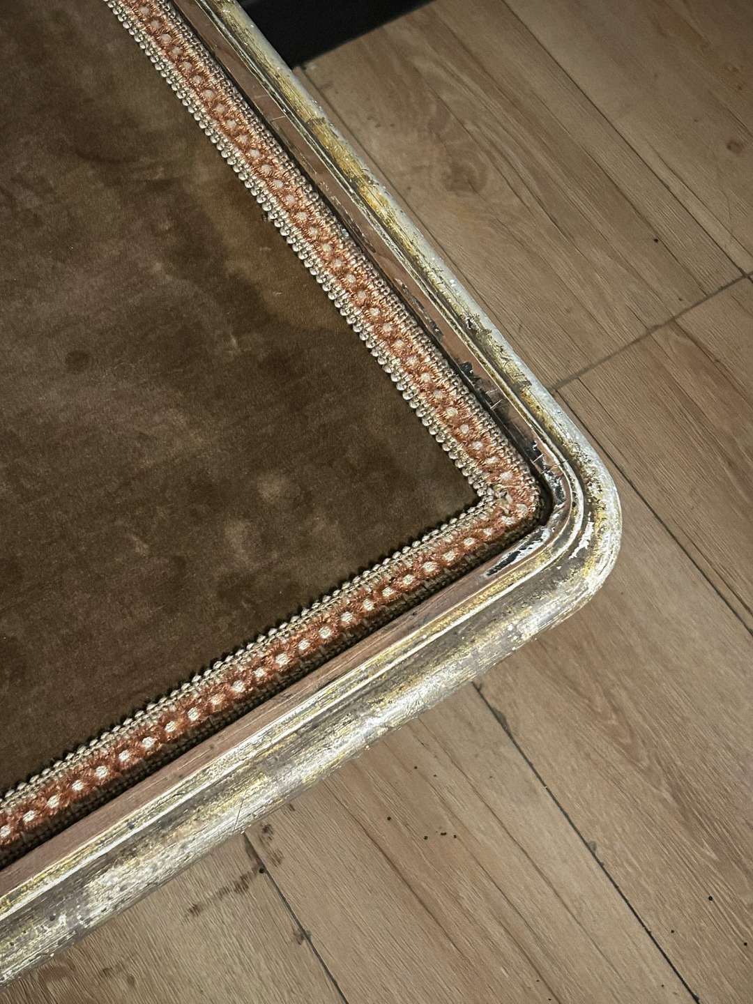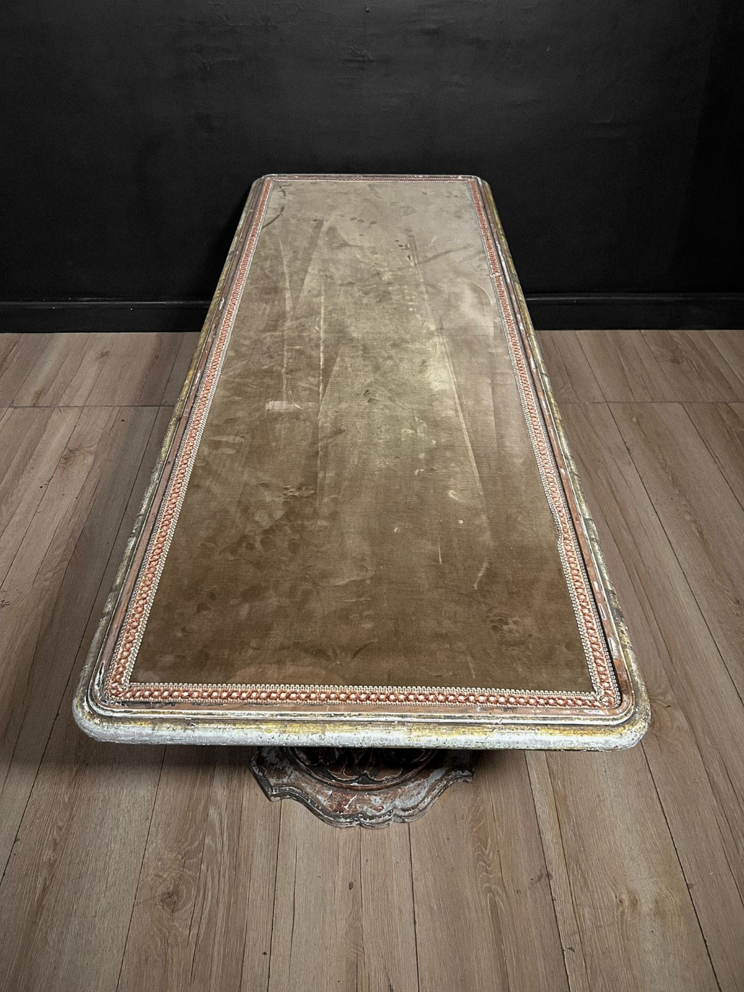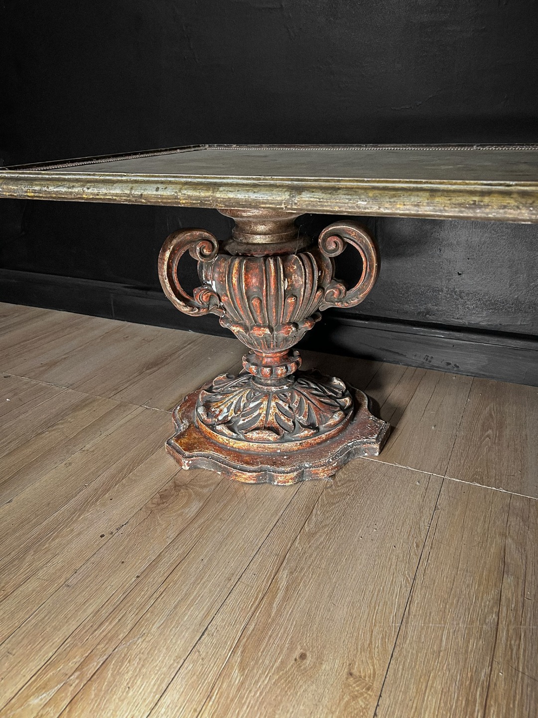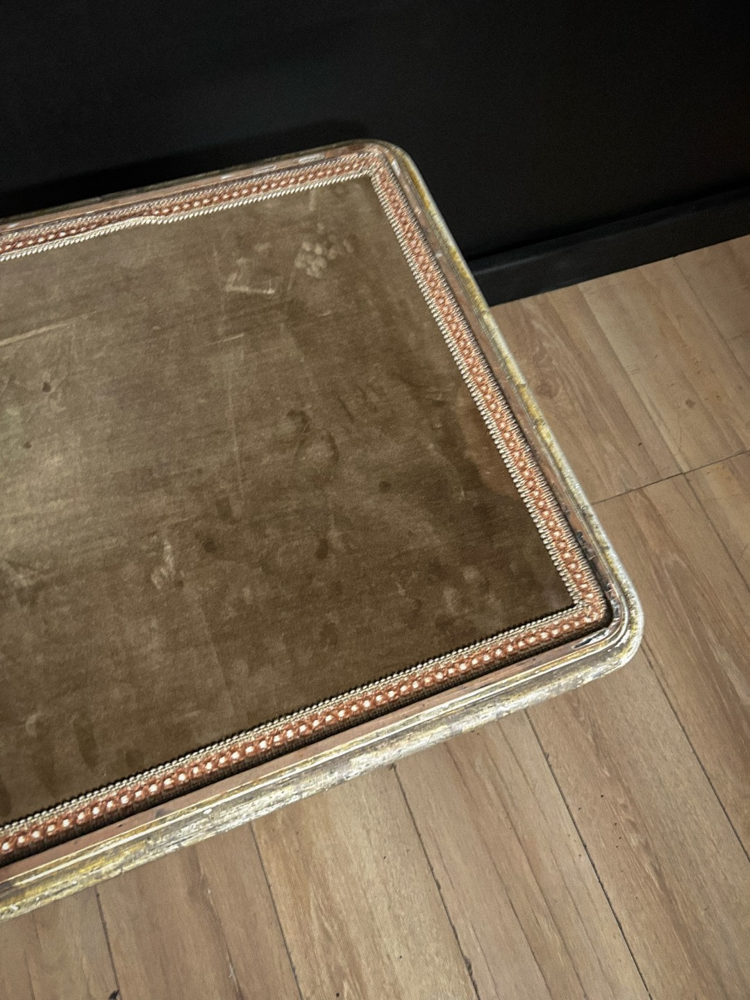 Antico tavolino fiorentino realizzato in legno pregiato, finemente intagliato e rifinito con argento mecca, risalente alla fine del XIX secolo. Il piano rettangolare presenta una cornice sagomata con decori perimetrali e una superficie centrale rivestita, caratterizzata da una patina originale d’epoca con segni del tempo coerenti con l’età del mobile.