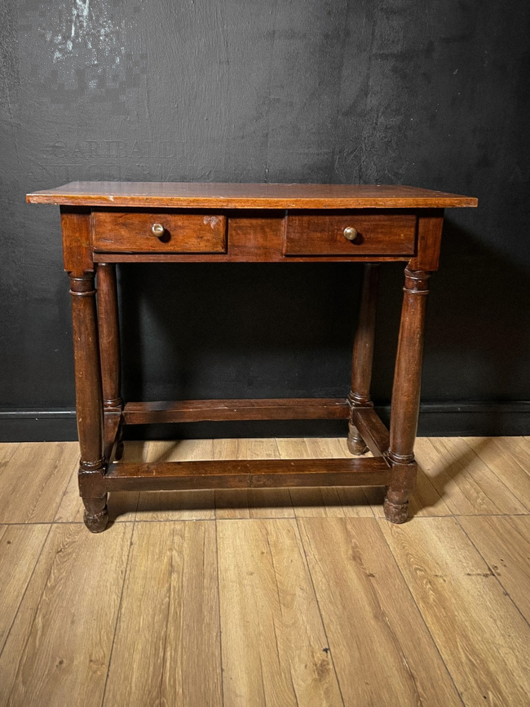 Antico tavolino toscano in legno di noce, realizzato nell’Ottocento, caratterizzato da una linea sobria ed elegante tipica della tradizione artigianale regionale. La struttura poggia su quattro gambe tornite collegate da traverse perimetrali che garantiscono solidità e stabilità al mobile. Il piano rettangolare è impreziosito da un raffinato intarsio in acero che corre lungo il perimetro, creando un elegante contrasto cromatico con il noce. Il tavolino è dotato di due cassetti frontali con pomelli originali, utili per piccoli oggetti, e rifiniti con incastri a coda di rondine visibili all’interno. Le superfici presentano la patina del tempo, segno della sua autenticità e della sua storia. Un arredo versatile e di grande fascino, ideale come tavolino da centro, scrittoio da appoggio o complemento per ambienti classici e ricercati.