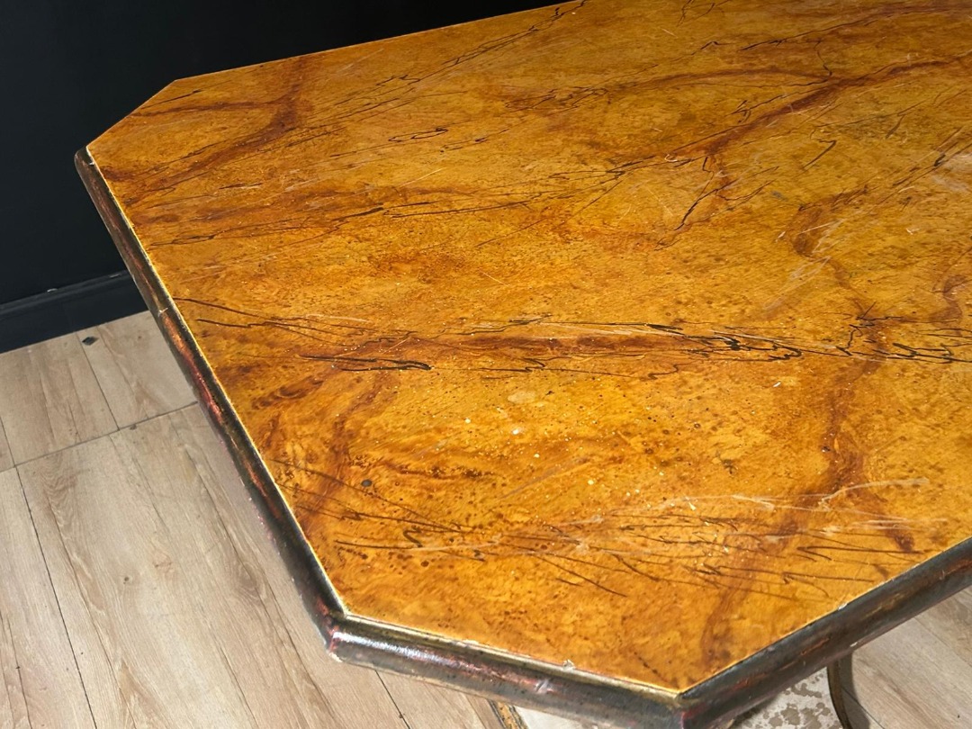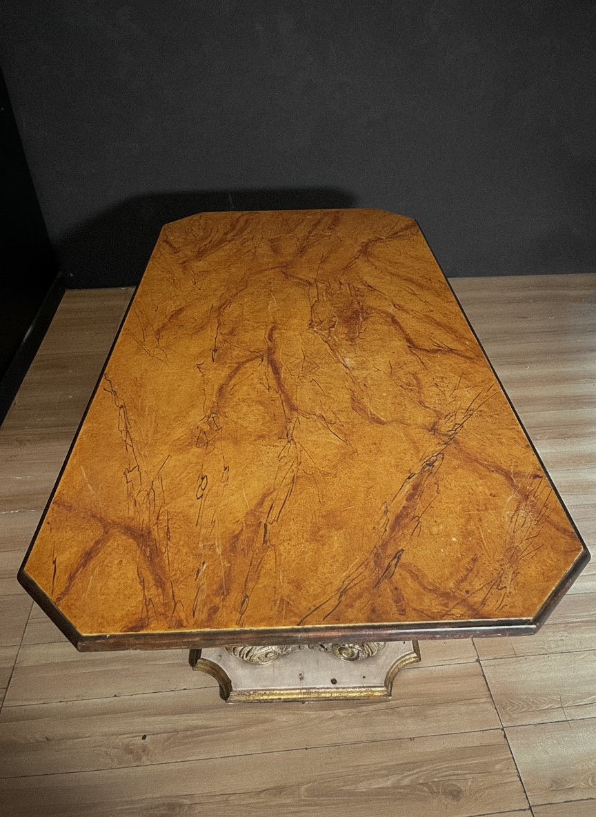 Il piano rettangolare, con angoli smussati, è interamente dipinto a mano con elegante effetto marmorizzato nei toni caldi dell’ocra e dell’ambra, che richiama l’aspetto delle pregiate pietre dure.