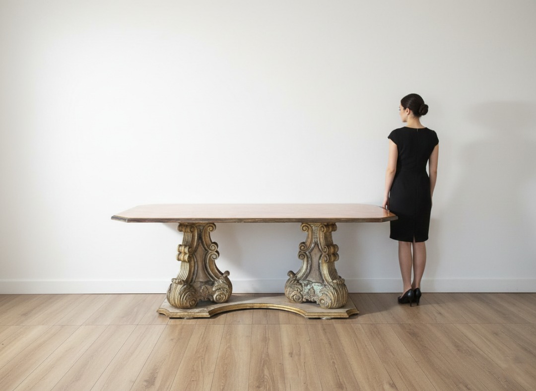 Le proporzioni importanti, unite alla ricchezza decorativa e alla qualità dell’intaglio, rendono questo tavolo ideale come tavolo da centro, da sala o da rappresentanza in ambienti classici ed eleganti.