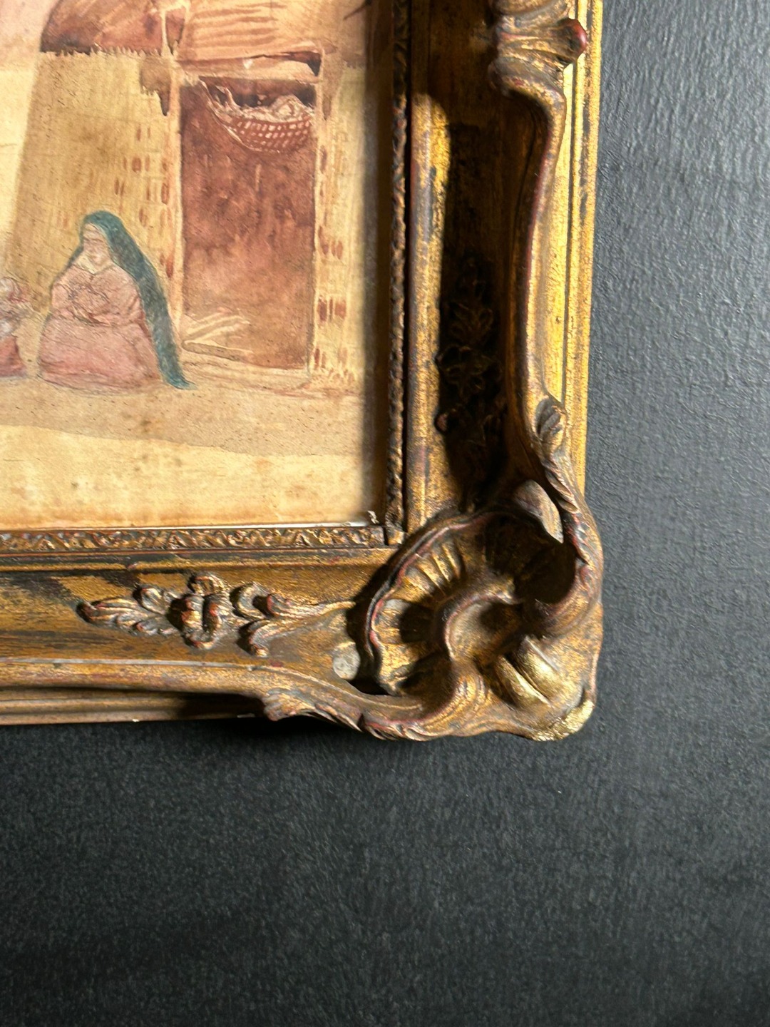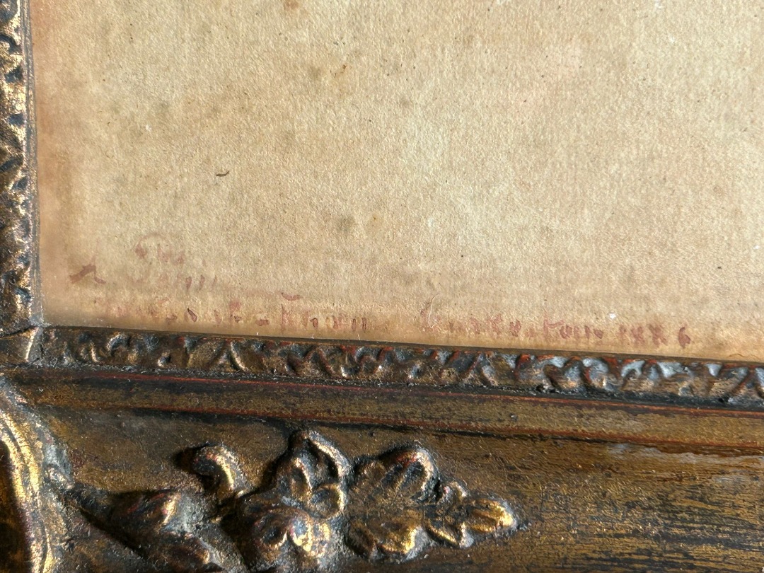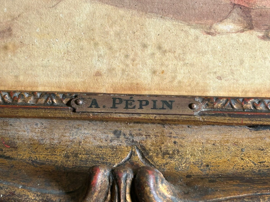 Il dipinto è impreziosito da una cornice coeva riccamente sagomata e dorata, decorata con motivi floreali e volute agli angoli, che valorizza ulteriormente l’opera. In basso al centro è presente la firma “A. Pépin”, visibile come da documentazione fotografica.