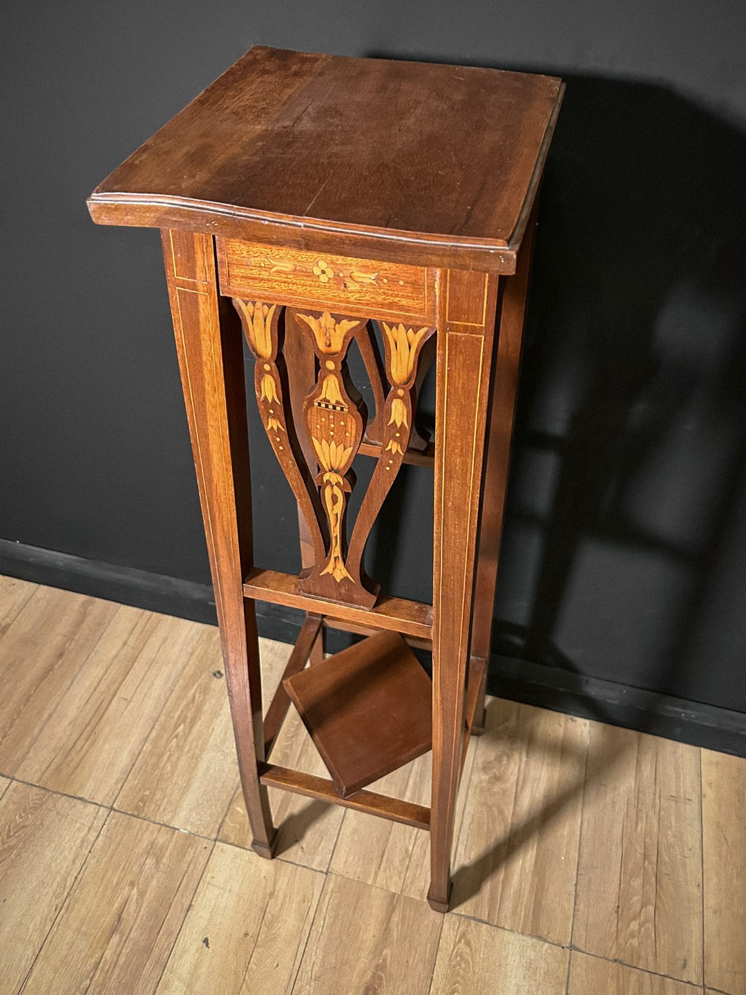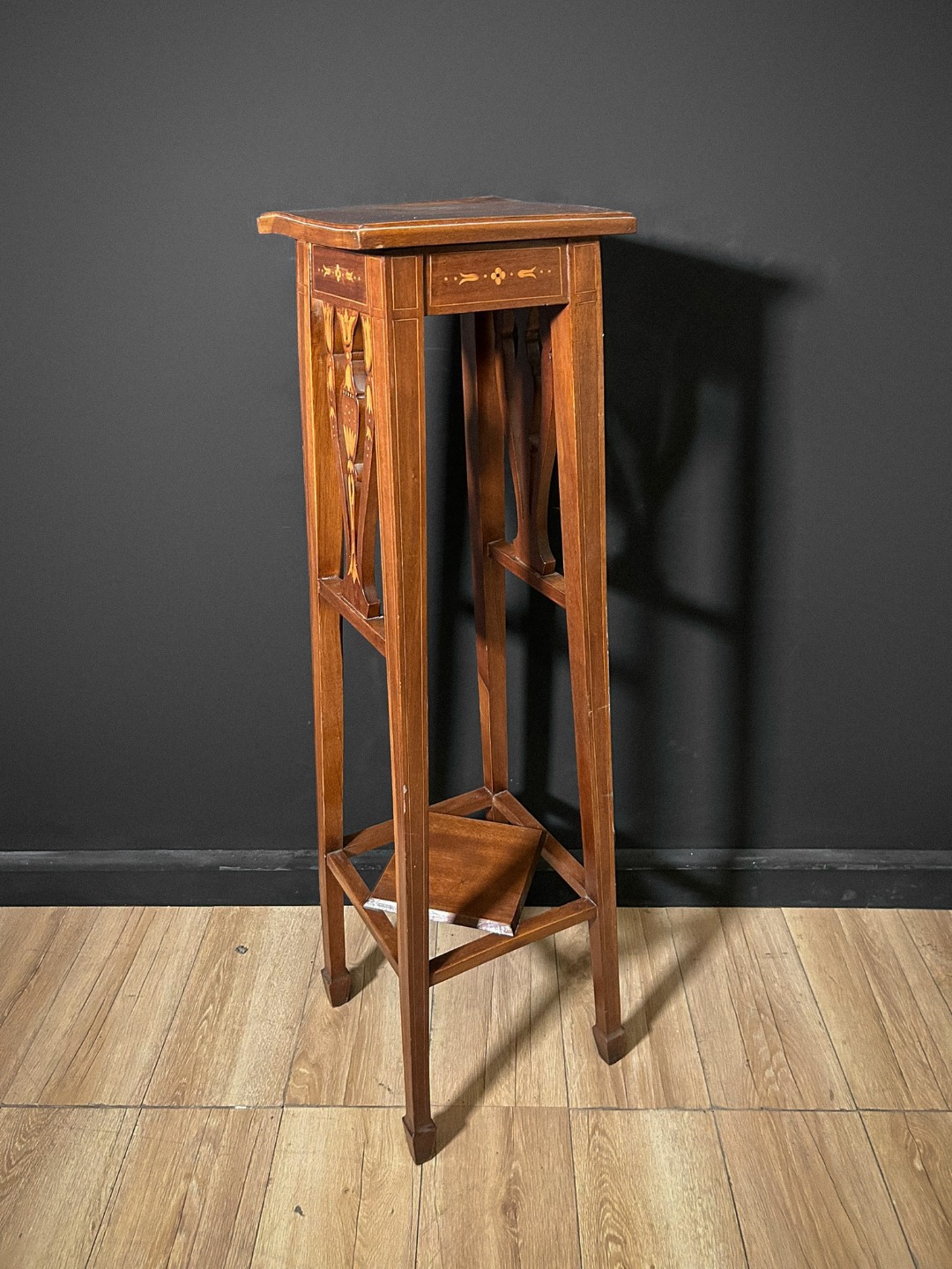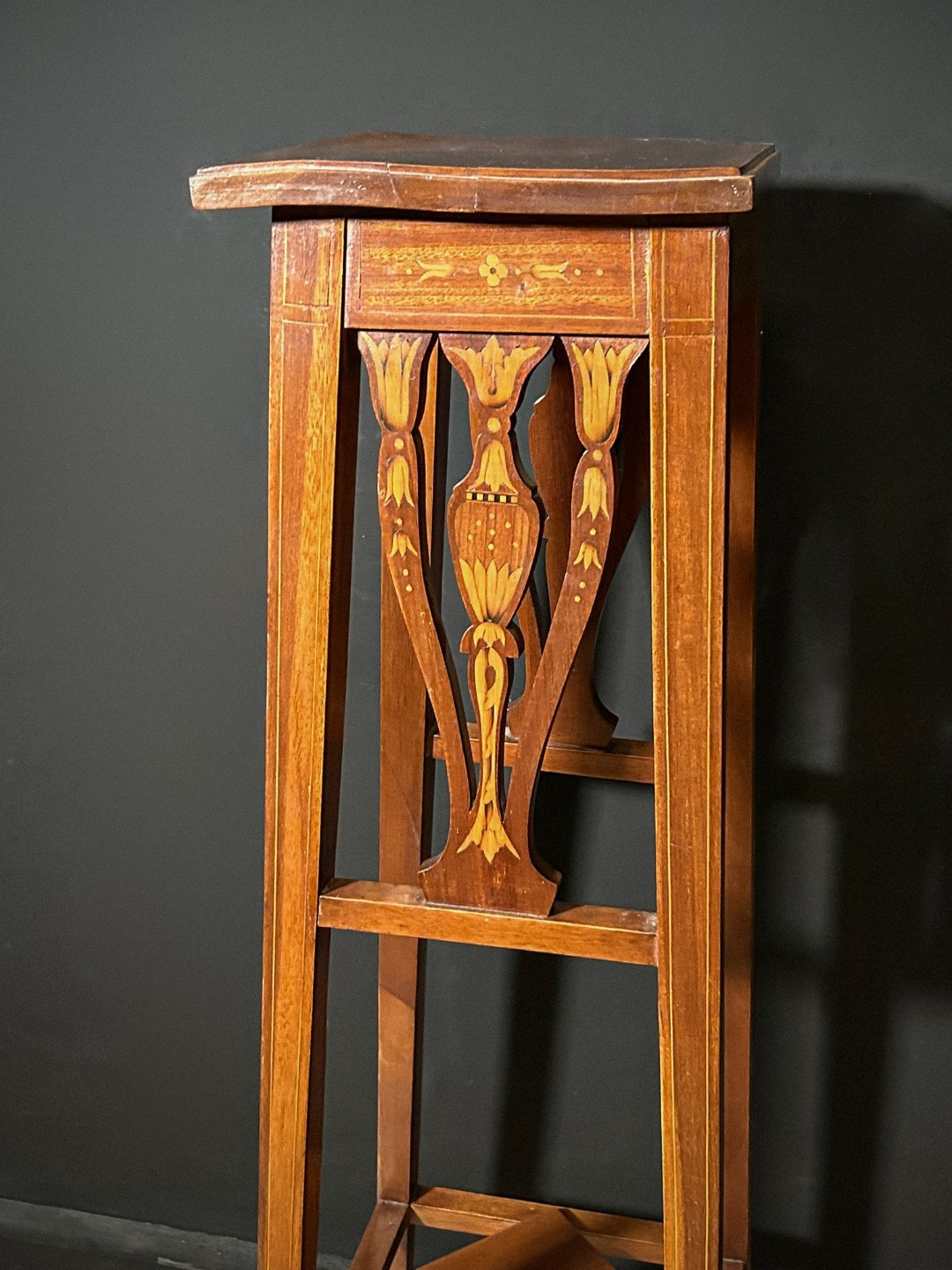 Raffinata colonna di epoca inizio XX secolo, realizzata in legno nobile finemente lavorato e decorata con pregiati intarsi in acero. La struttura, di forma ottagonale, presenta una linea elegante e proporzionata, impreziosita da motivi geometrici e floreali intarsiati a mano lungo tutta la superficie, che ne esaltano la raffinatezza e la cura artigianale.