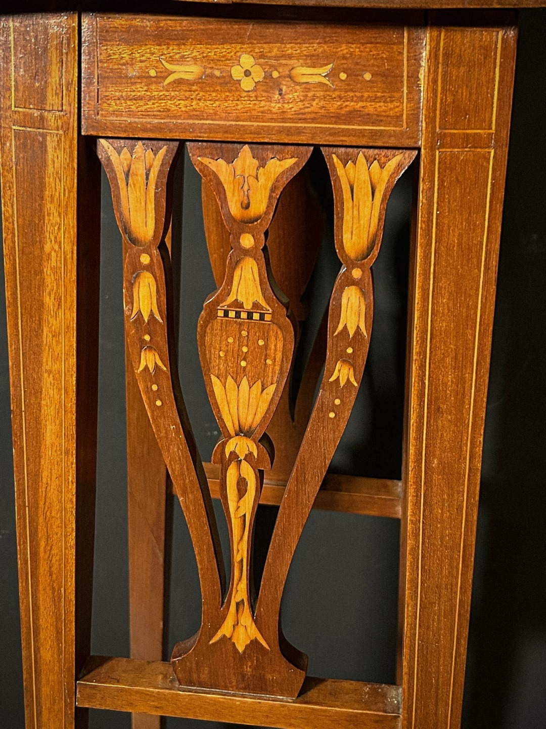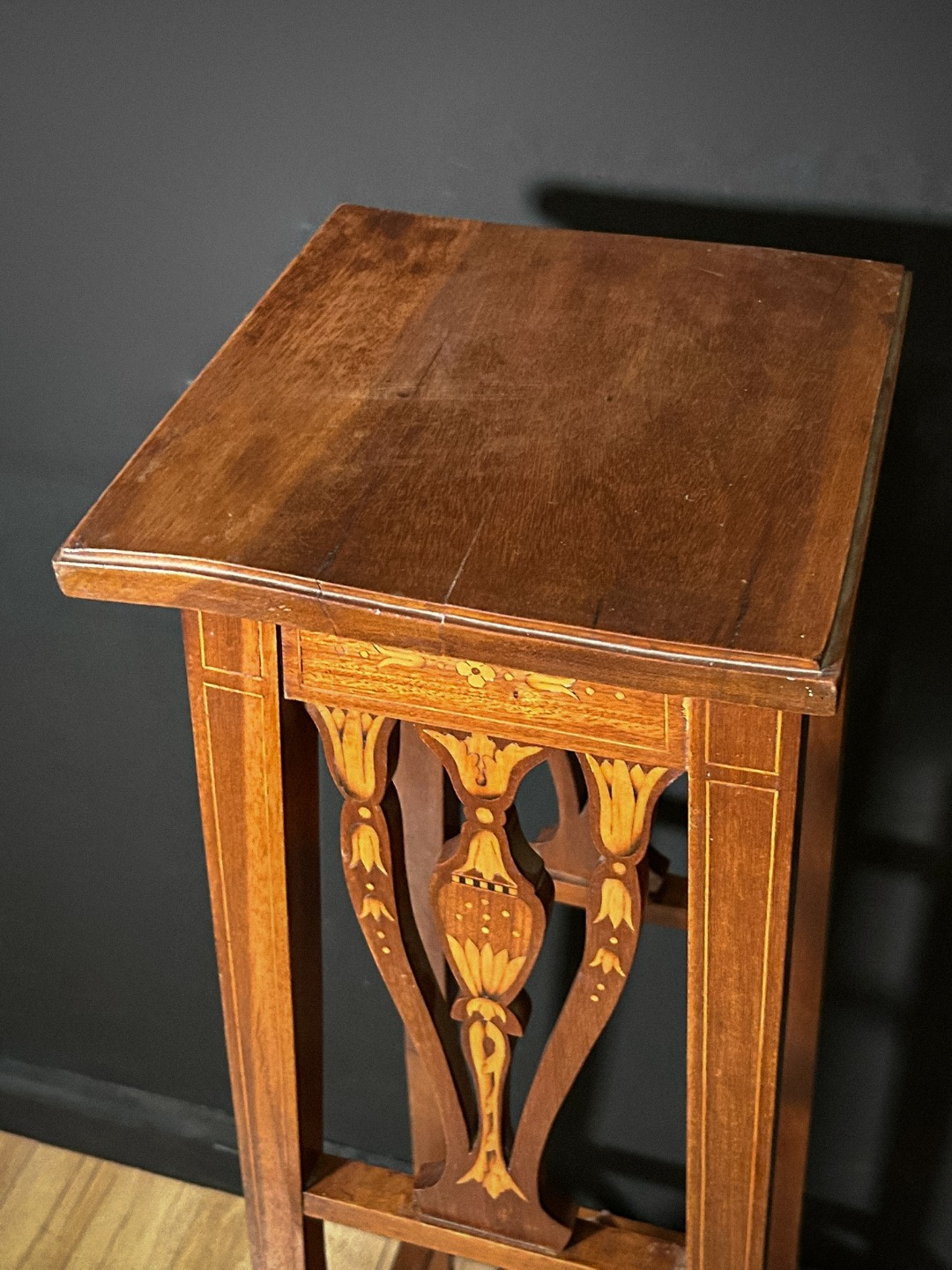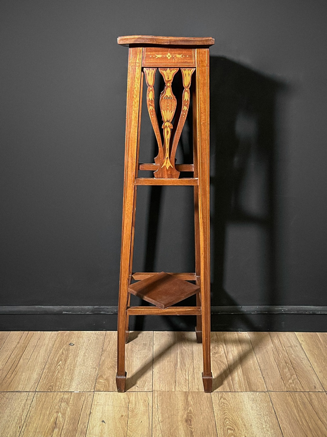 Raffinata colonna di epoca inizio XX secolo, realizzata in legno nobile finemente lavorato e decorata con pregiati intarsi in acero. La struttura, di forma ottagonale, presenta una linea elegante e proporzionata, impreziosita da motivi geometrici e floreali intarsiati a mano lungo tutta la superficie, che ne esaltano la raffinatezza e la cura artigianale.