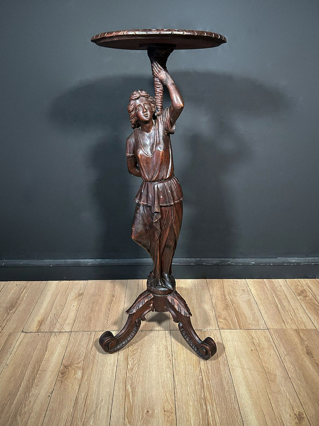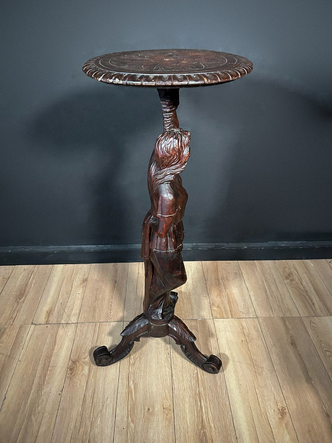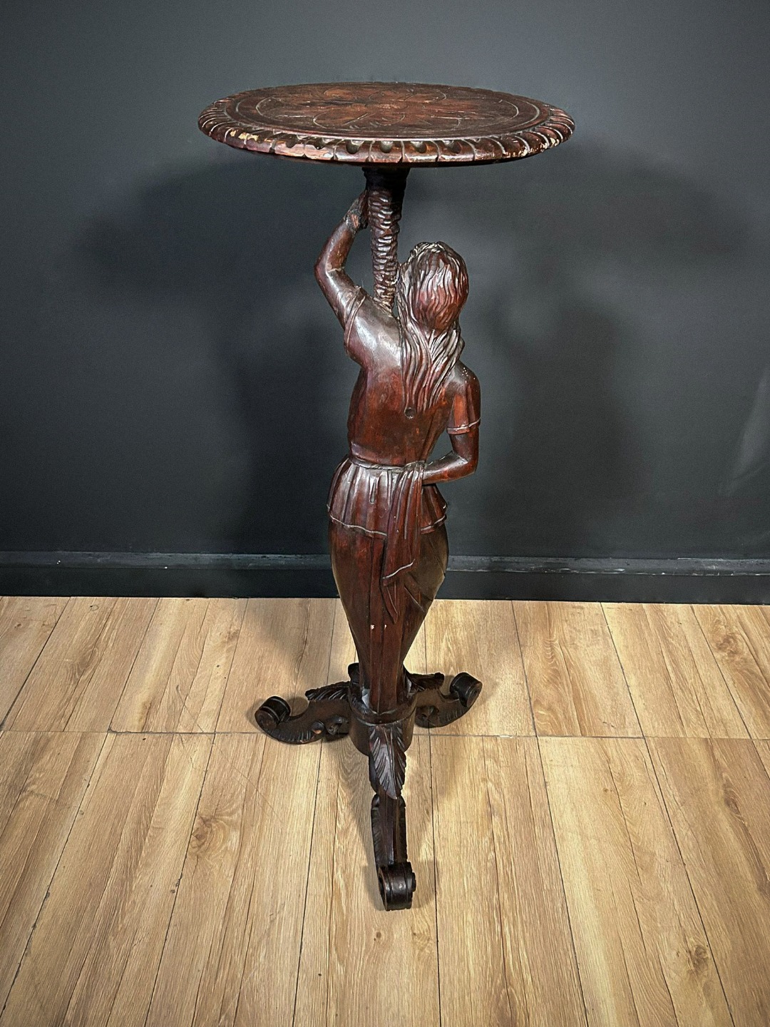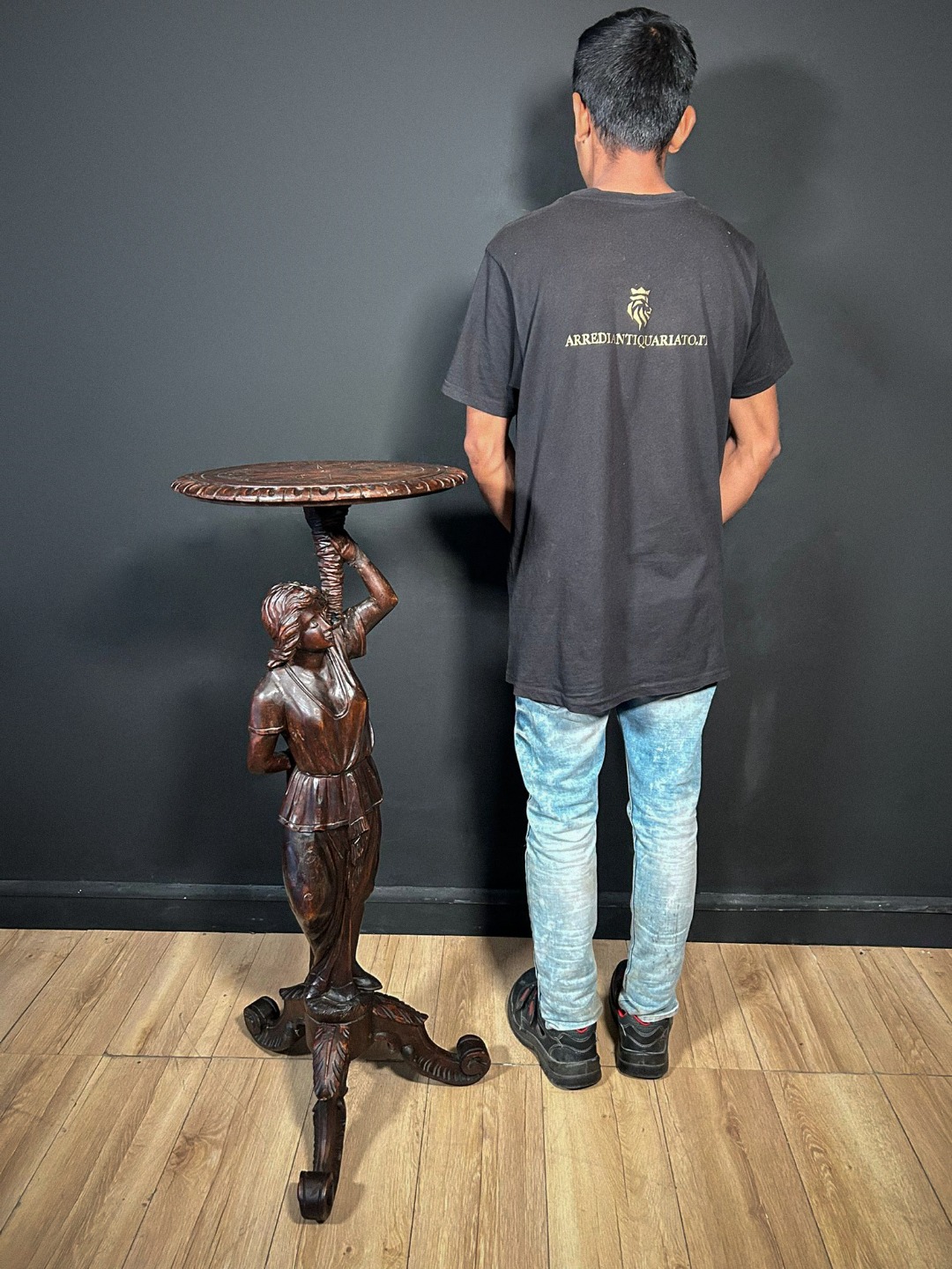 Antico tripode in legno scolpito, di pregevole fattura artigianale, con fusto centrale raffigurante una figura femminile intagliata a mano che sorregge il piano superiore.