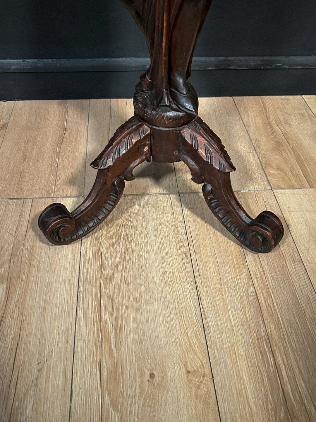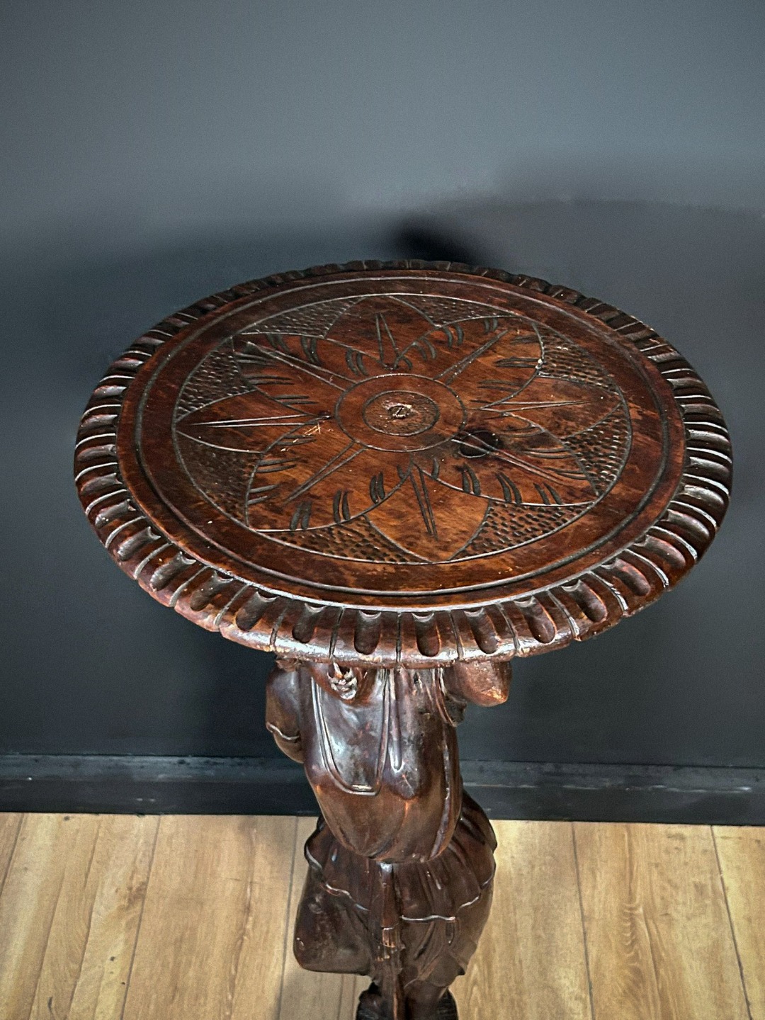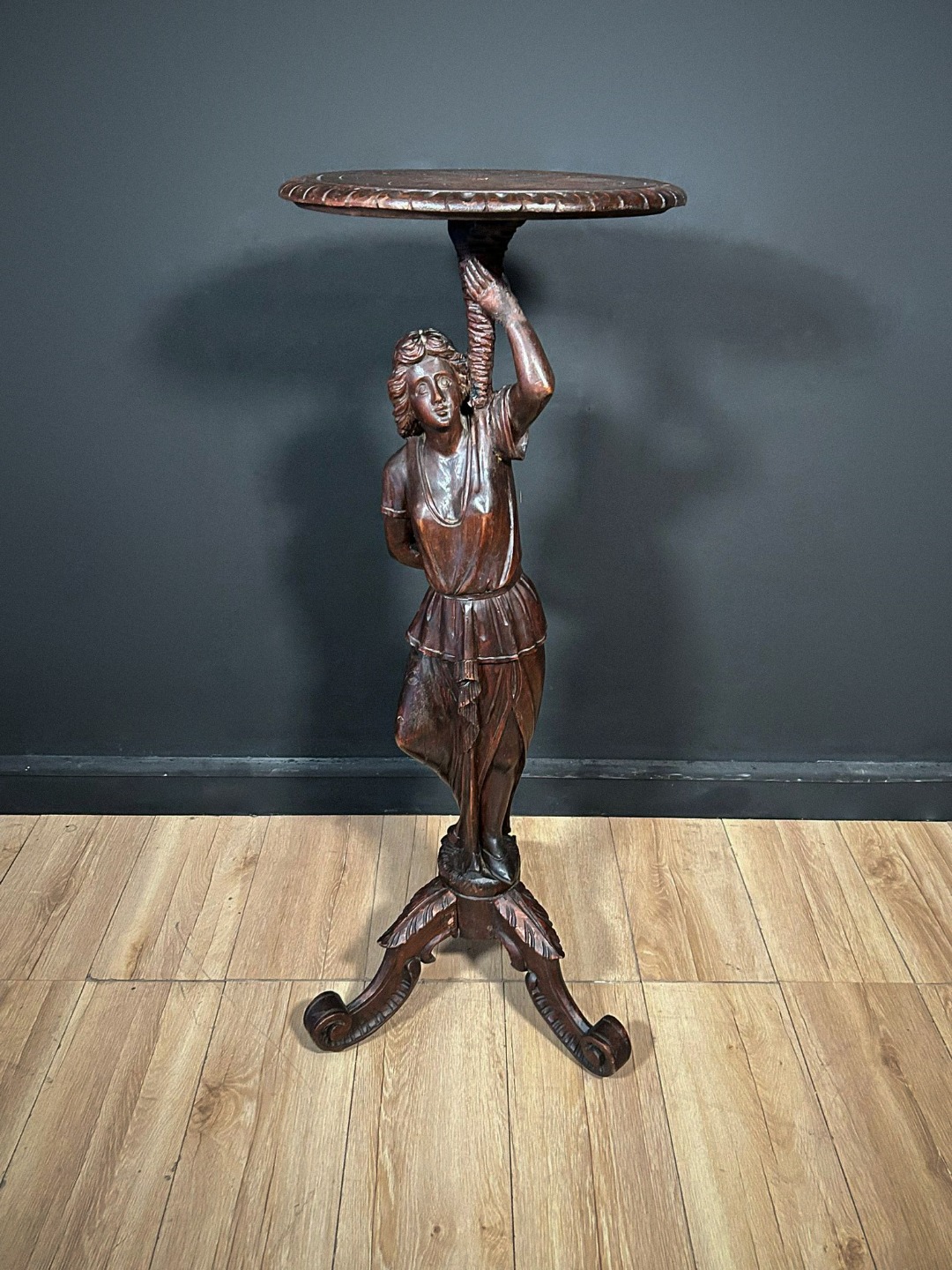 Antico tripode in legno scolpito, di pregevole fattura artigianale, con fusto centrale raffigurante una figura femminile intagliata a mano che sorregge il piano superiore.