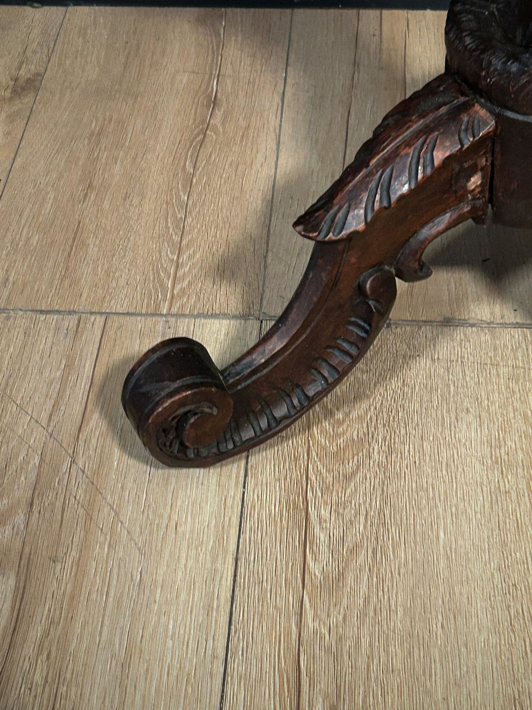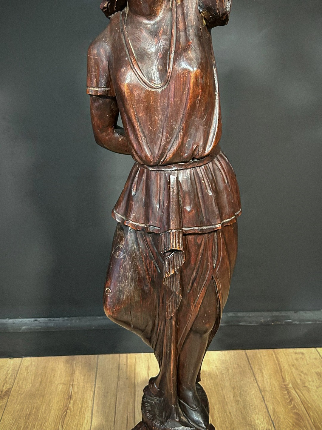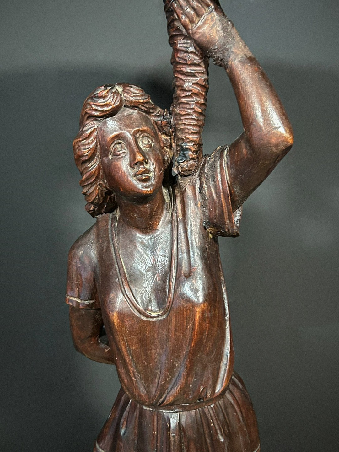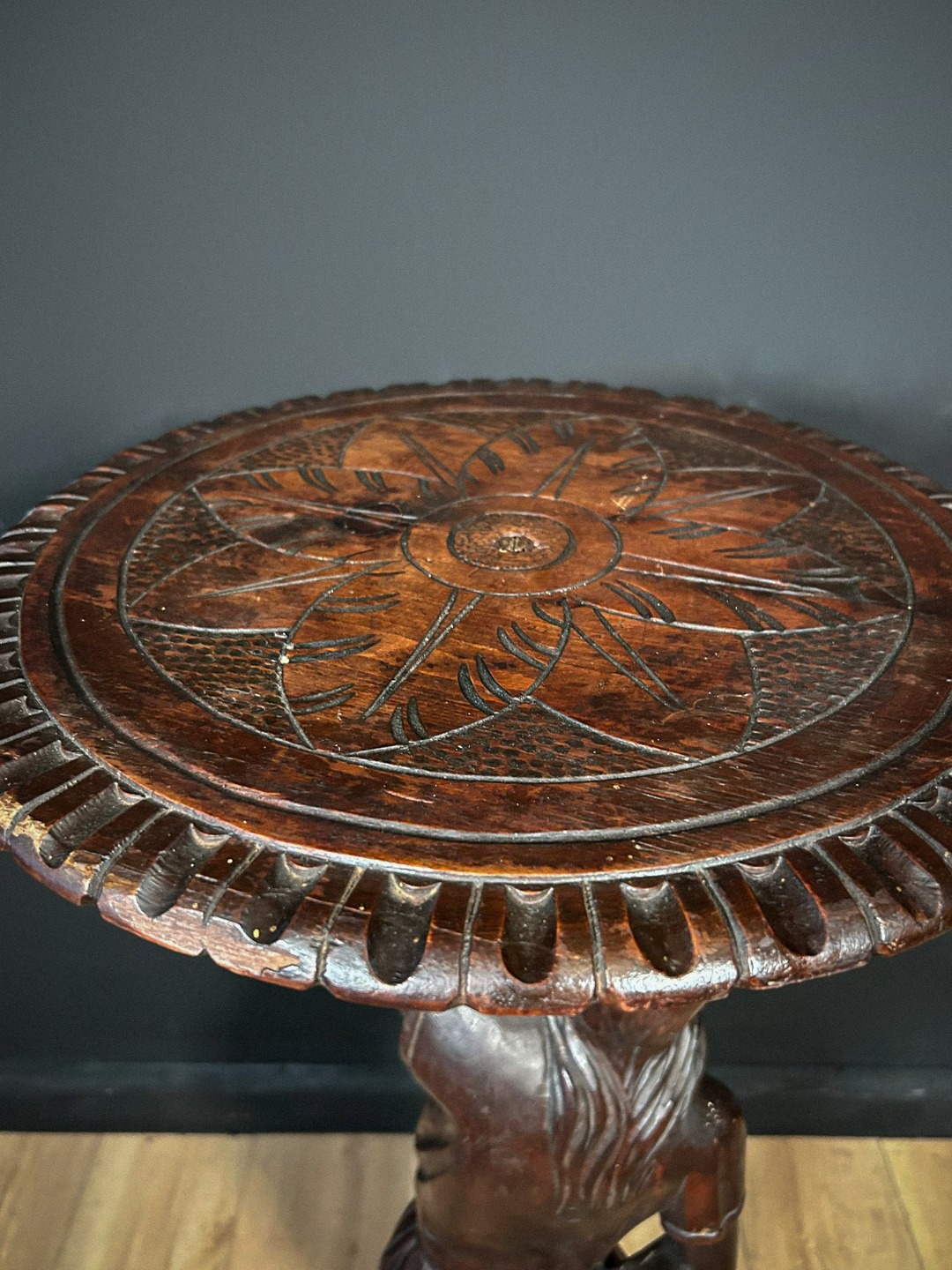 Antico tripode in legno scolpito, di pregevole fattura artigianale, con fusto centrale raffigurante una figura femminile intagliata a mano che sorregge il piano superiore.