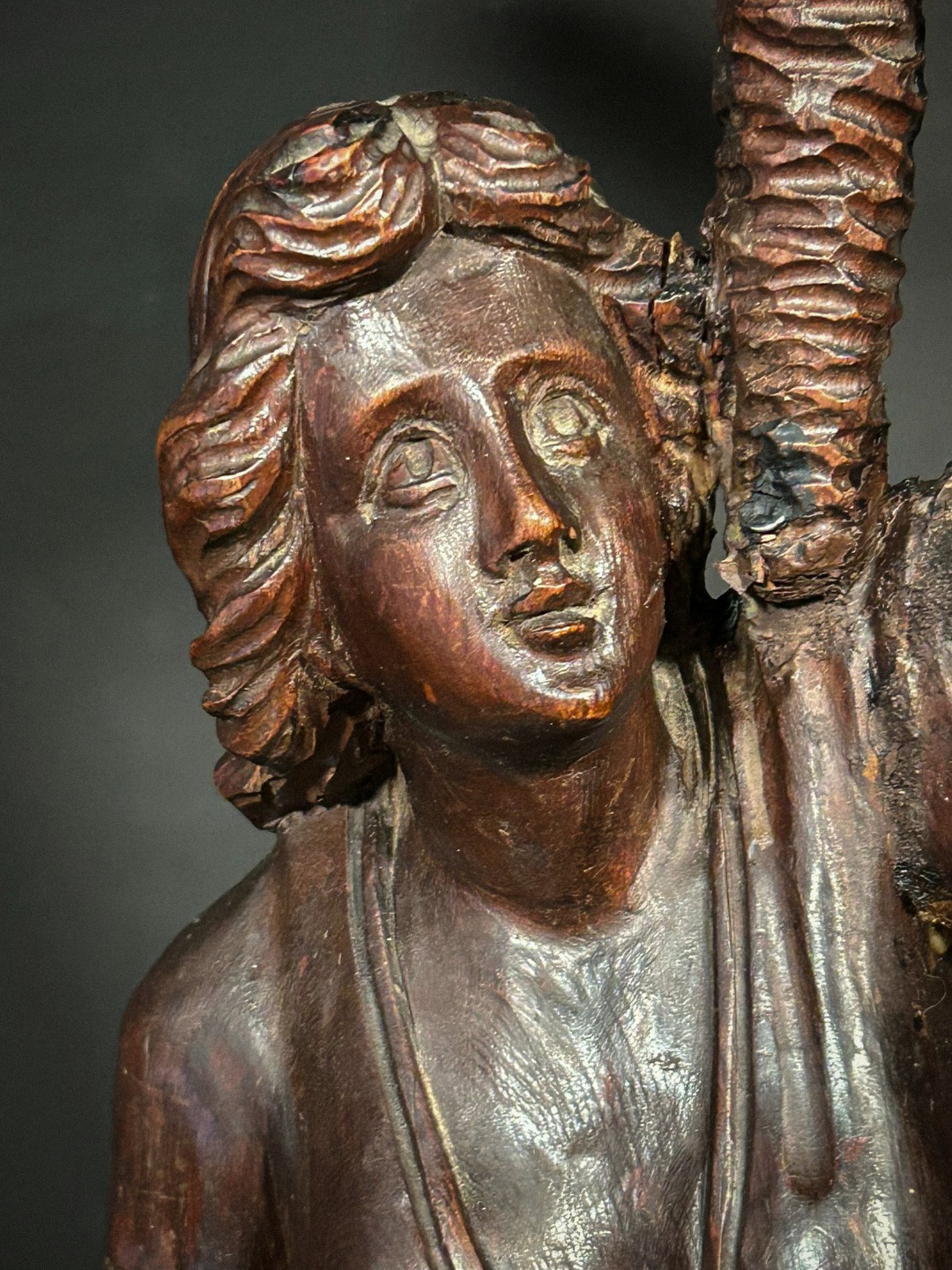 L’opera presenta una lavorazione accurata e dettagliata, con un modellato morbido e realistico del volto e delle vesti, mentre la base trilobata è ornata da motivi fogliacei e volute finemente cesellate. Il piano circolare, leggermente sagomato, completa armoniosamente la composizione.