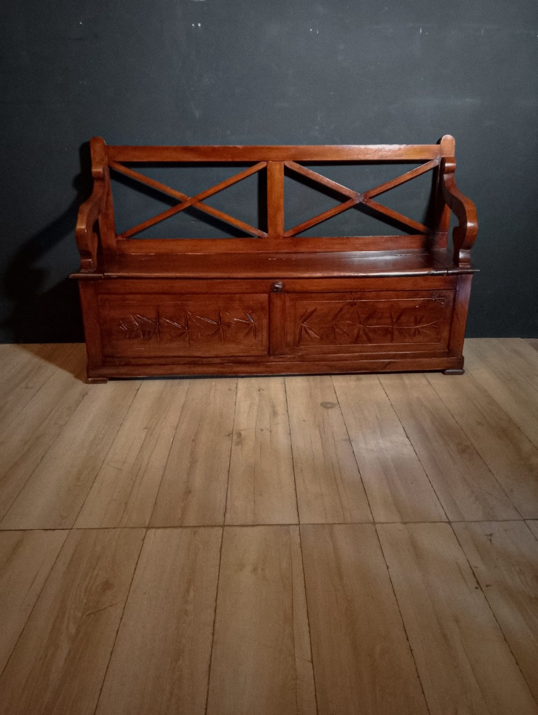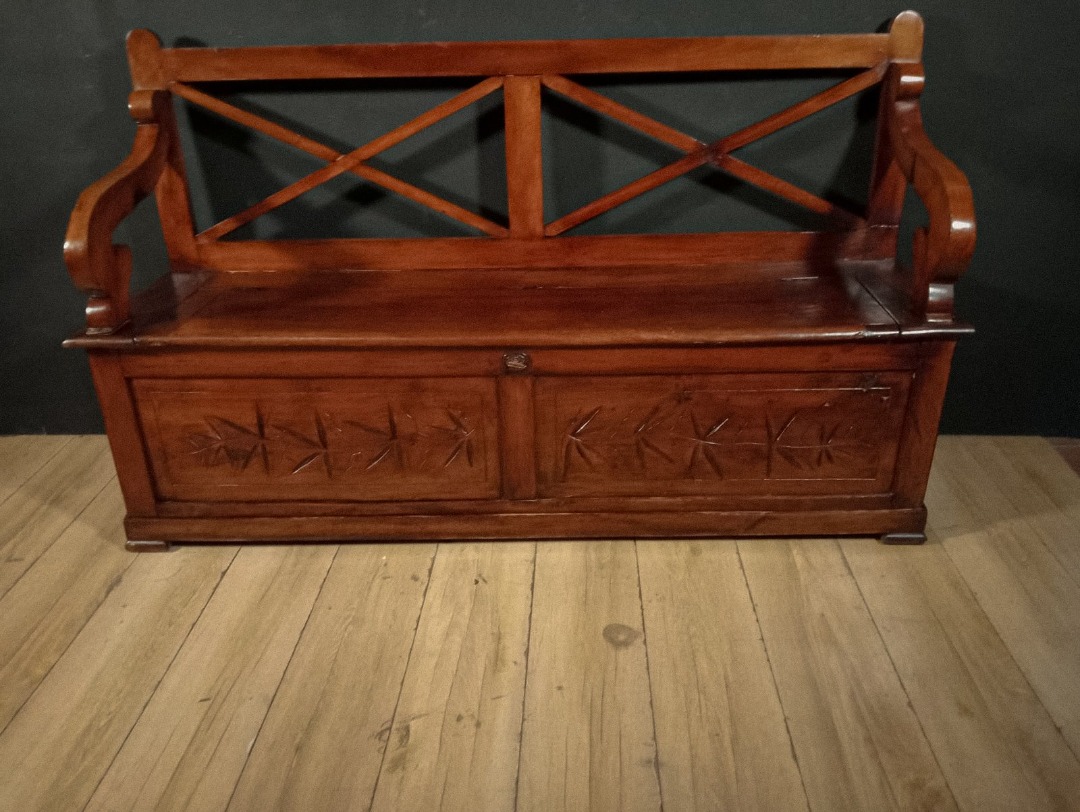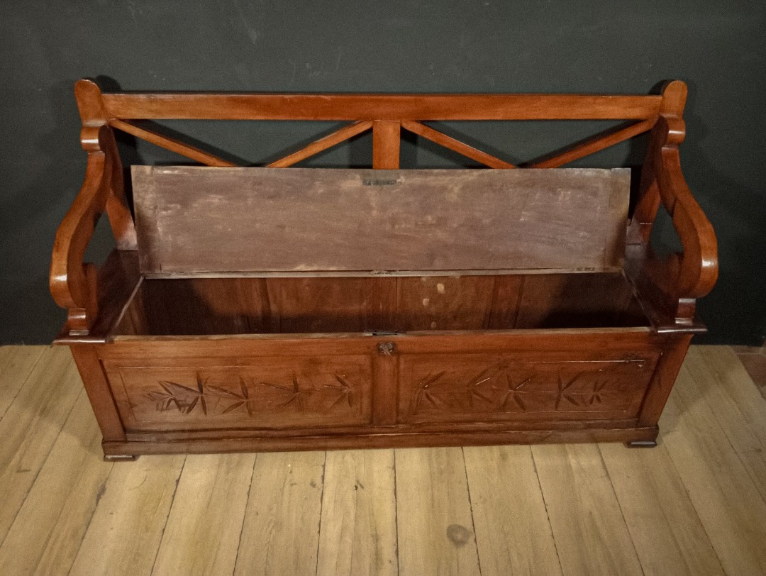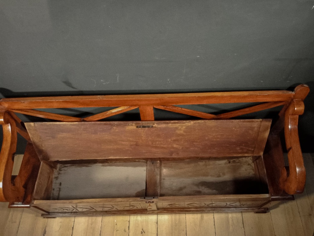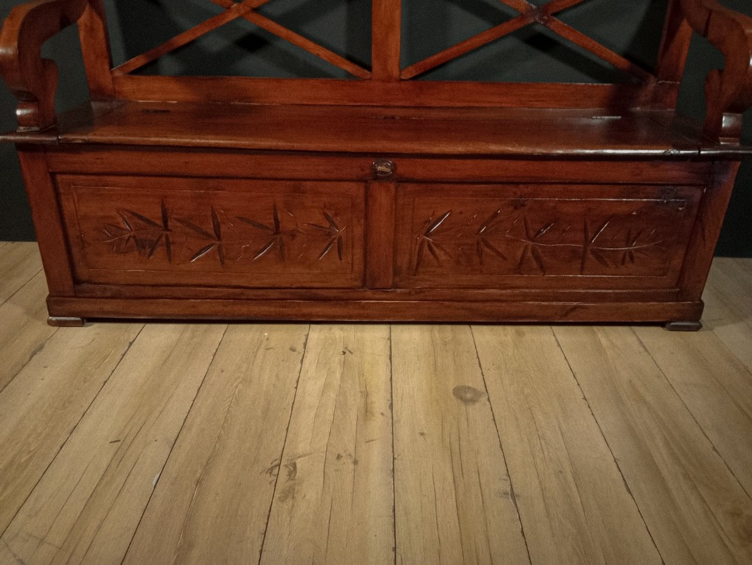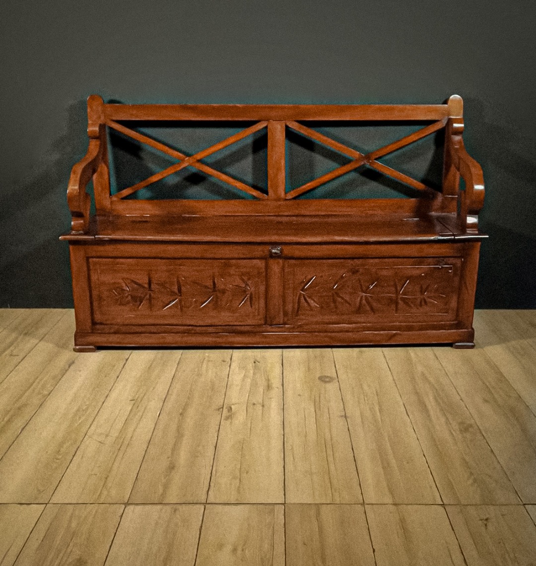 Antica cassapanca con schienale, in legno massello di noce, epoca Ottocento, con seduta apribile e decoro inciso a motivi stilizzati sul fronte, schienale a crociera e braccioli sagomati, solida e decorativa, perfetta per ingressi o ambienti rustico-eleganti