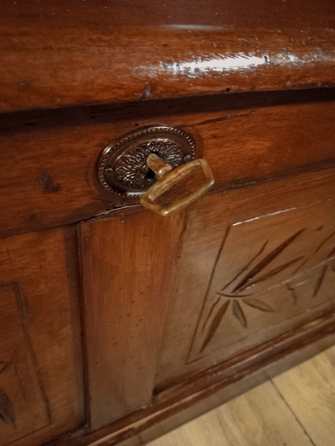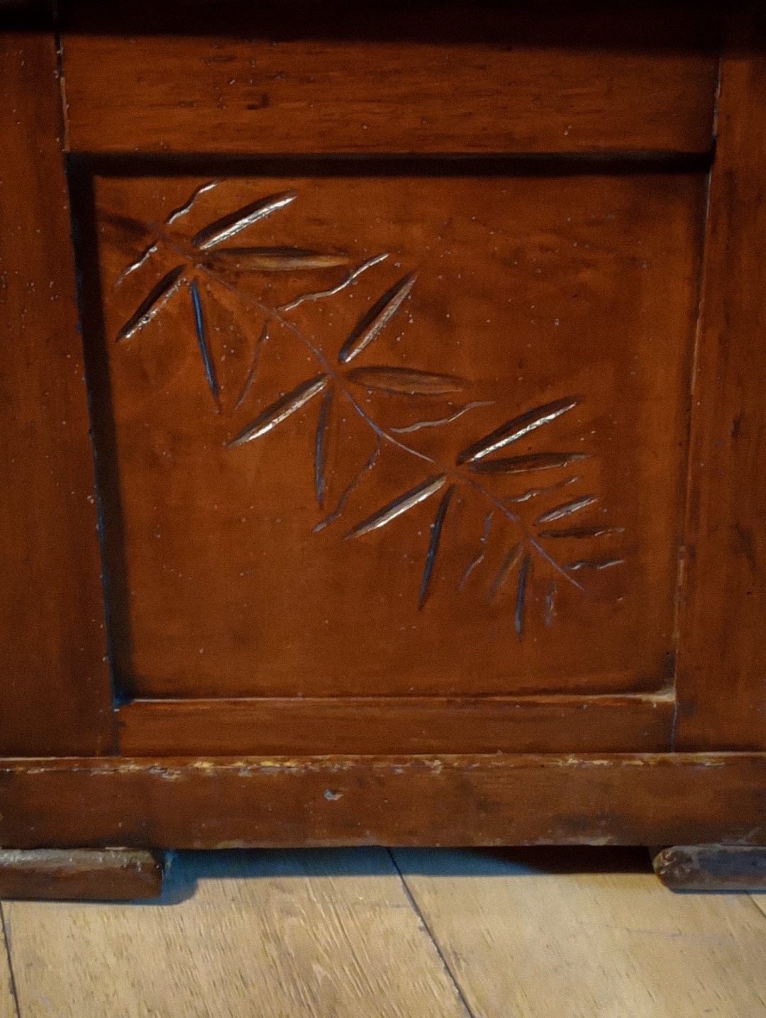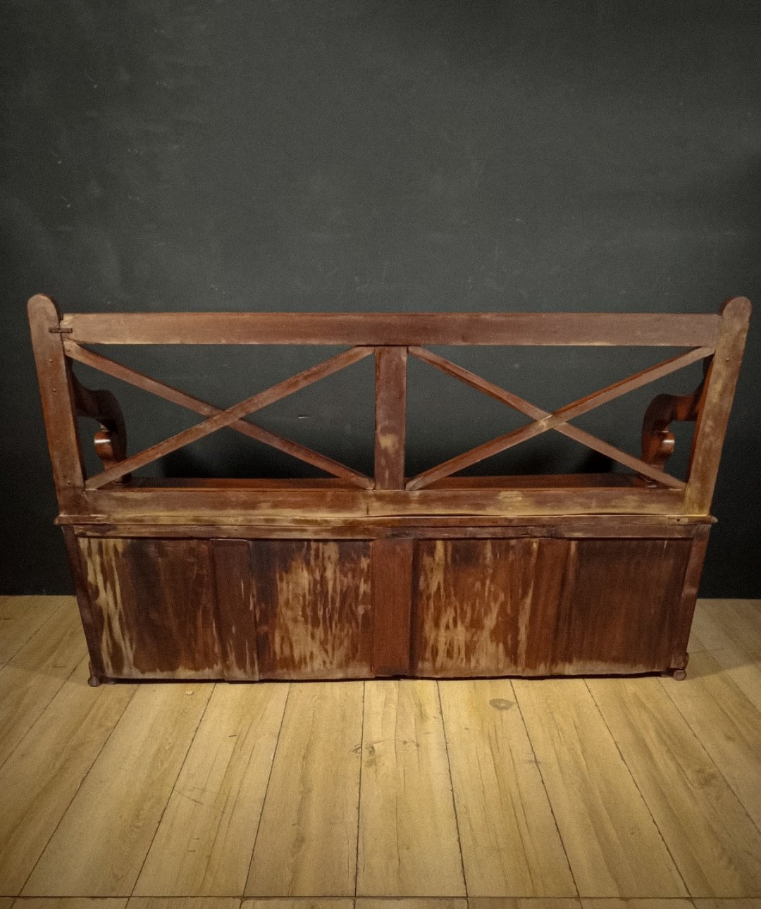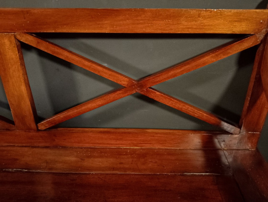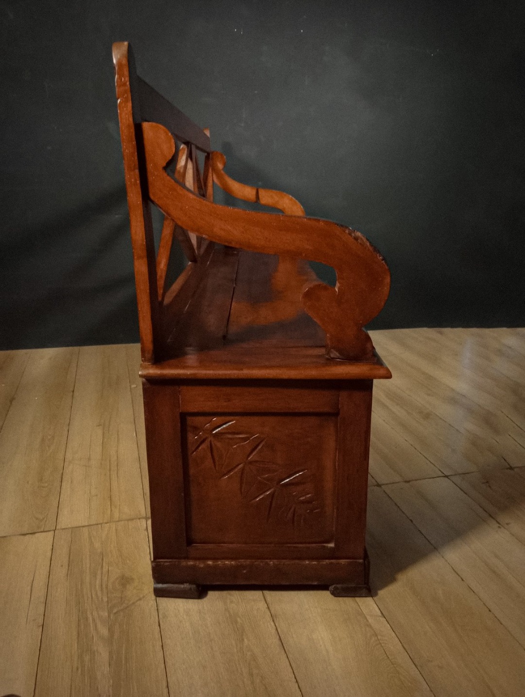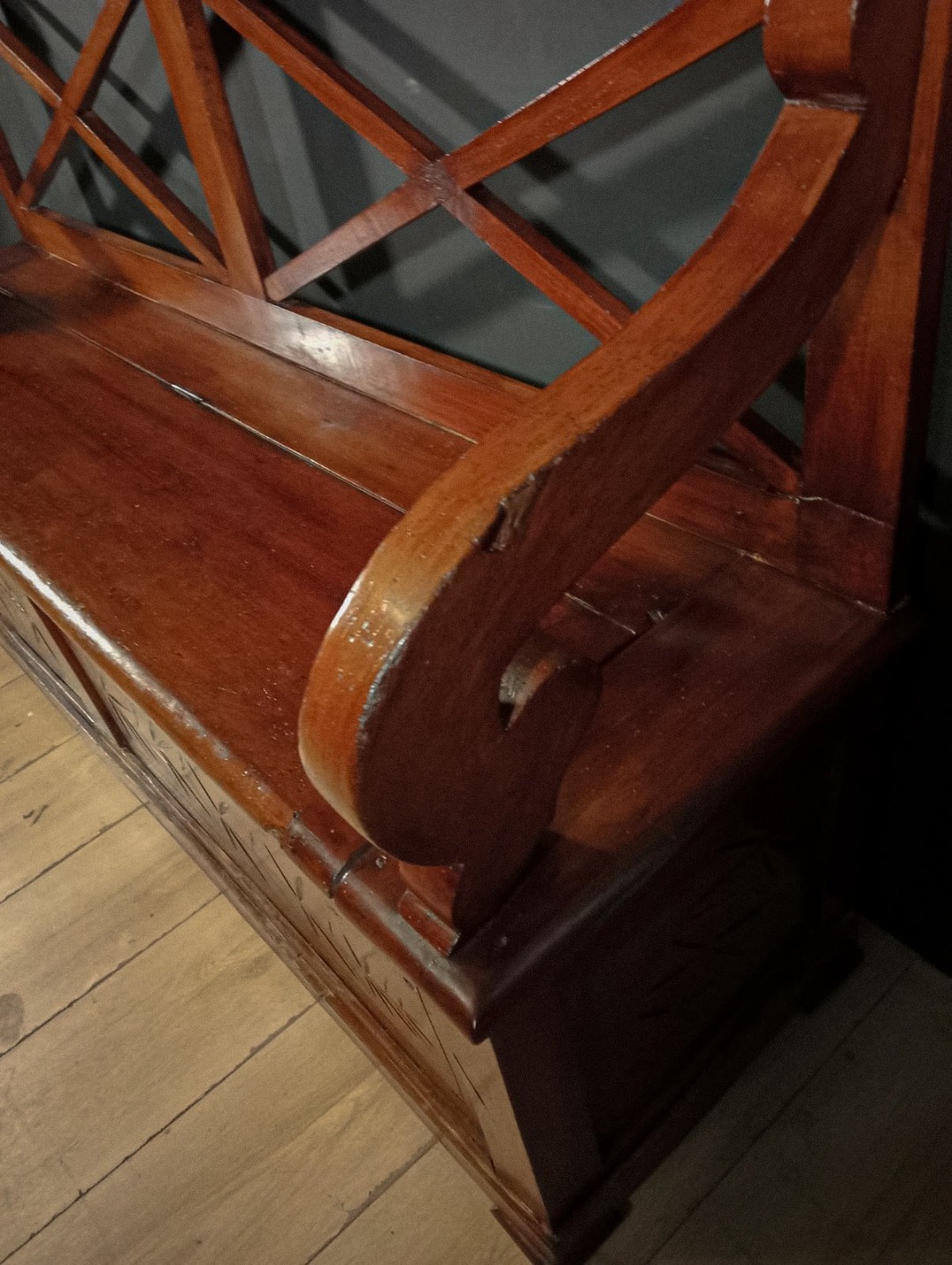 Antica cassapanca con schienale, in legno massello di noce, epoca Ottocento, con seduta apribile e decoro inciso a motivi stilizzati sul fronte, schienale a crociera e braccioli sagomati, solida e decorativa, perfetta per ingressi o ambienti rustico-eleganti
