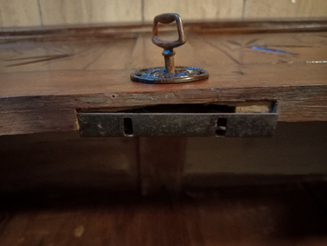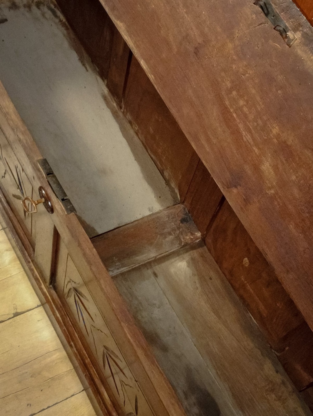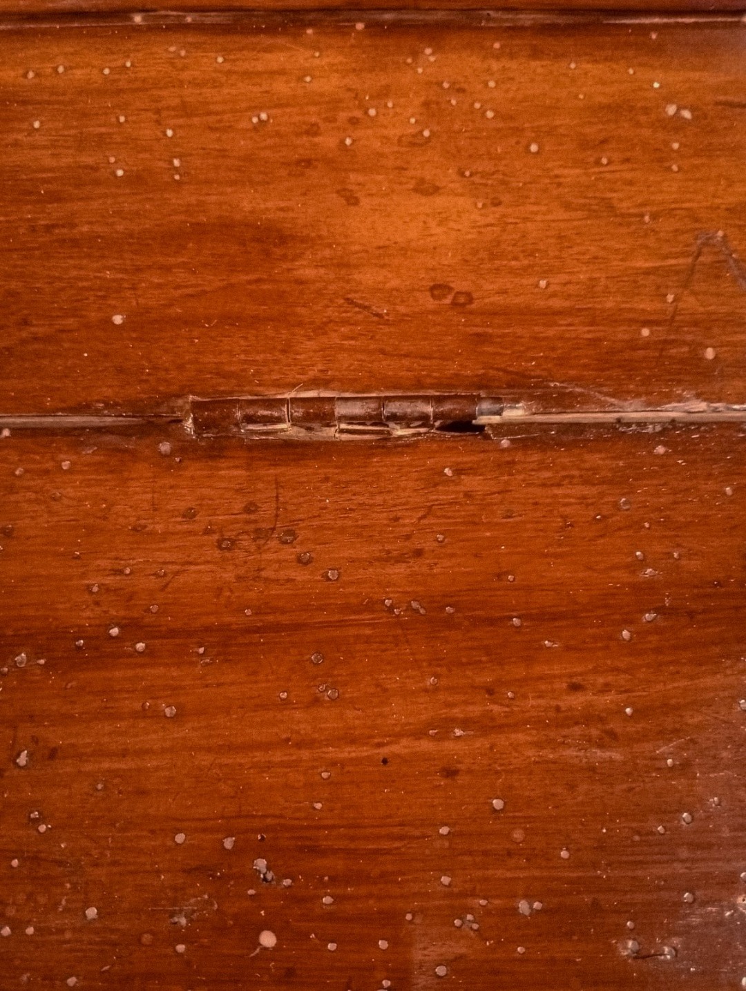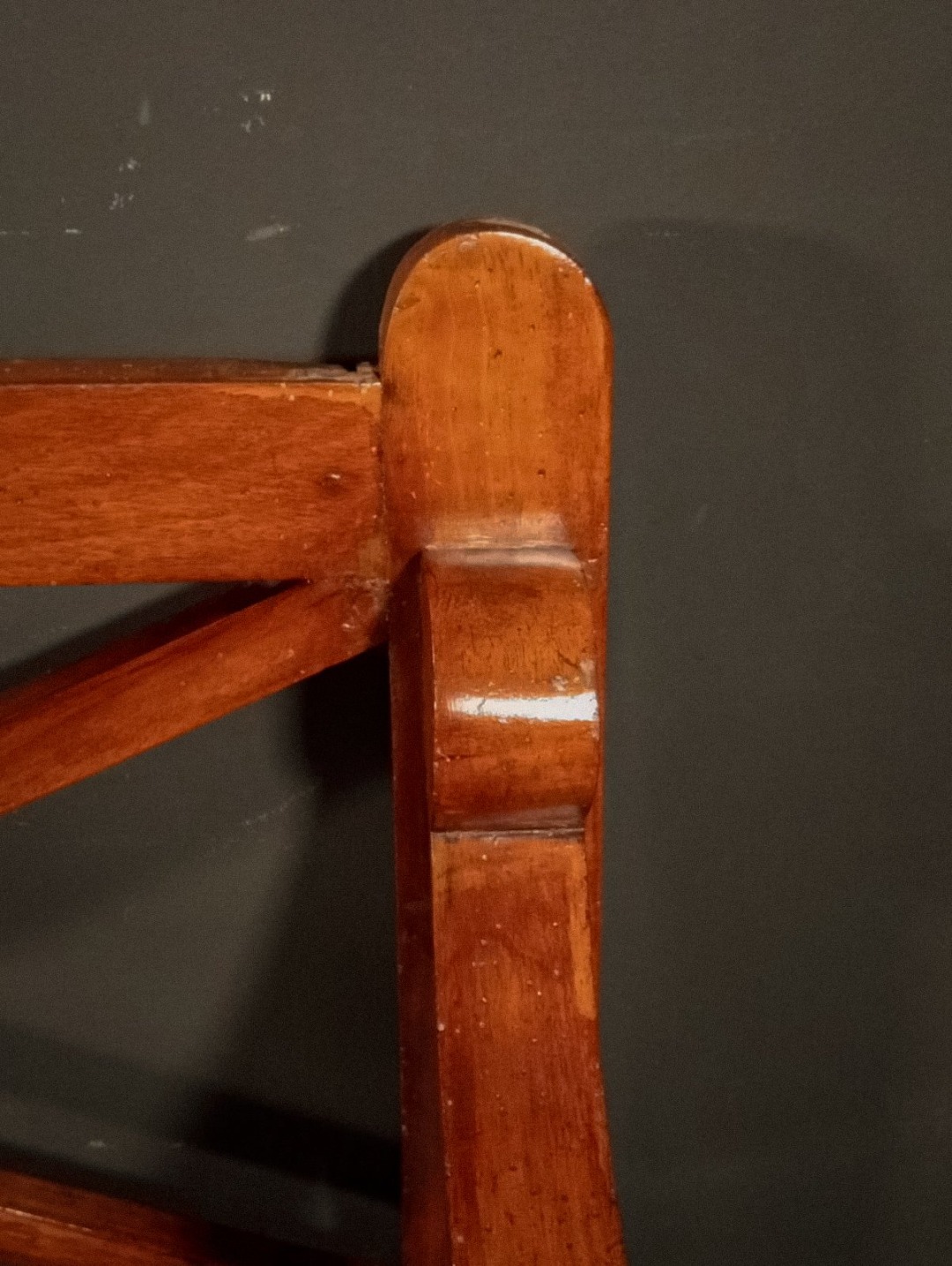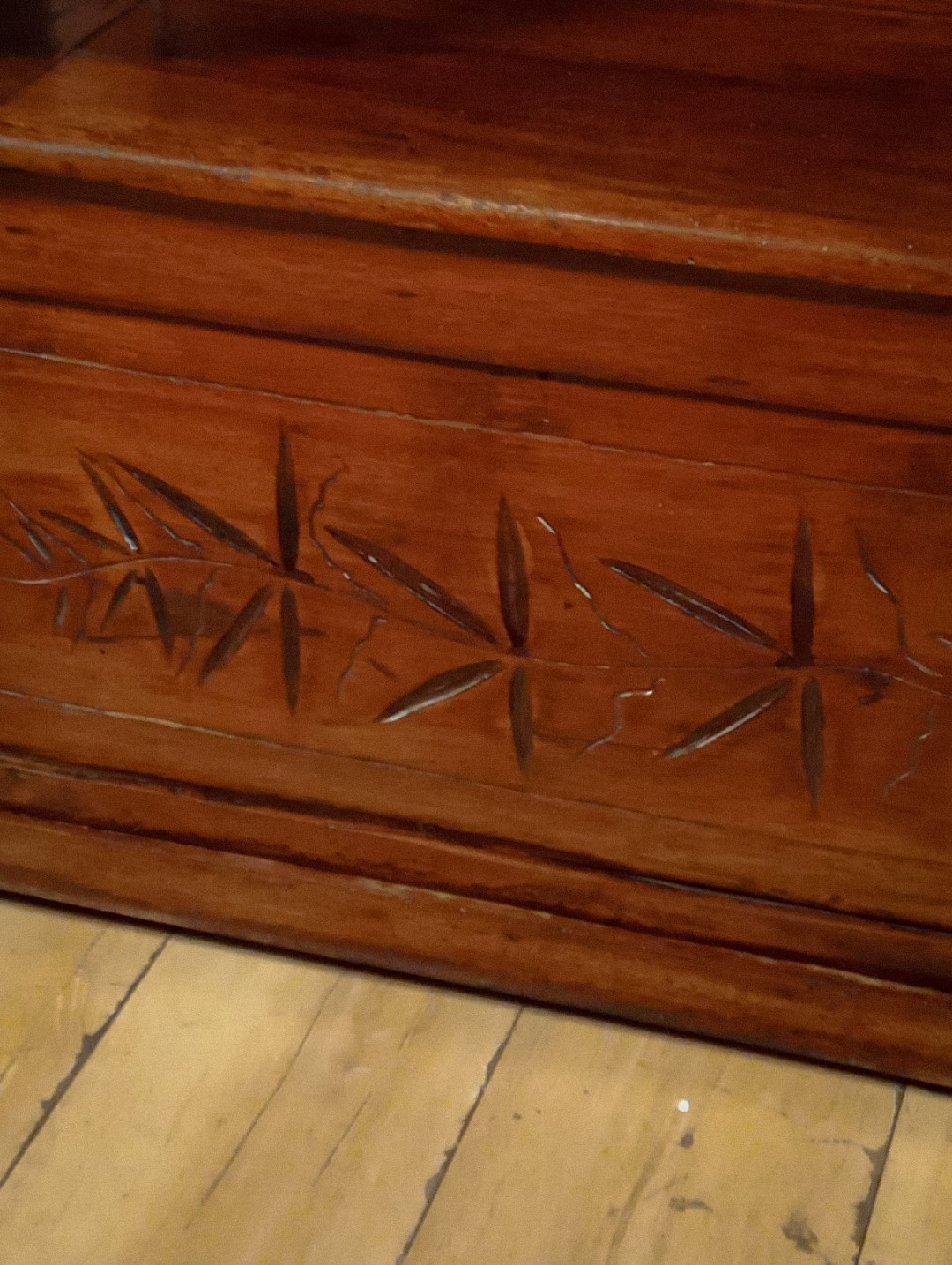Antica cassapanca con schienale, in legno massello di noce, epoca Ottocento, con seduta apribile e decoro inciso a motivi stilizzati sul fronte, schienale a crociera e braccioli sagomati, solida e decorativa, perfetta per ingressi o ambienti rustico-eleganti