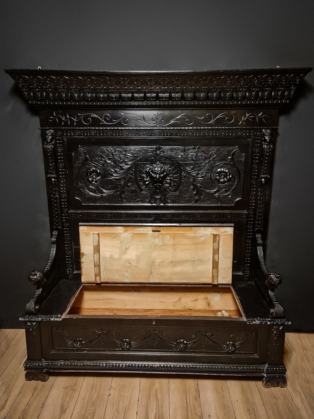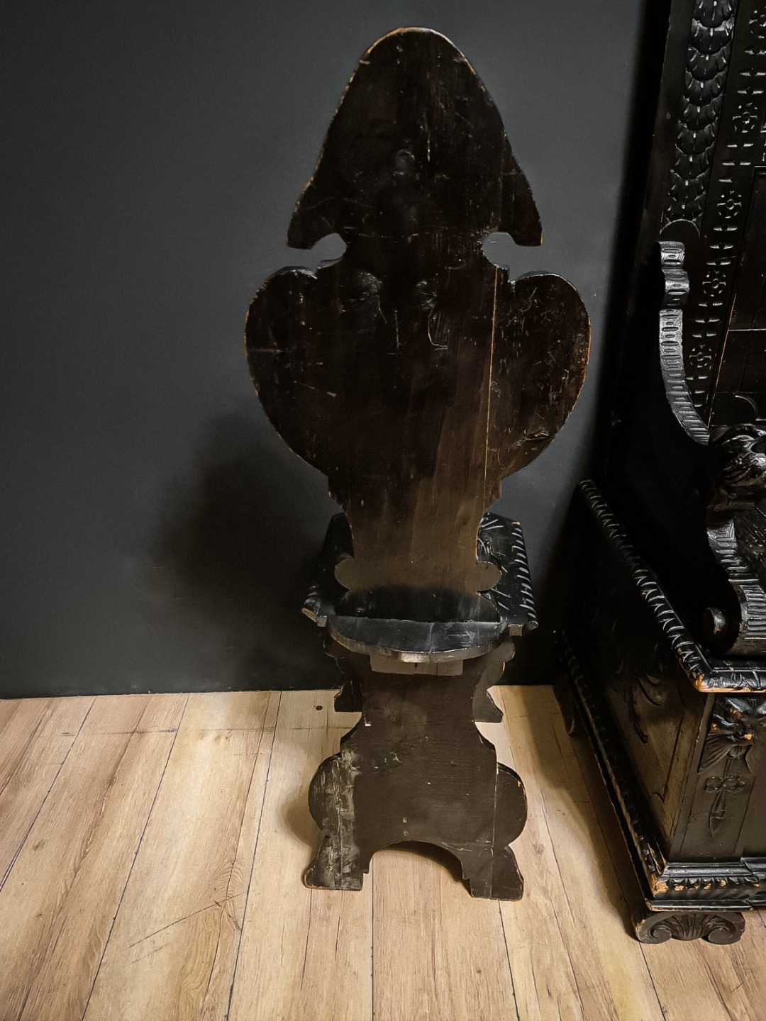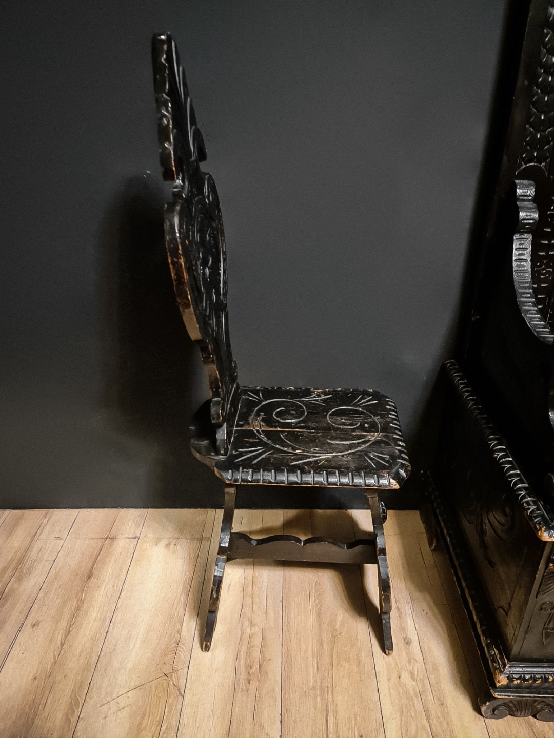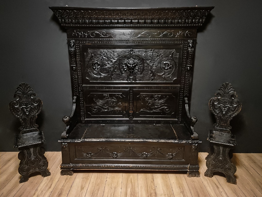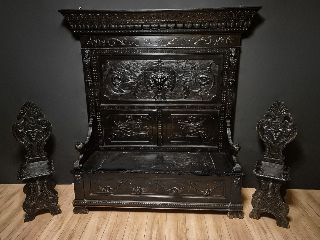 Antica e maestosa cassapanca con le due sedie in legno di noce ebanizzato in stile Rinascimentale, Epoca inizio XX Secolo.