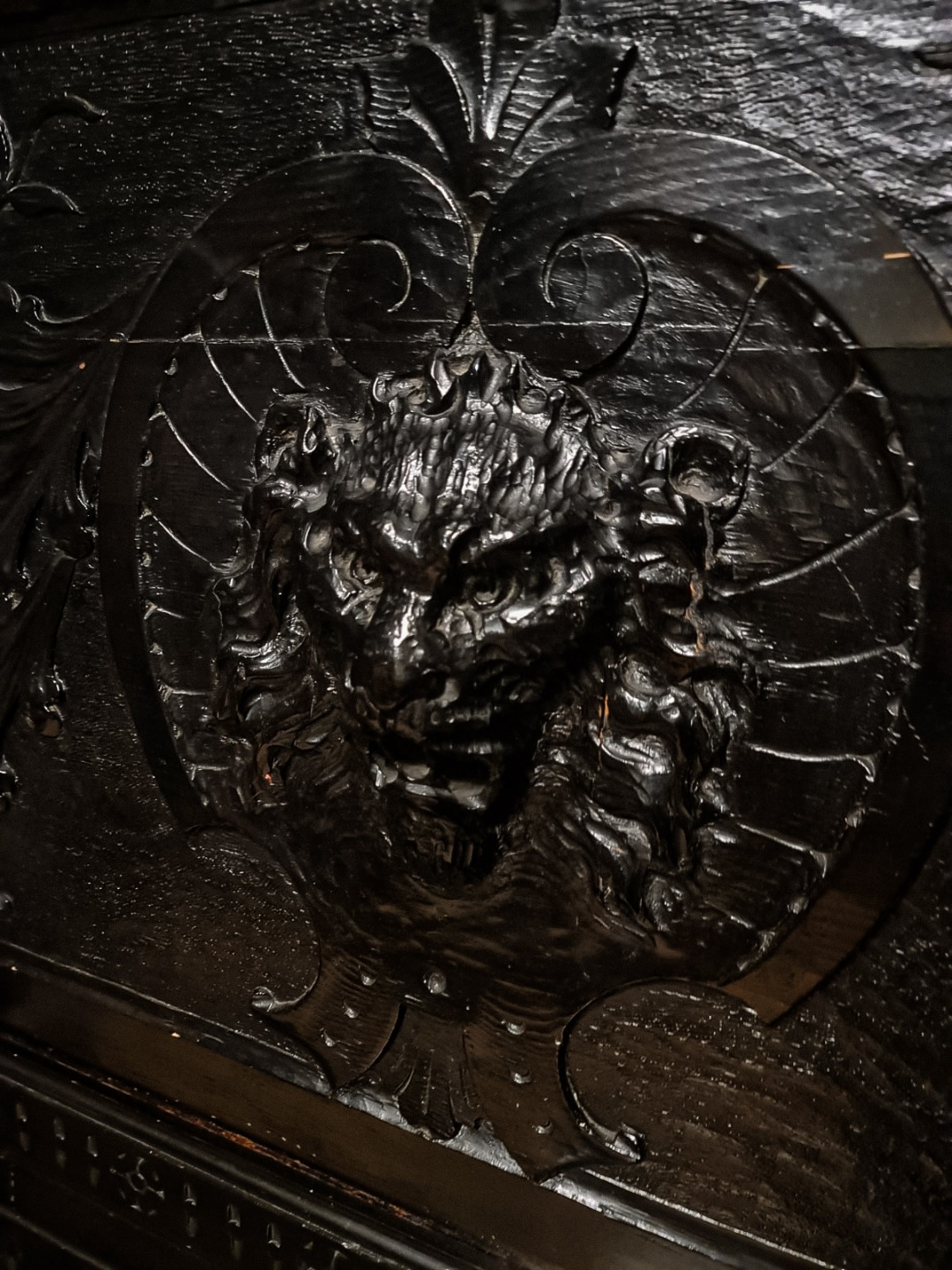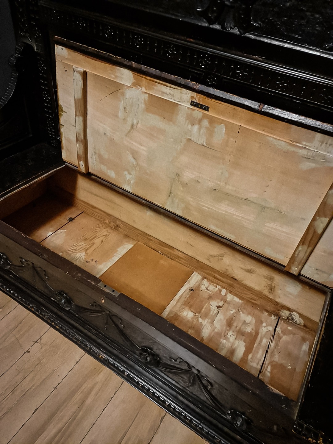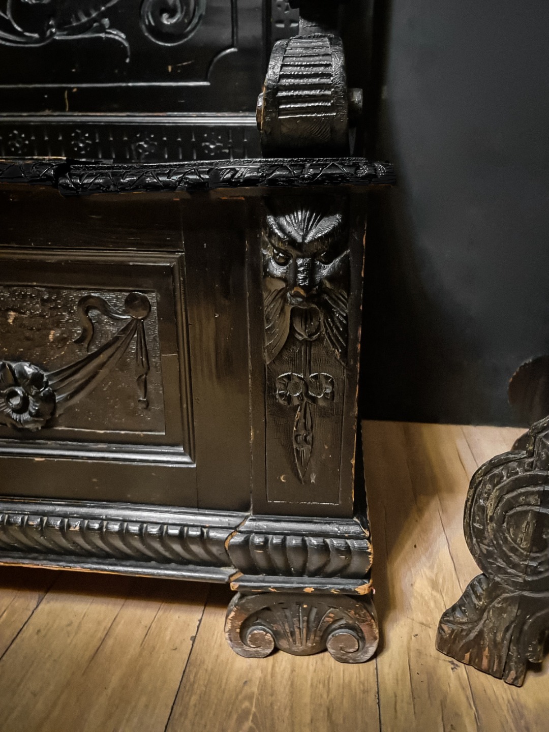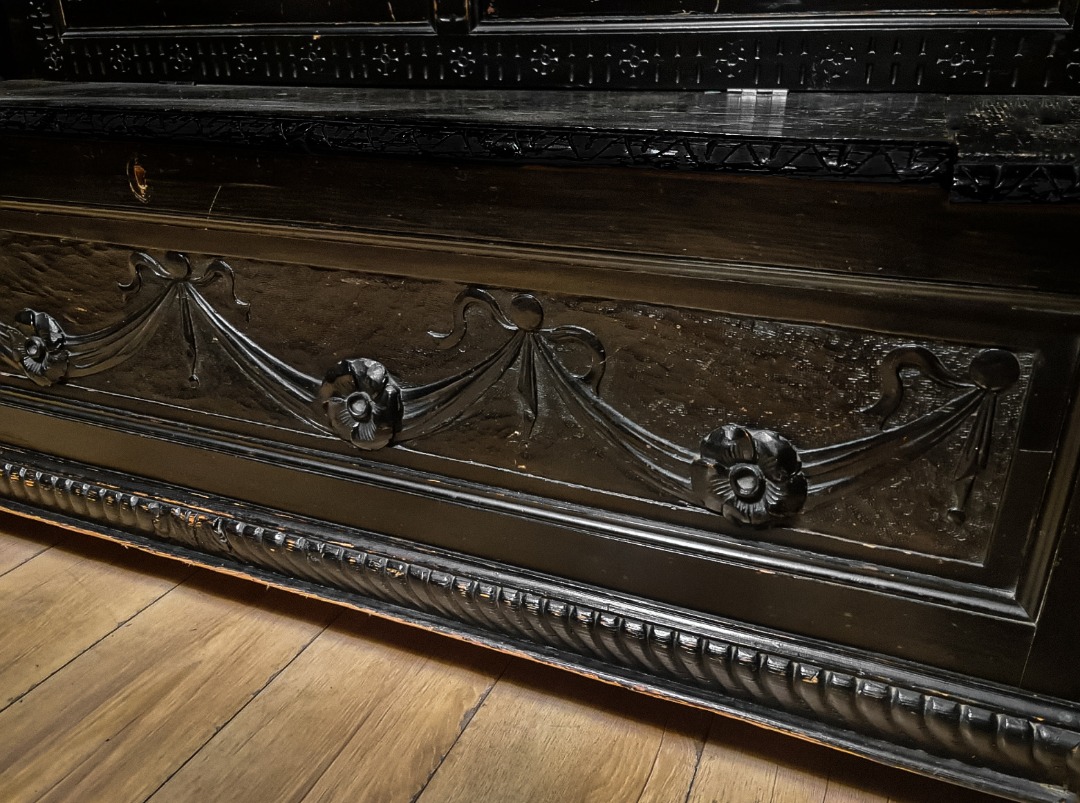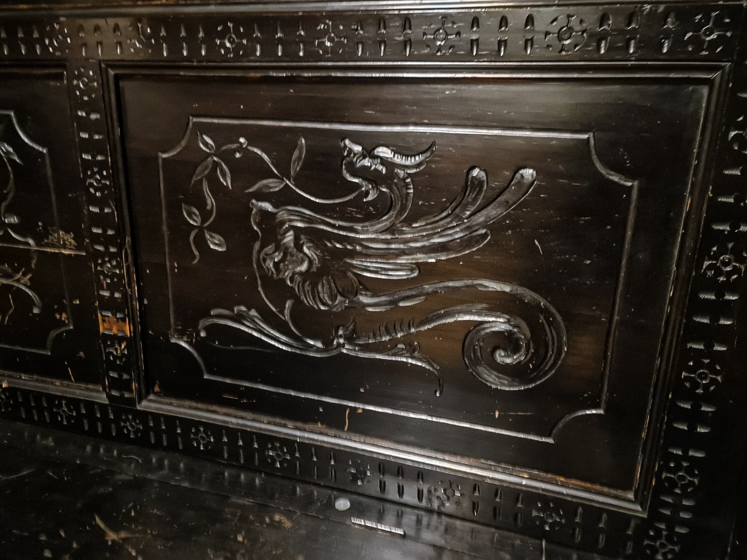 Antica e maestosa cassapanca con le due sedie in legno di noce ebanizzato in stile Rinascimentale, Epoca inizio XX Secolo.