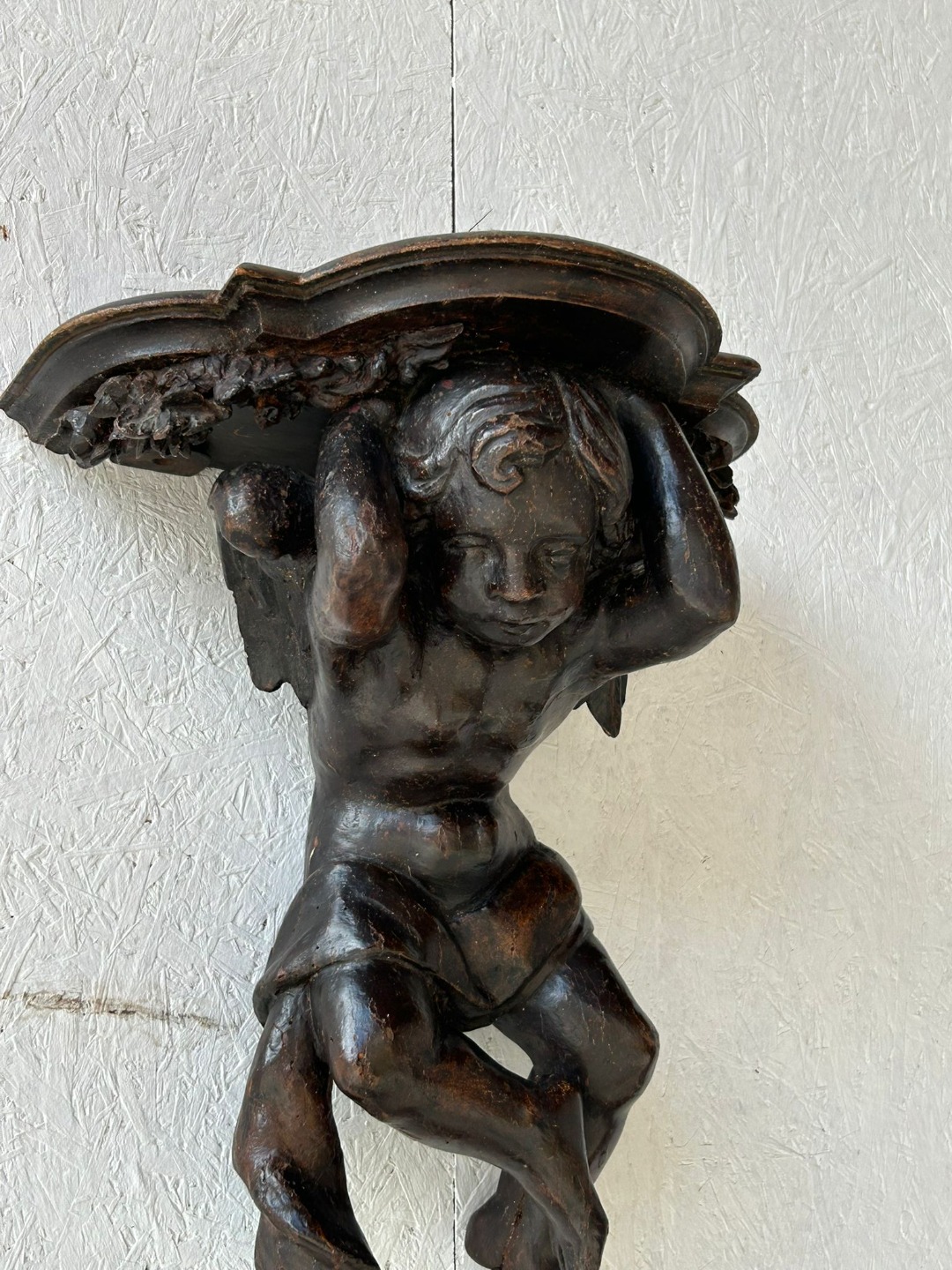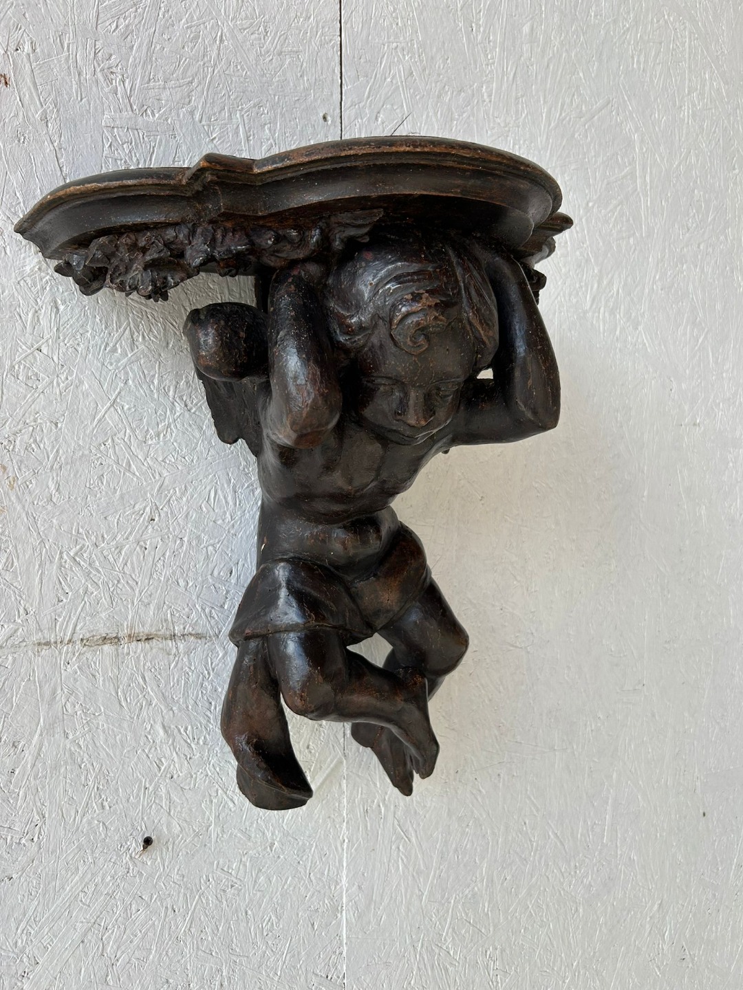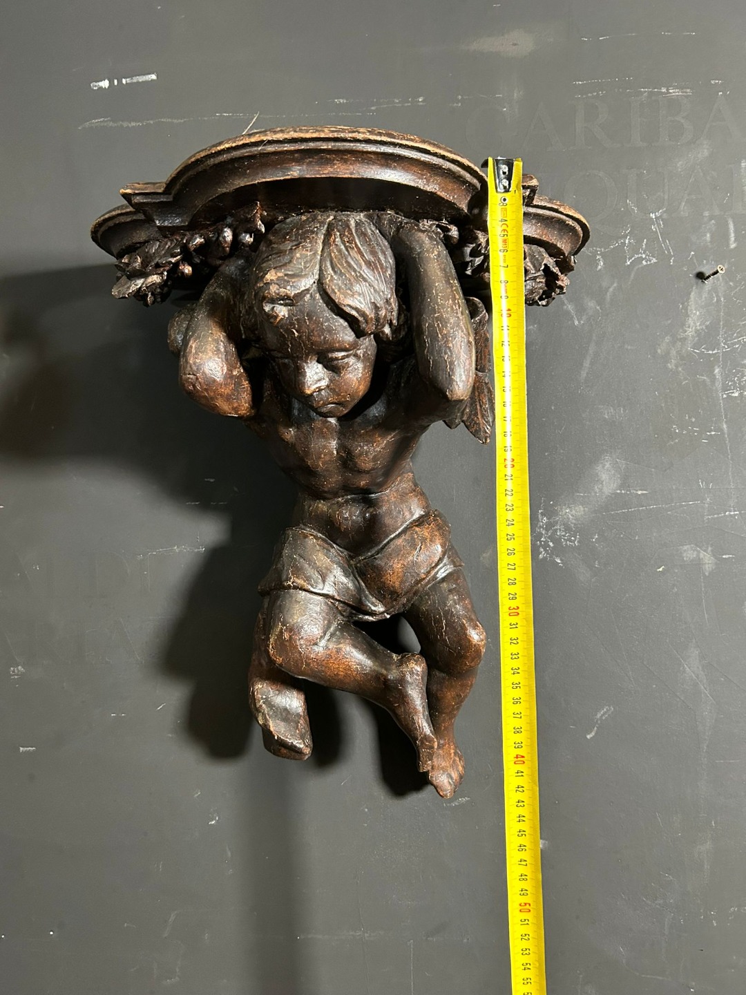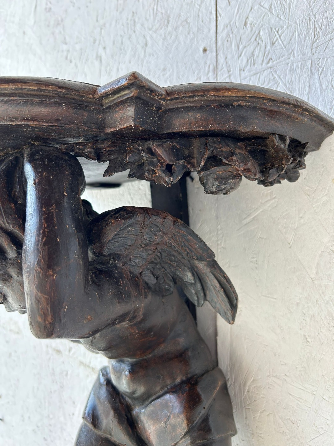 Antica mensola in legno scolpito, raffigurante un putto alato che sorregge il piano superiore, realizzata in noce massello.