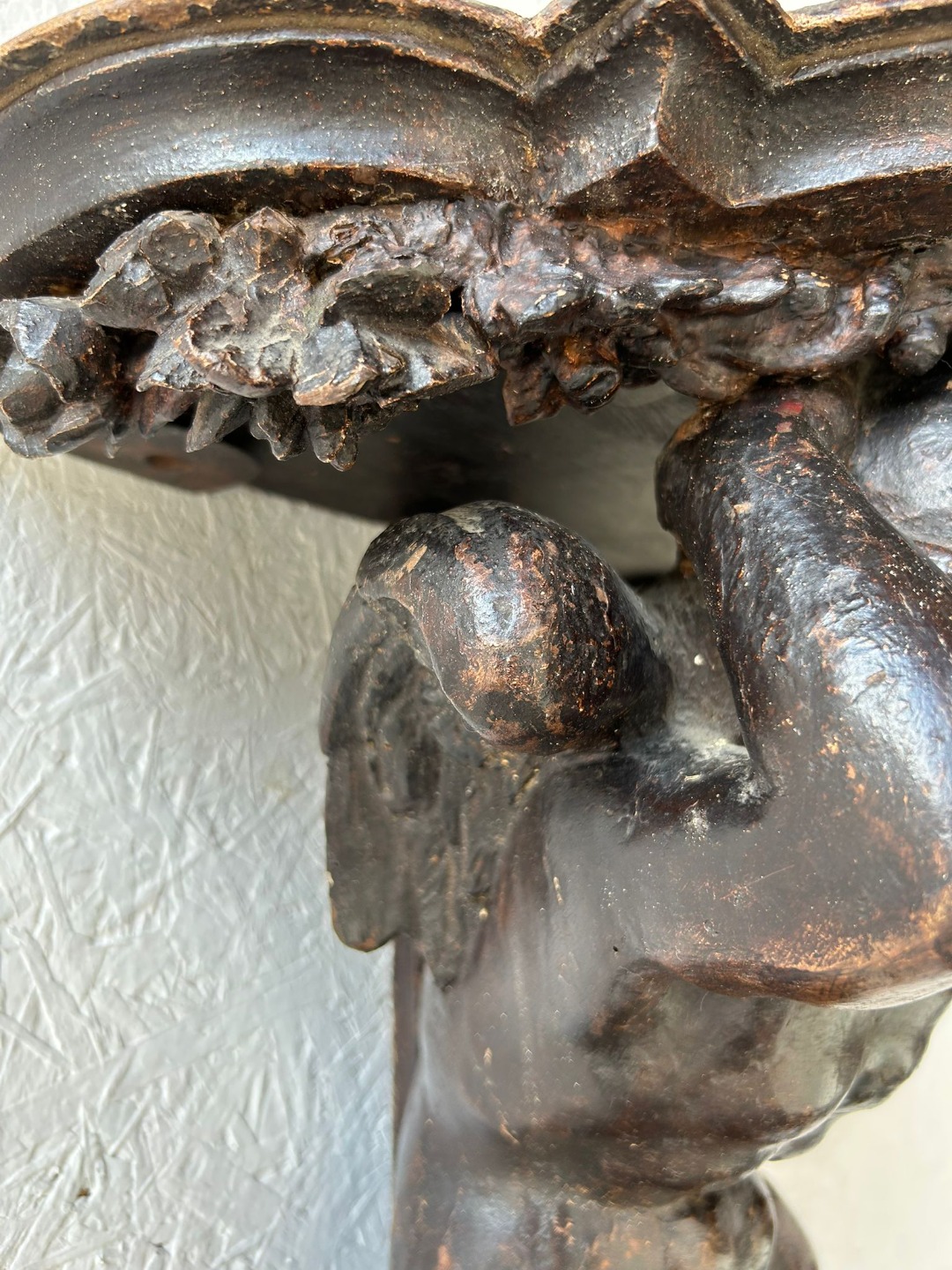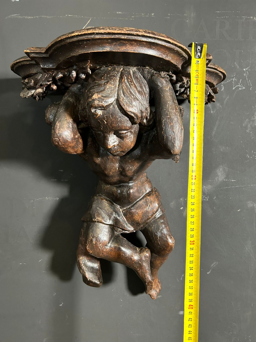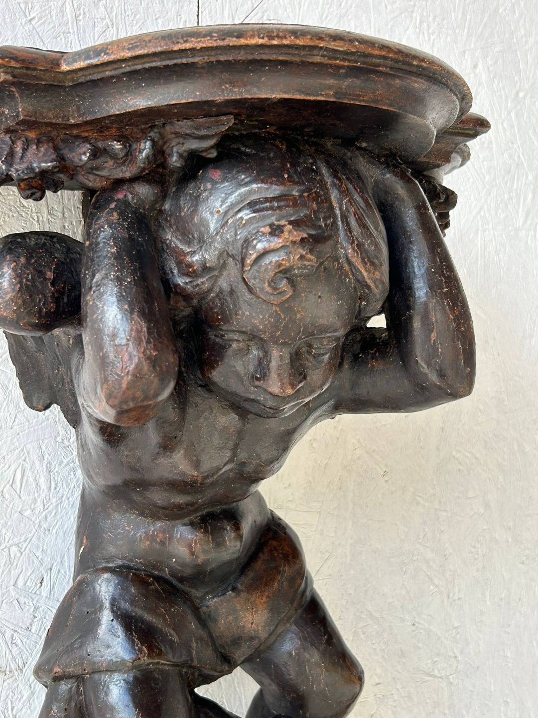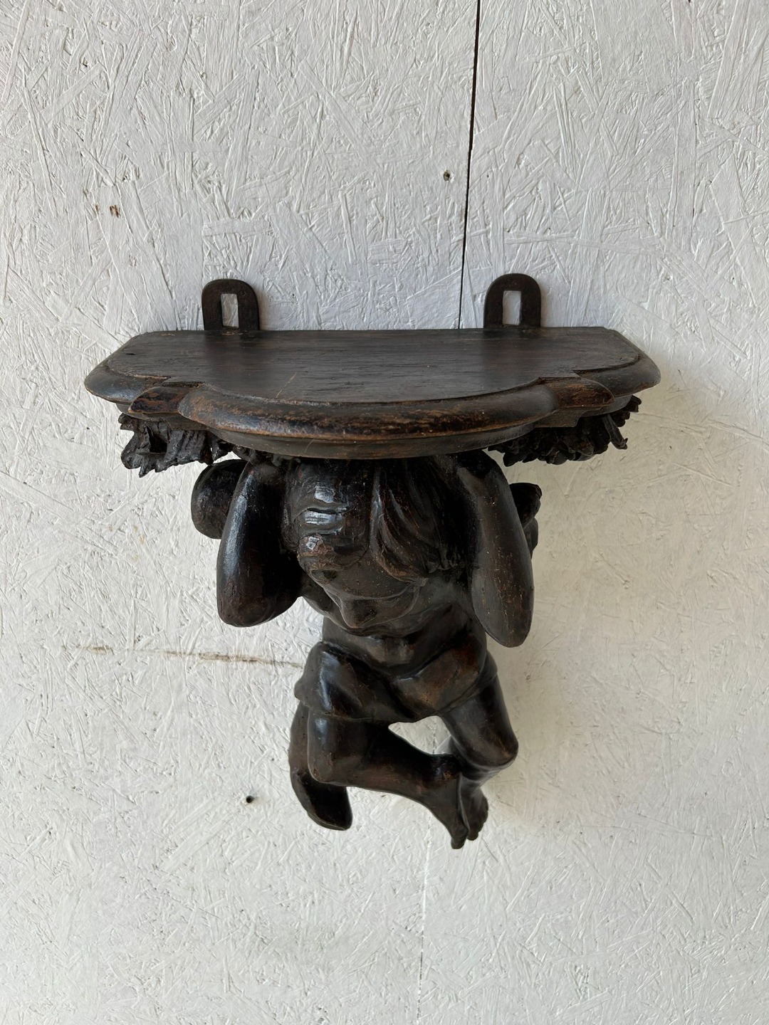 Antica mensola in legno scolpito, raffigurante un putto alato che sorregge il piano superiore, realizzata in noce massello.