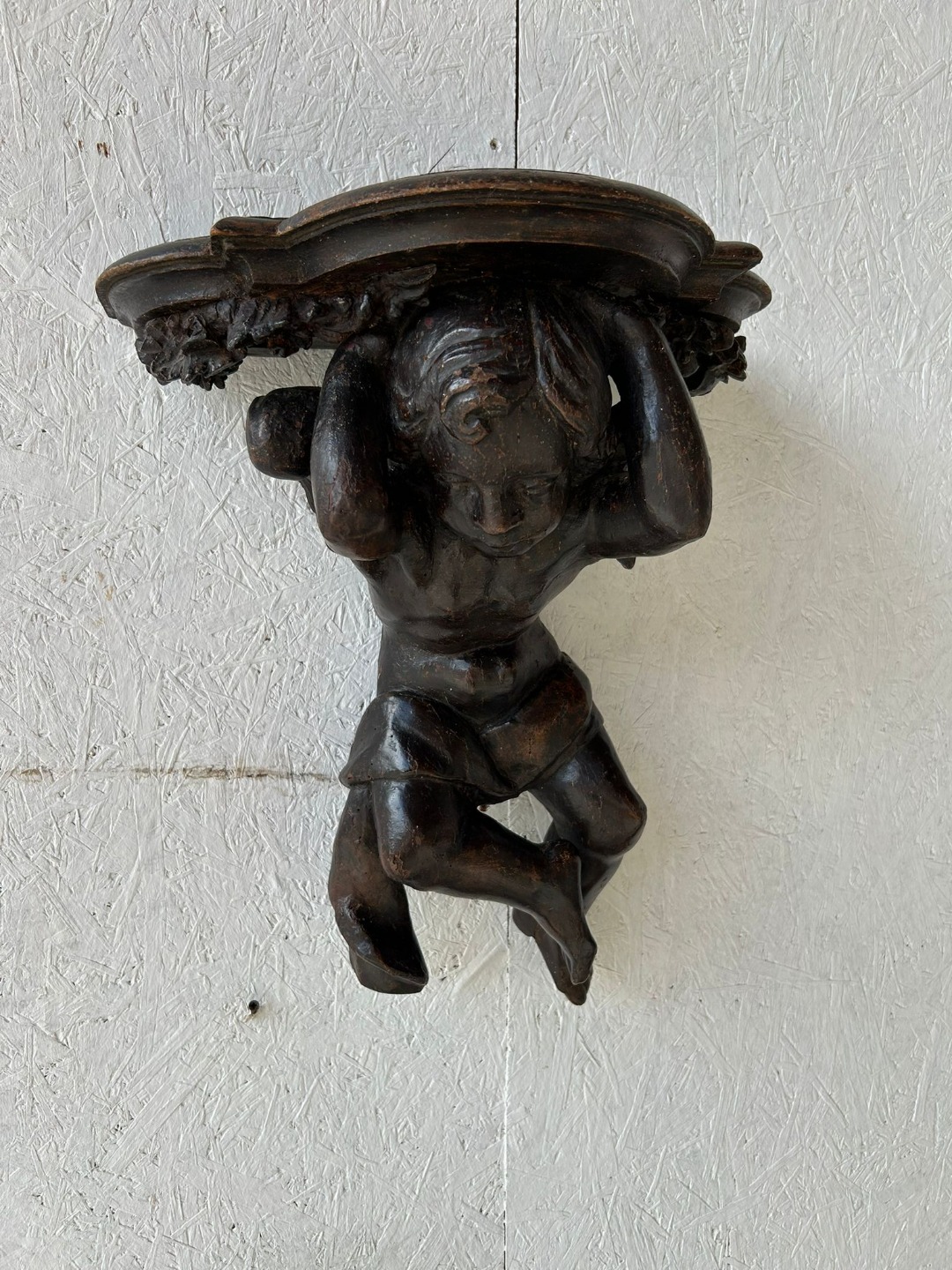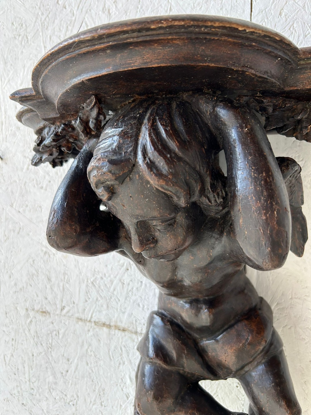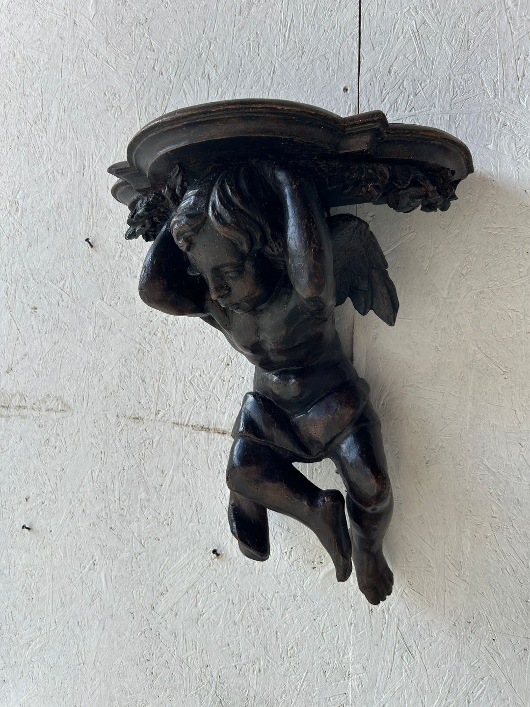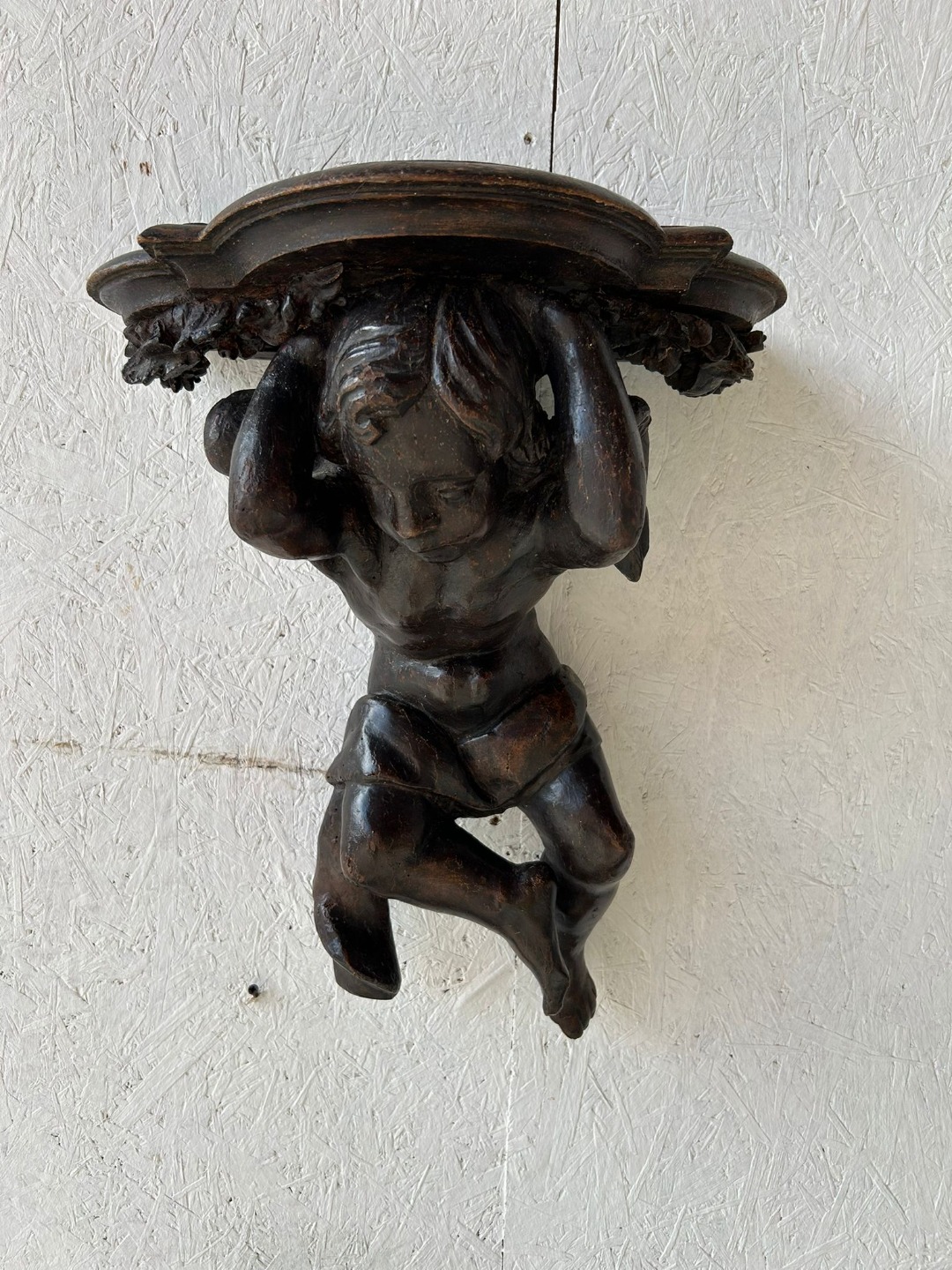 Antica mensola in legno scolpito, raffigurante un putto alato che sorregge il piano superiore, realizzata in noce massello.