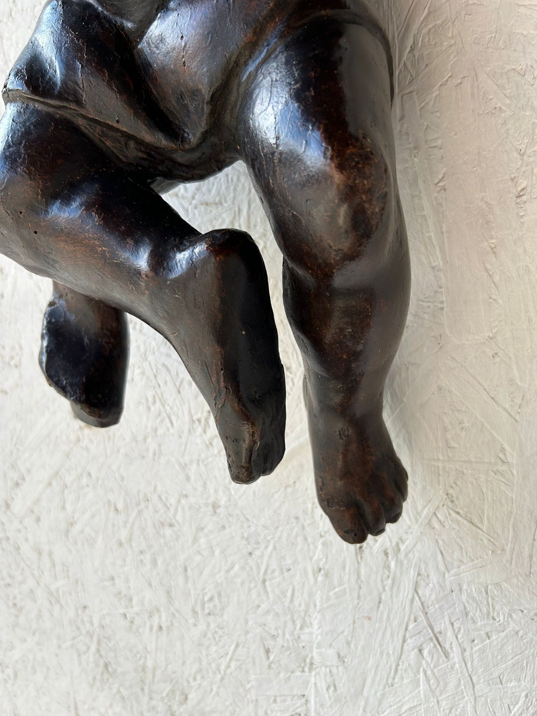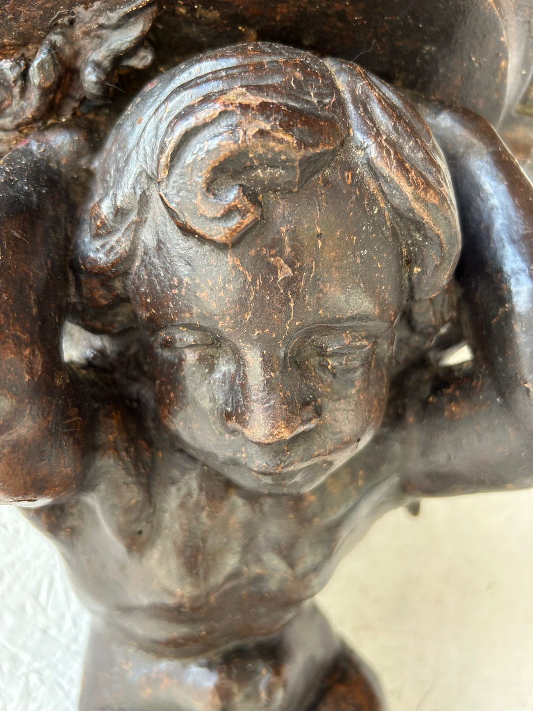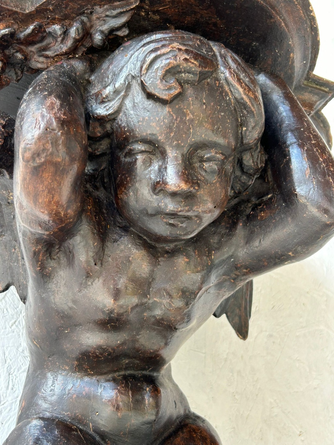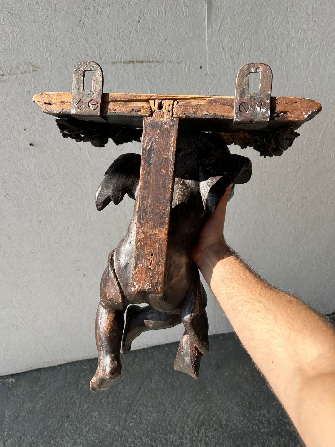 Antica mensola in legno scolpito, raffigurante un putto alato che sorregge il piano superiore, realizzata in noce massello.